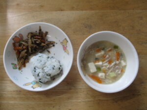 1学期最後の給食は、おにぎり、豆腐豚スープ、きんぴらごぼうでした!