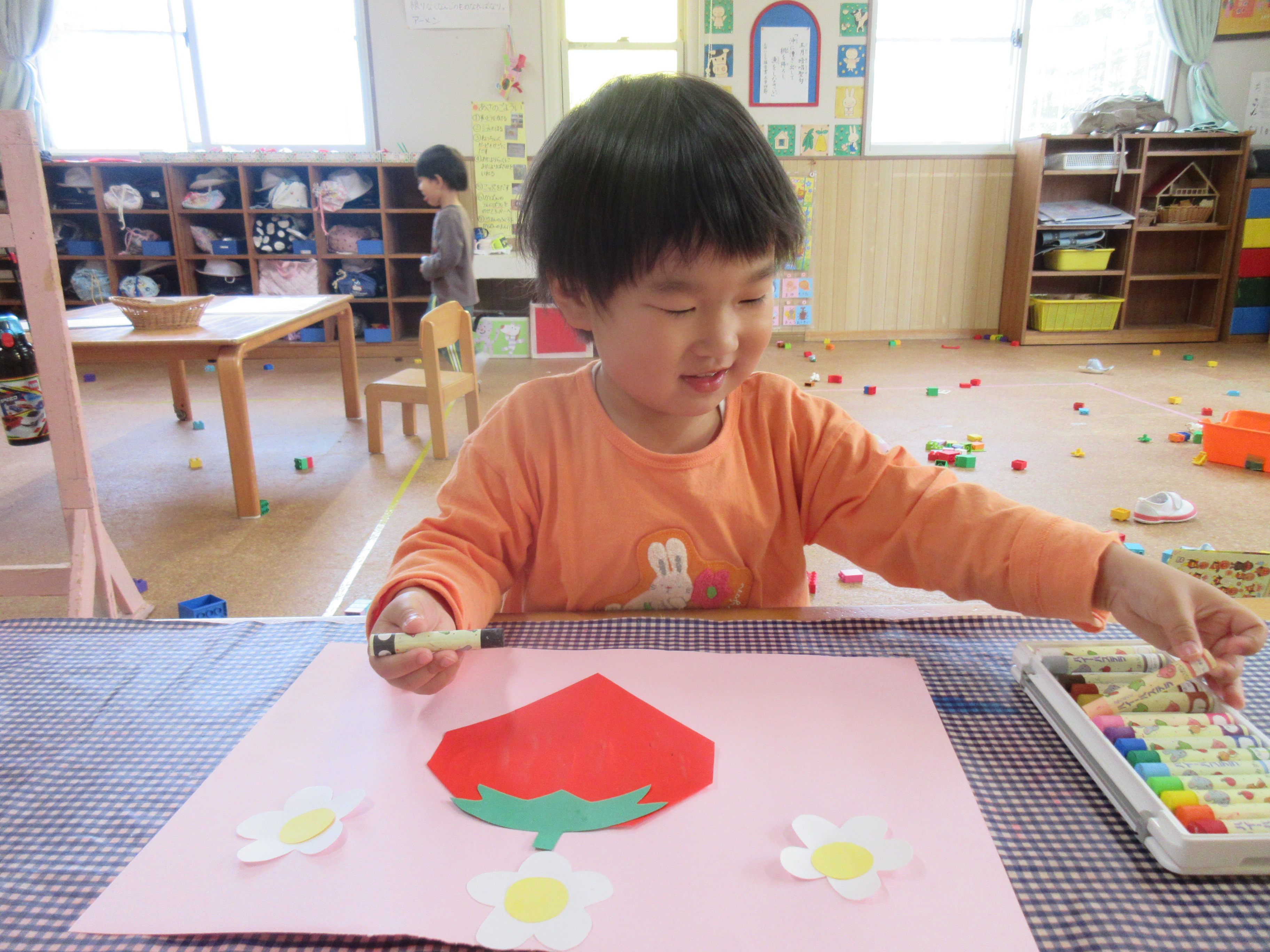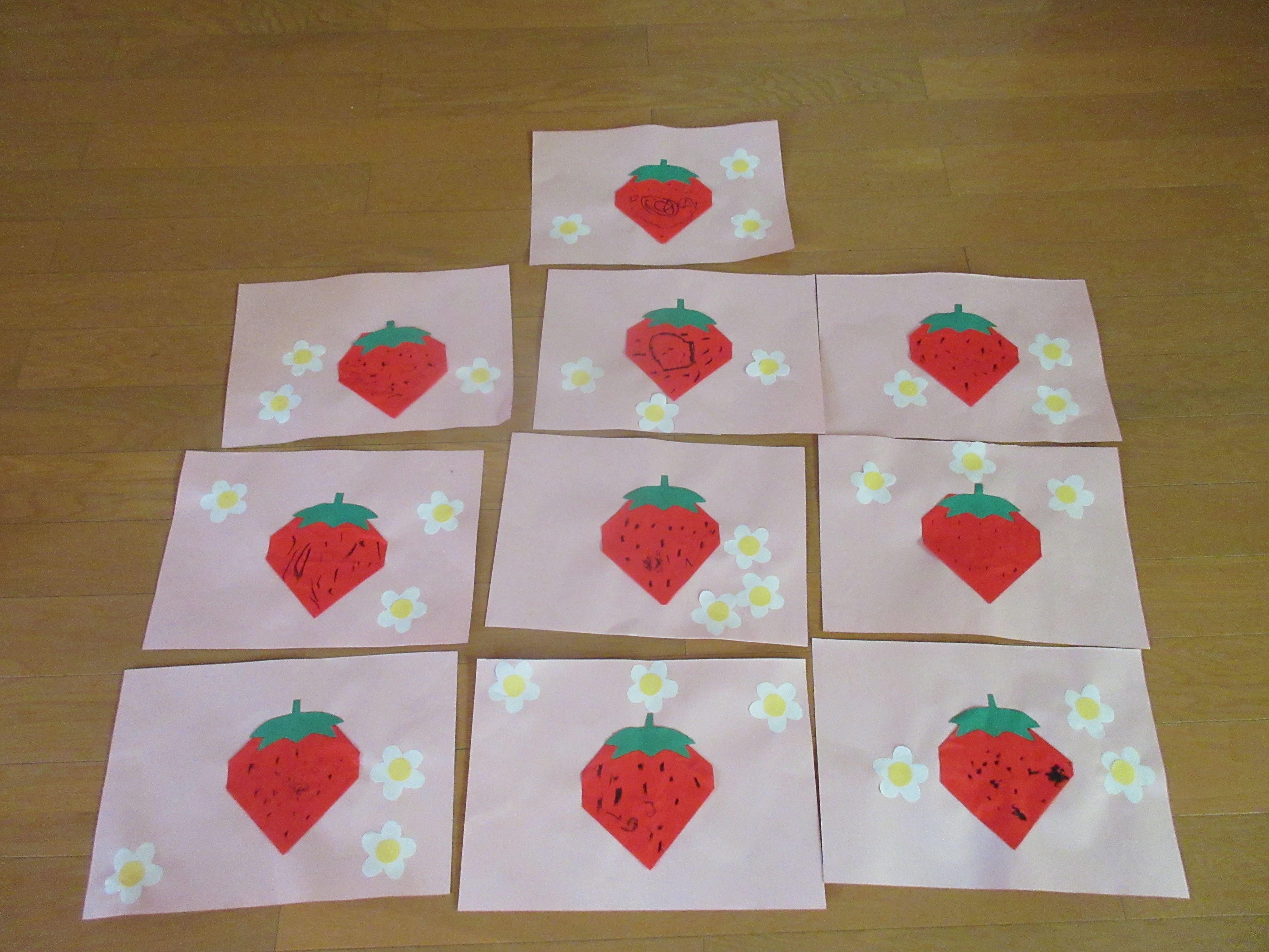 折り紙で「いちご」を折り糊を使って画用紙に貼り付けをしました(^^♪