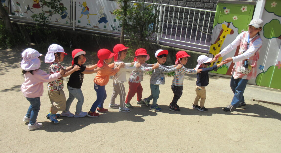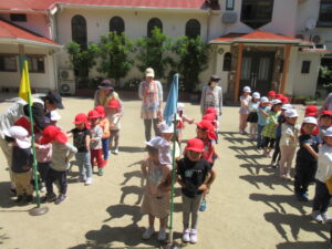 お部屋に戻るときは、行進で戻ります!ゆり組やすみれ組のかっこいい姿を見て「パチパチ~」と拍手をするたんぽぽ組の子どもたちでした♡