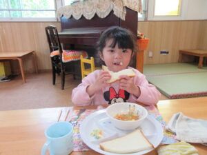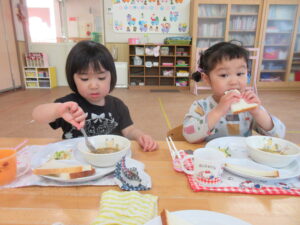 今日の給食は子どもたちが大好きな食パンで「やったぁ~」と嬉しそうな姿が見られました☺