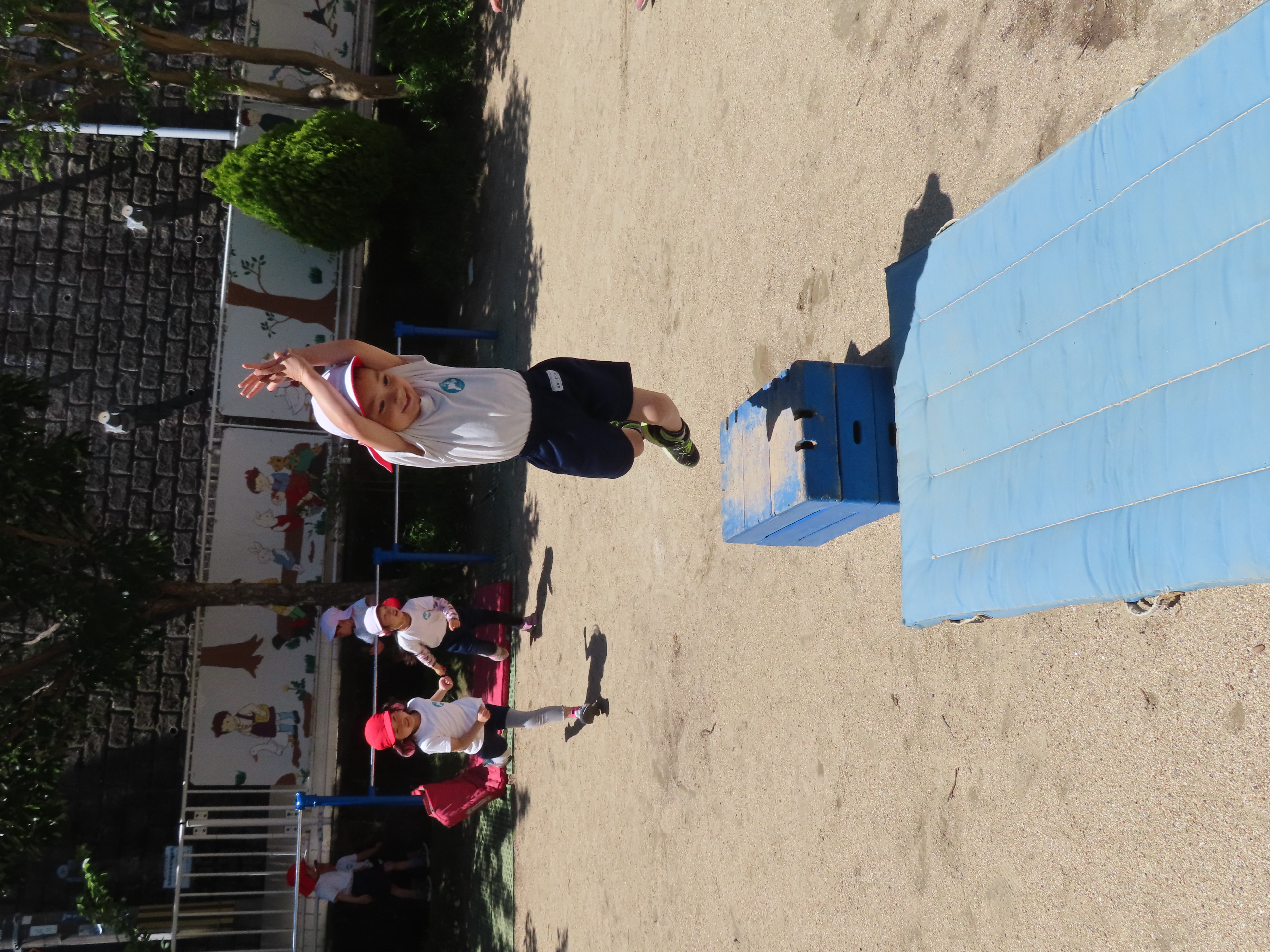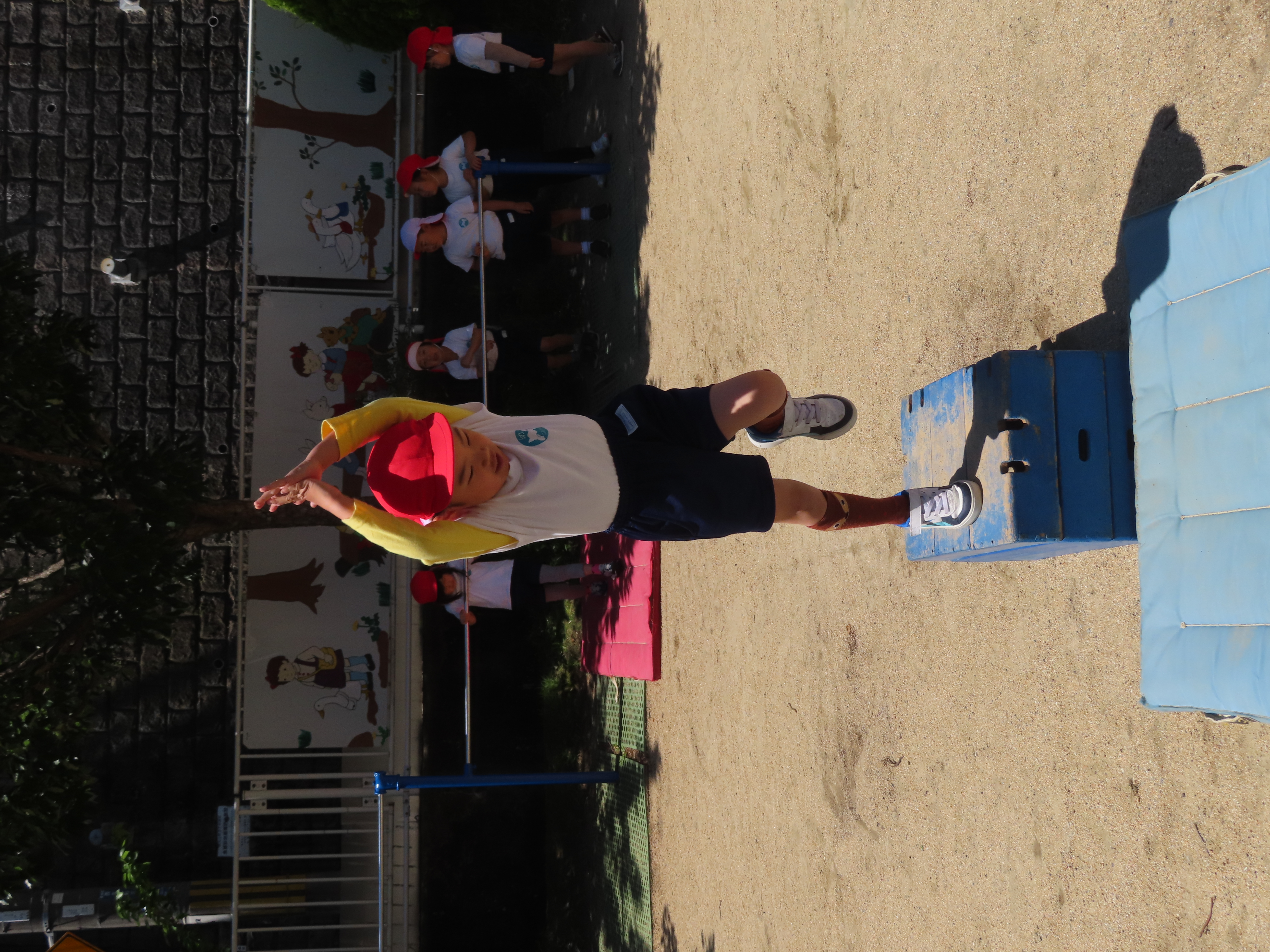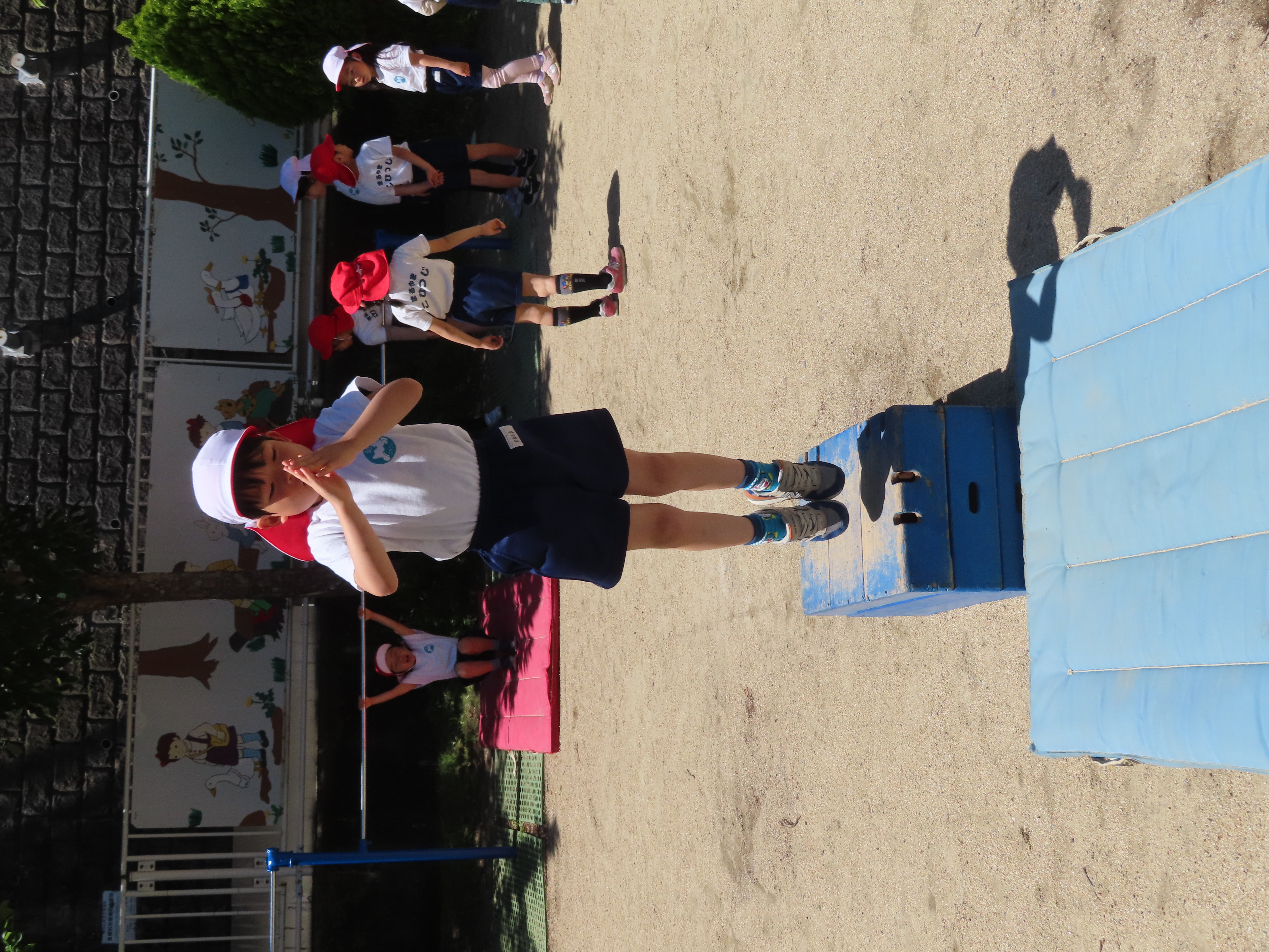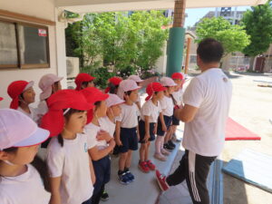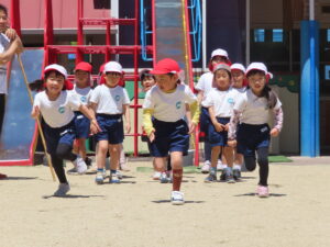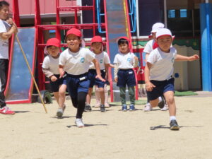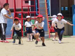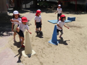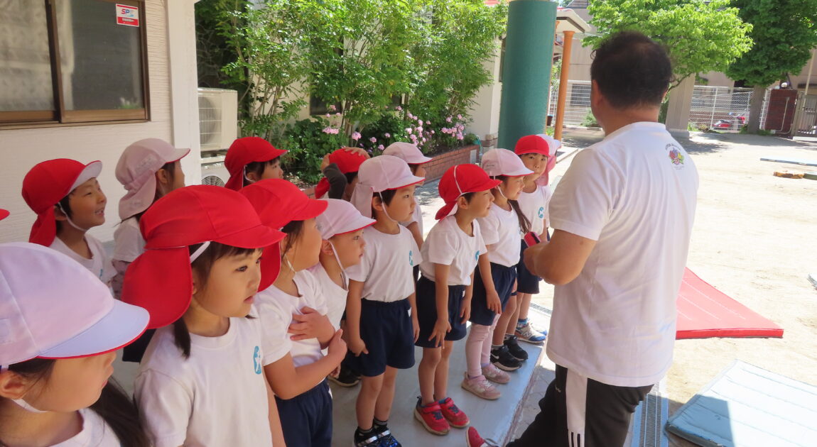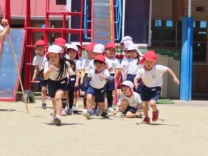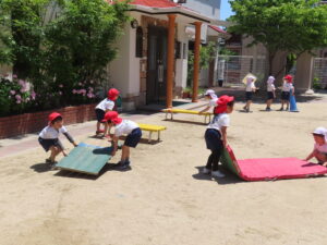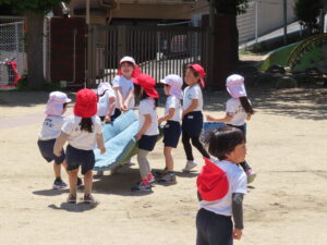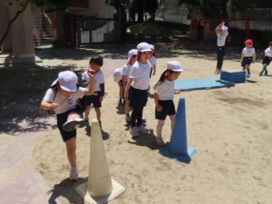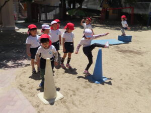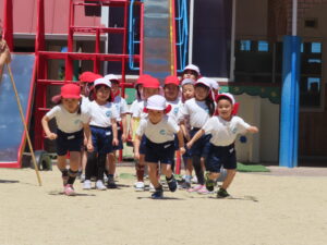 先日の体育あそびは、いいお天気の中、園庭で思いっきり身体を動かすことができました。
