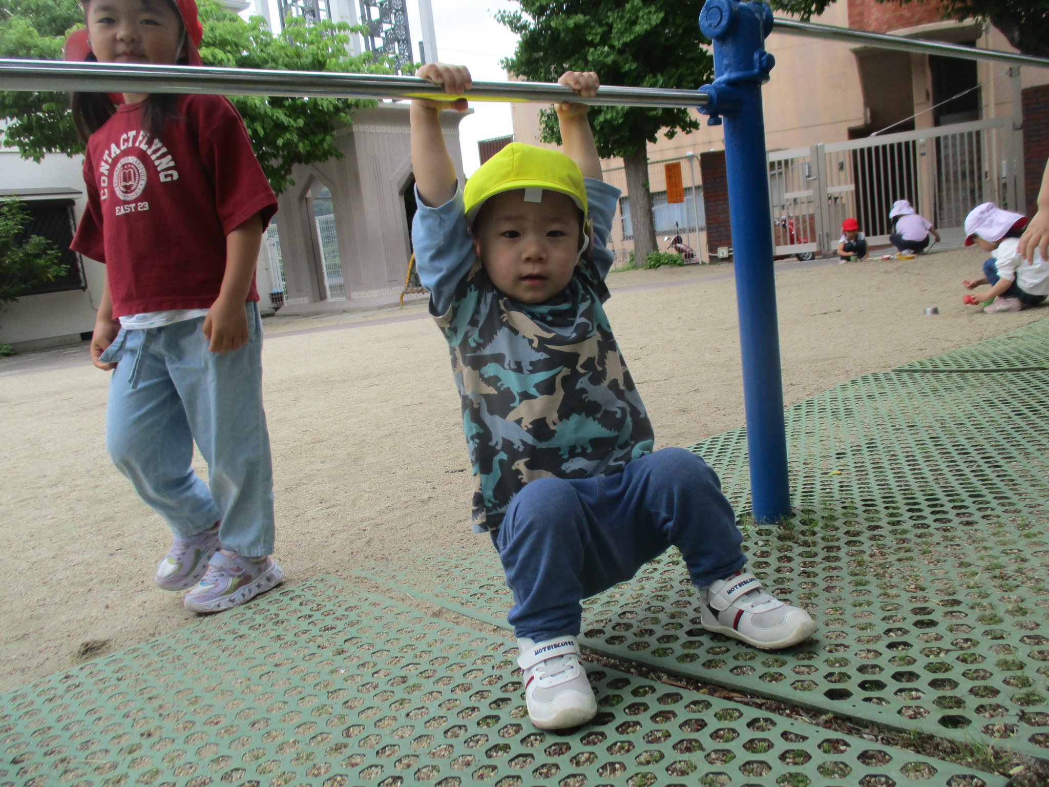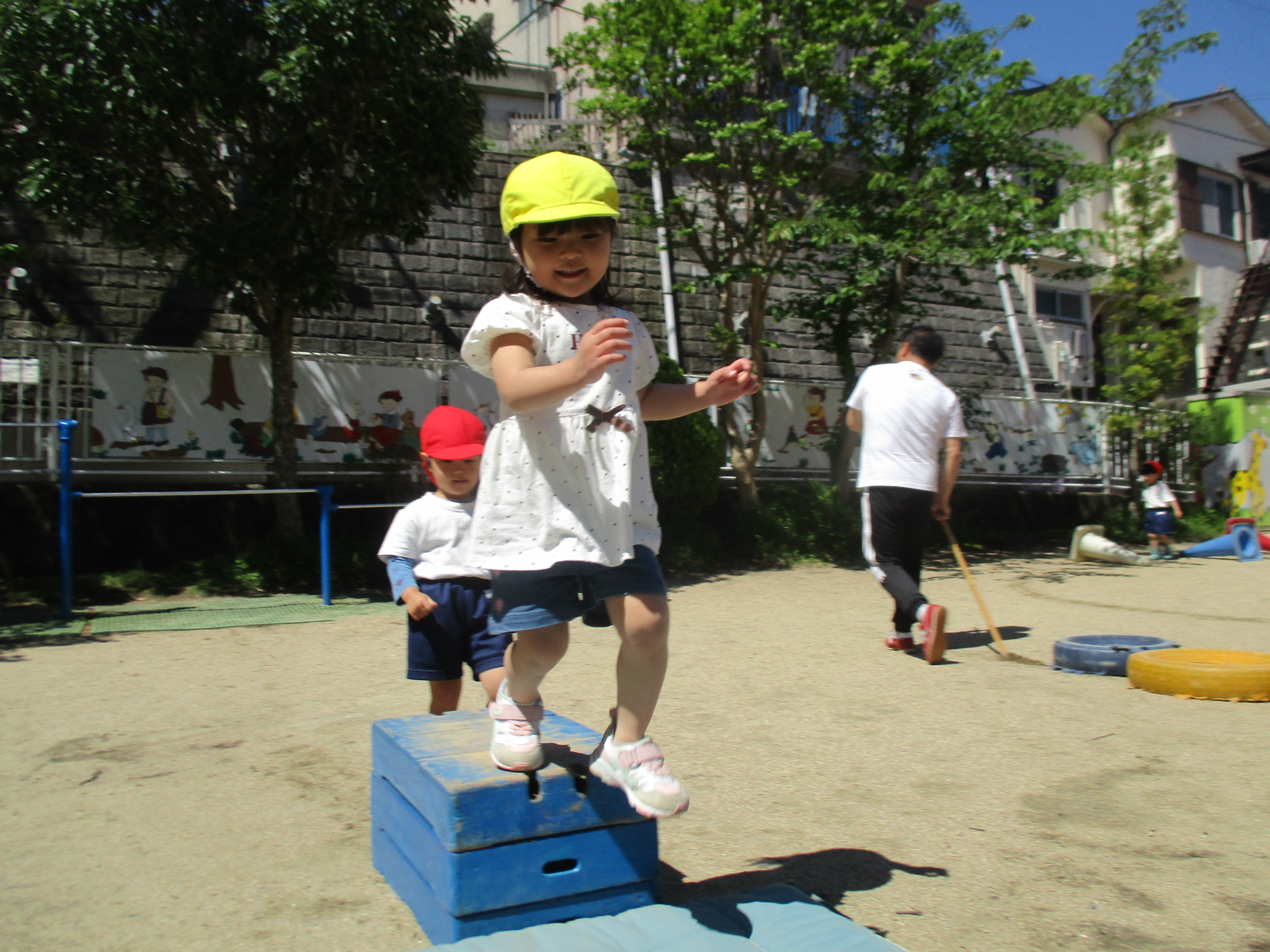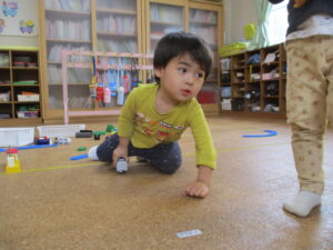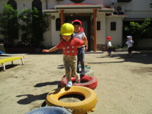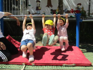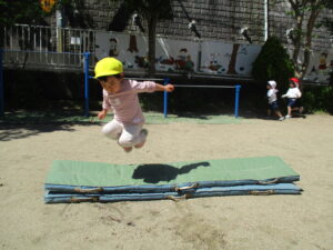 お外は晴れていたので、初めてのお外で体育あそびをしました。