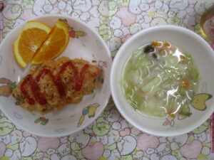 今日の給食はチキンライス・野菜スープ・果物でした。
