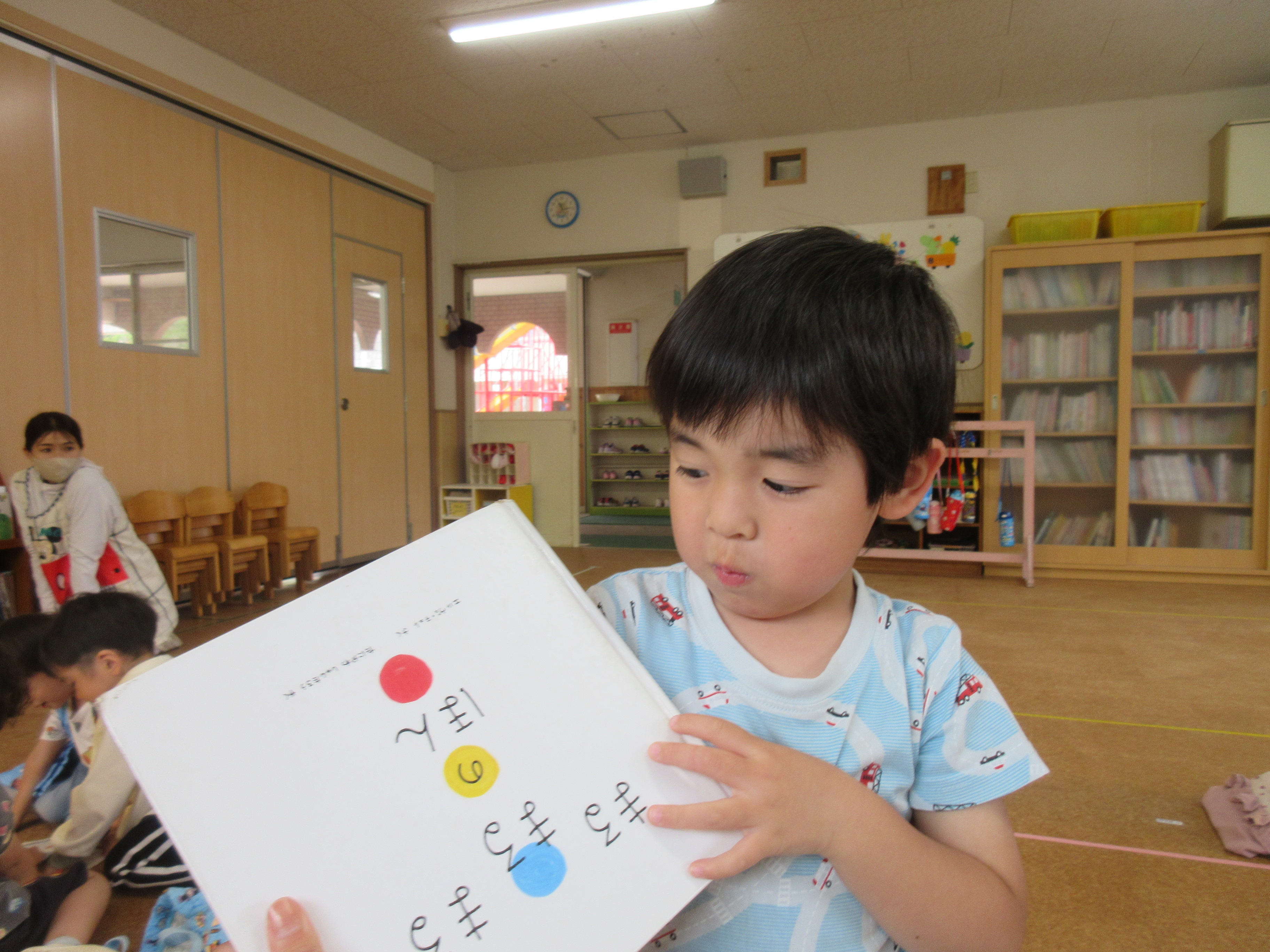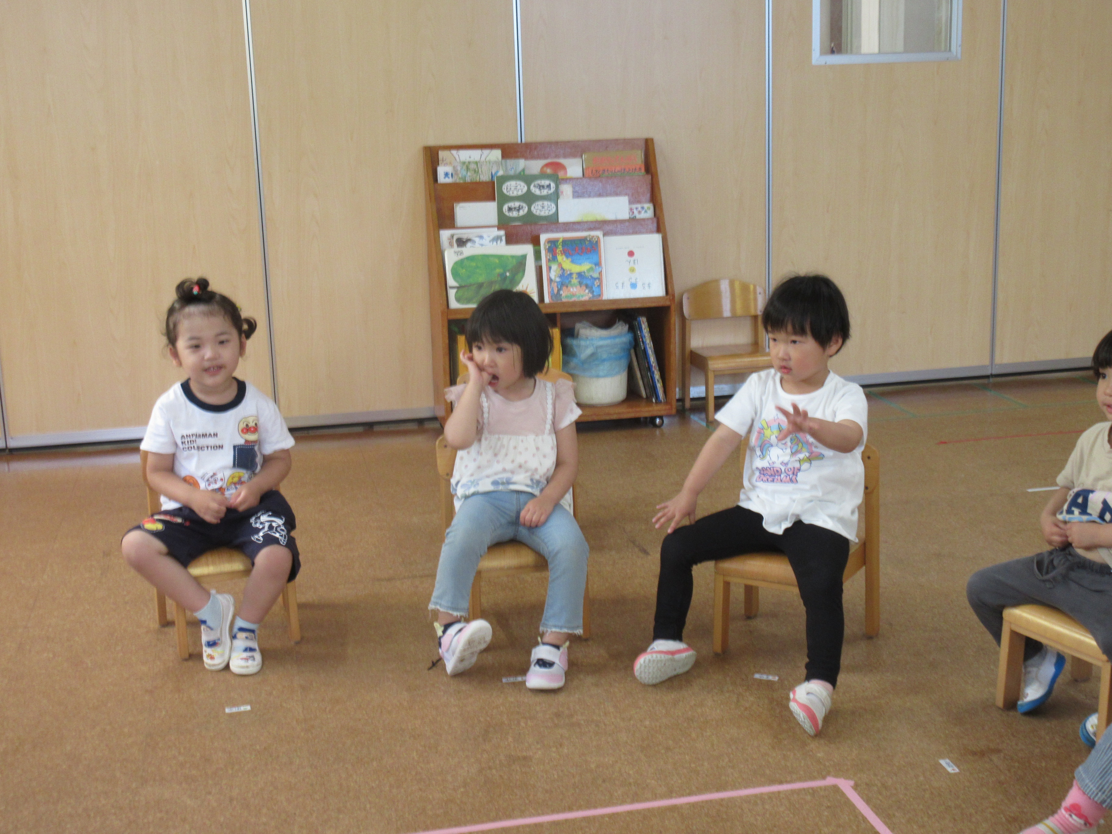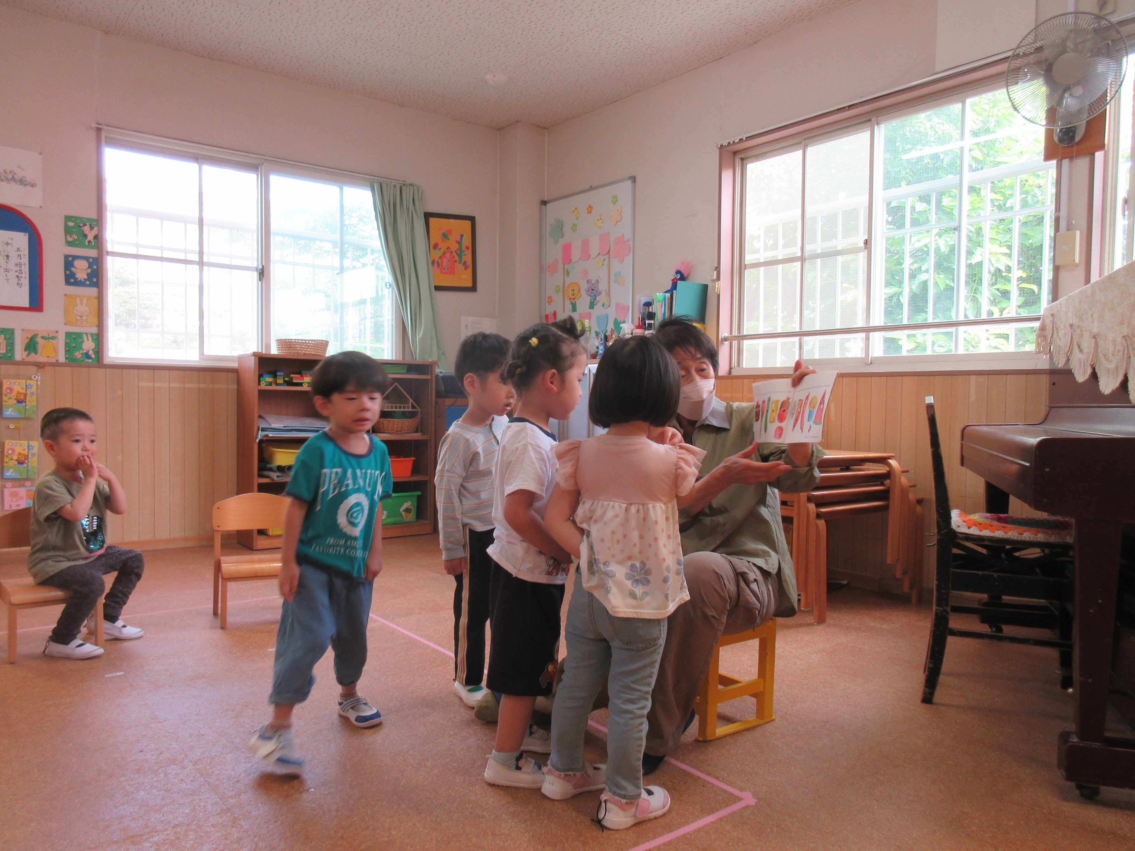 英語での挨拶を教えてもらったり、5までの数字や色をカードで学びました(^^♪先生のカバンから次々と出てくる物に興味津々で「次はなにするの~?」と目を輝かせてました☺次の英語あそびも楽しみです♪