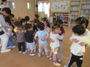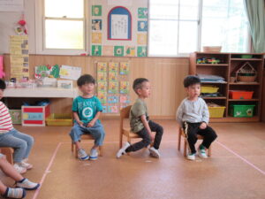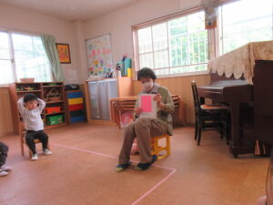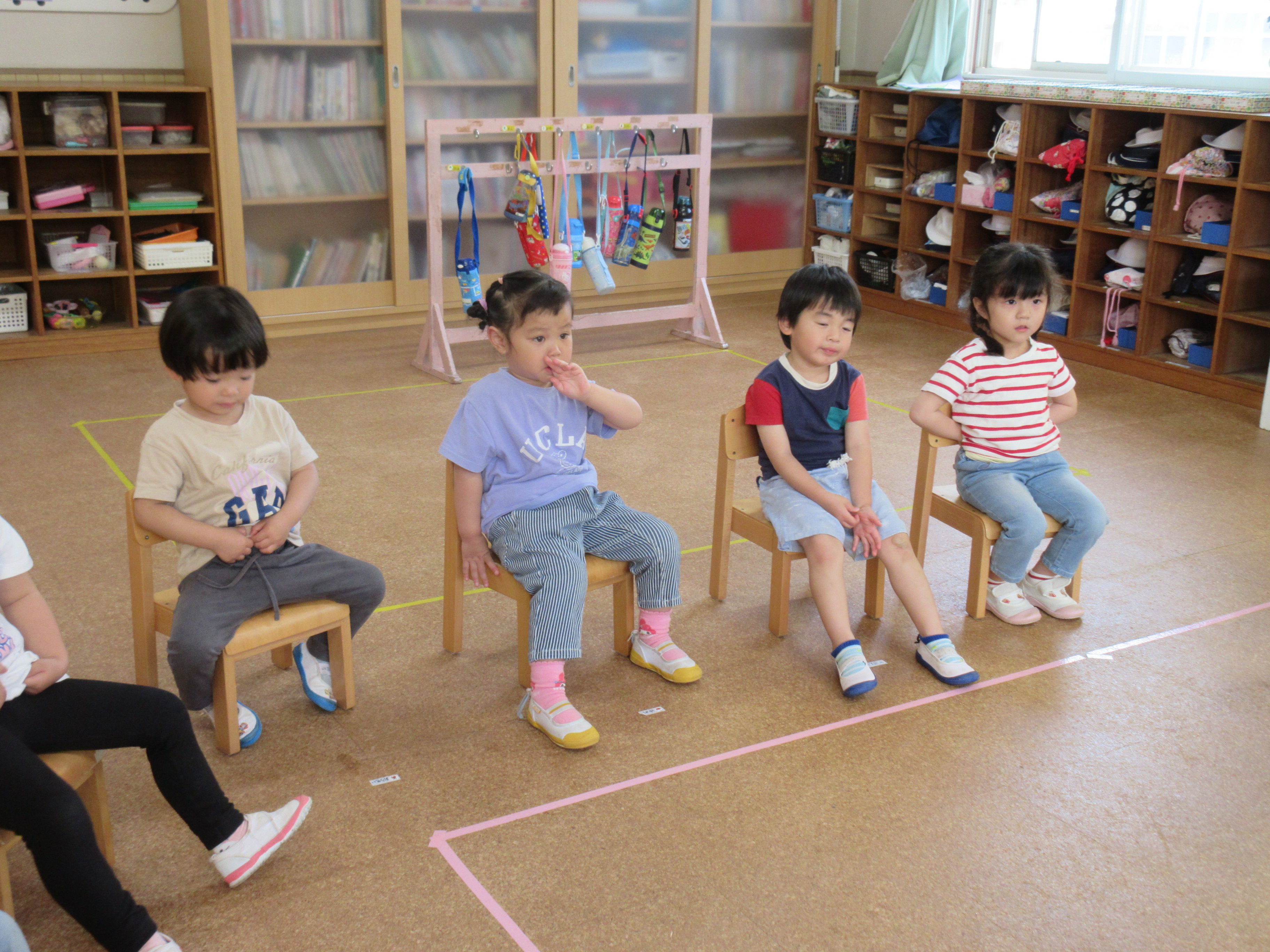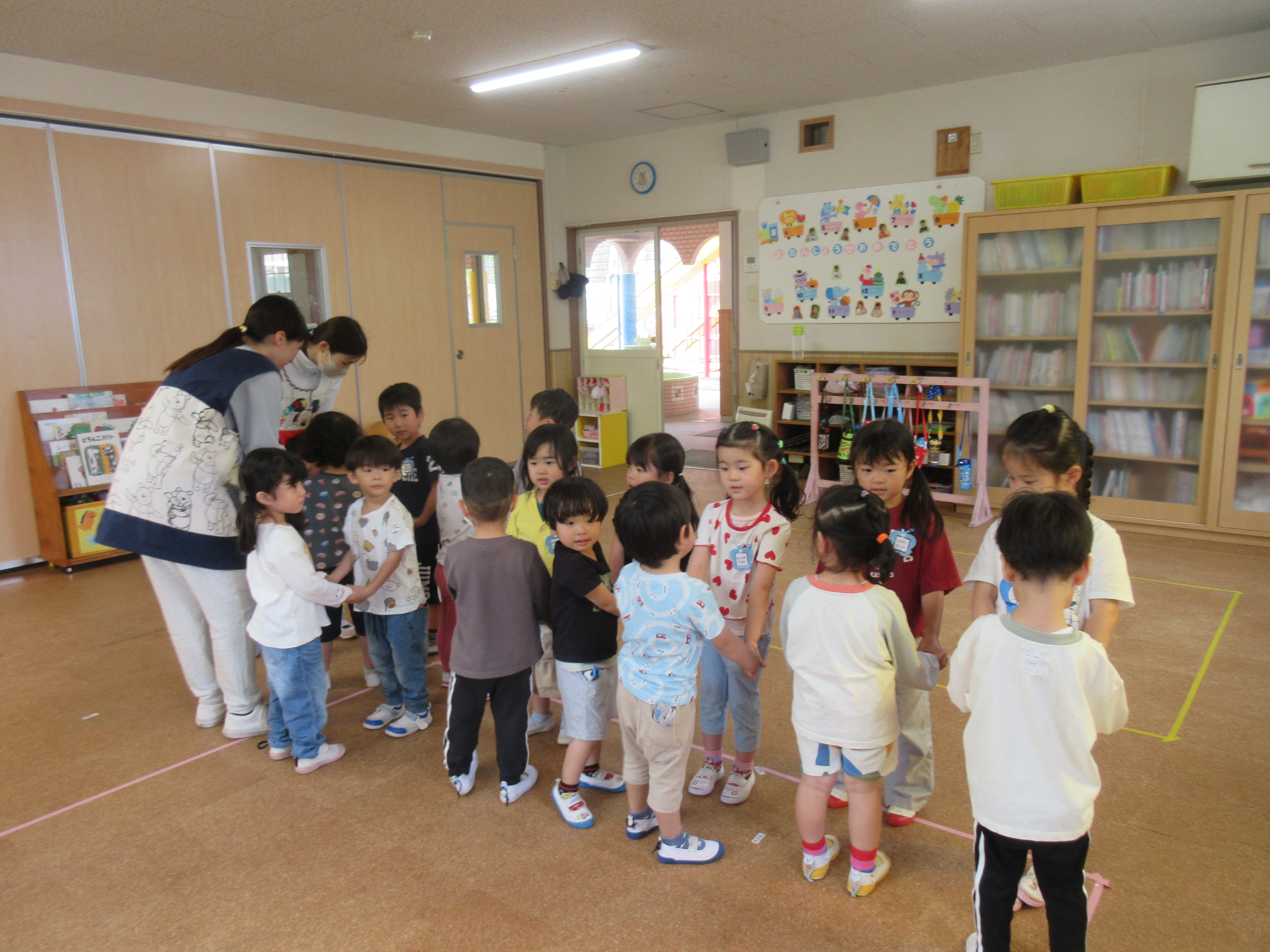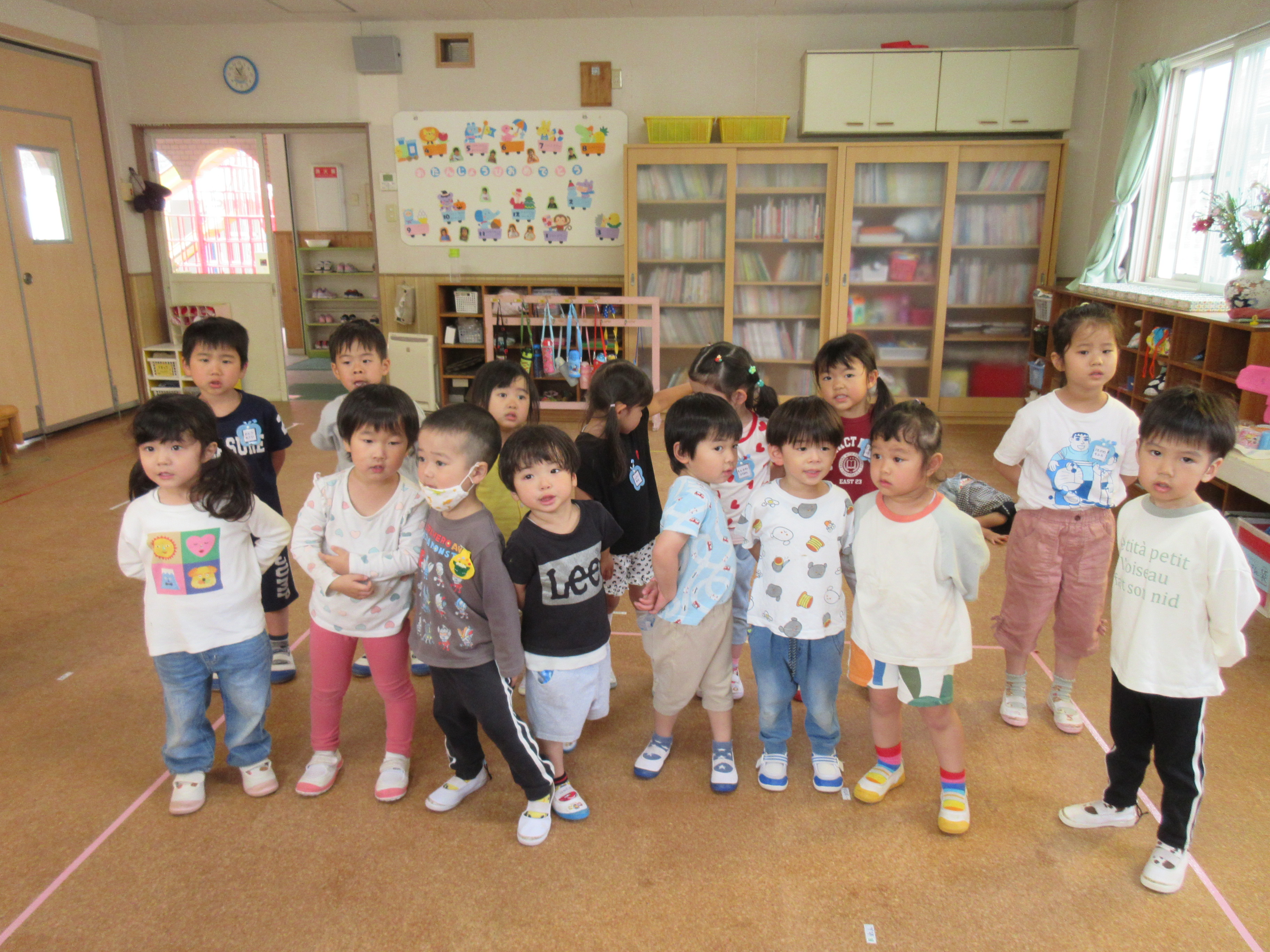 英語での挨拶を教えてもらったり、5までの数字や色をカードで学びました(^^♪先生のカバンから次々と出てくる物に興味津々で「次はなにするの~?」と目を輝かせてました☺次の英語あそびも楽しみです♪