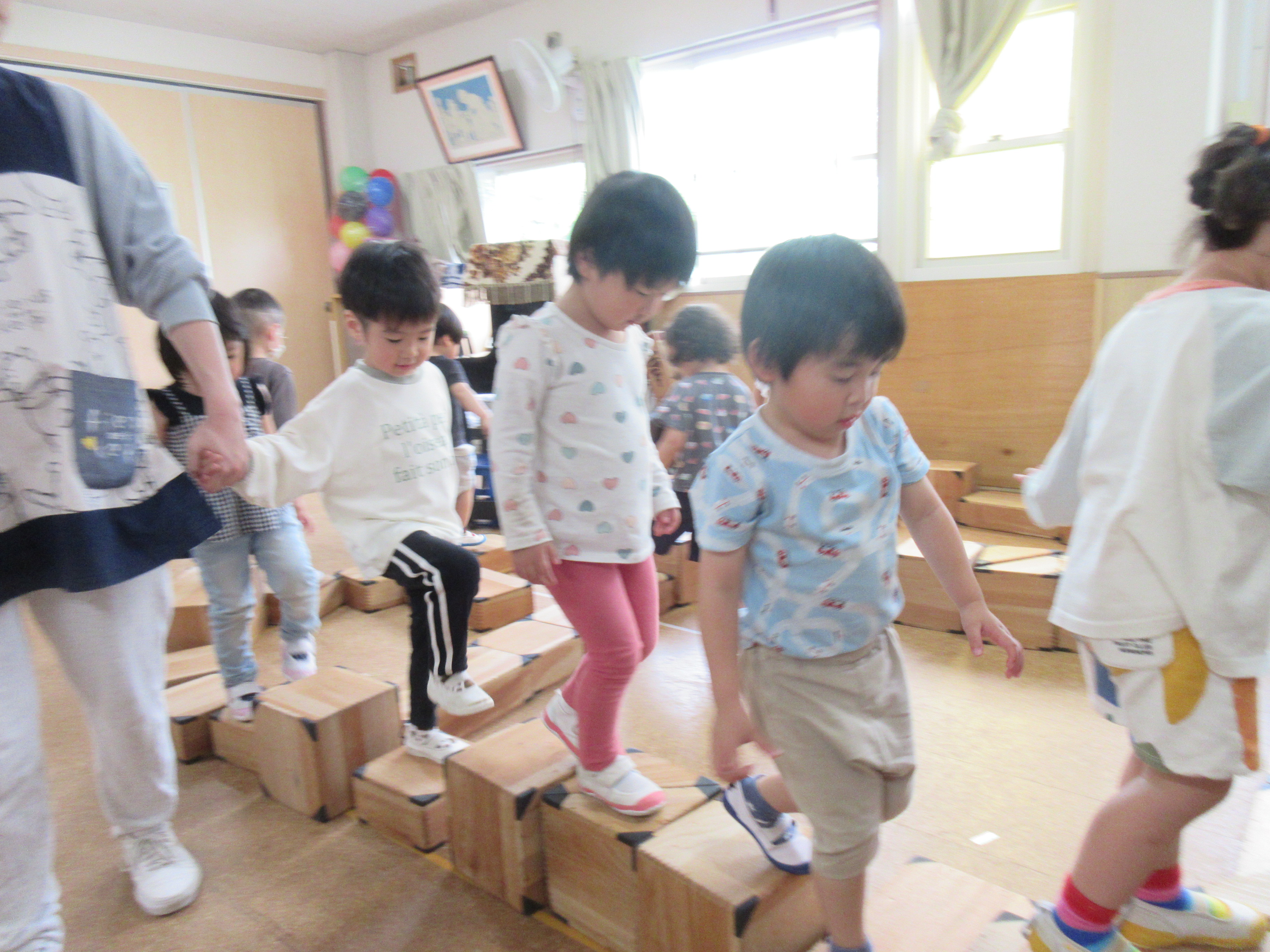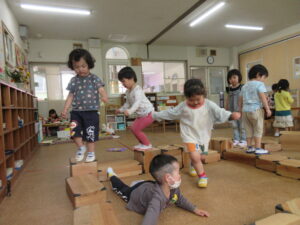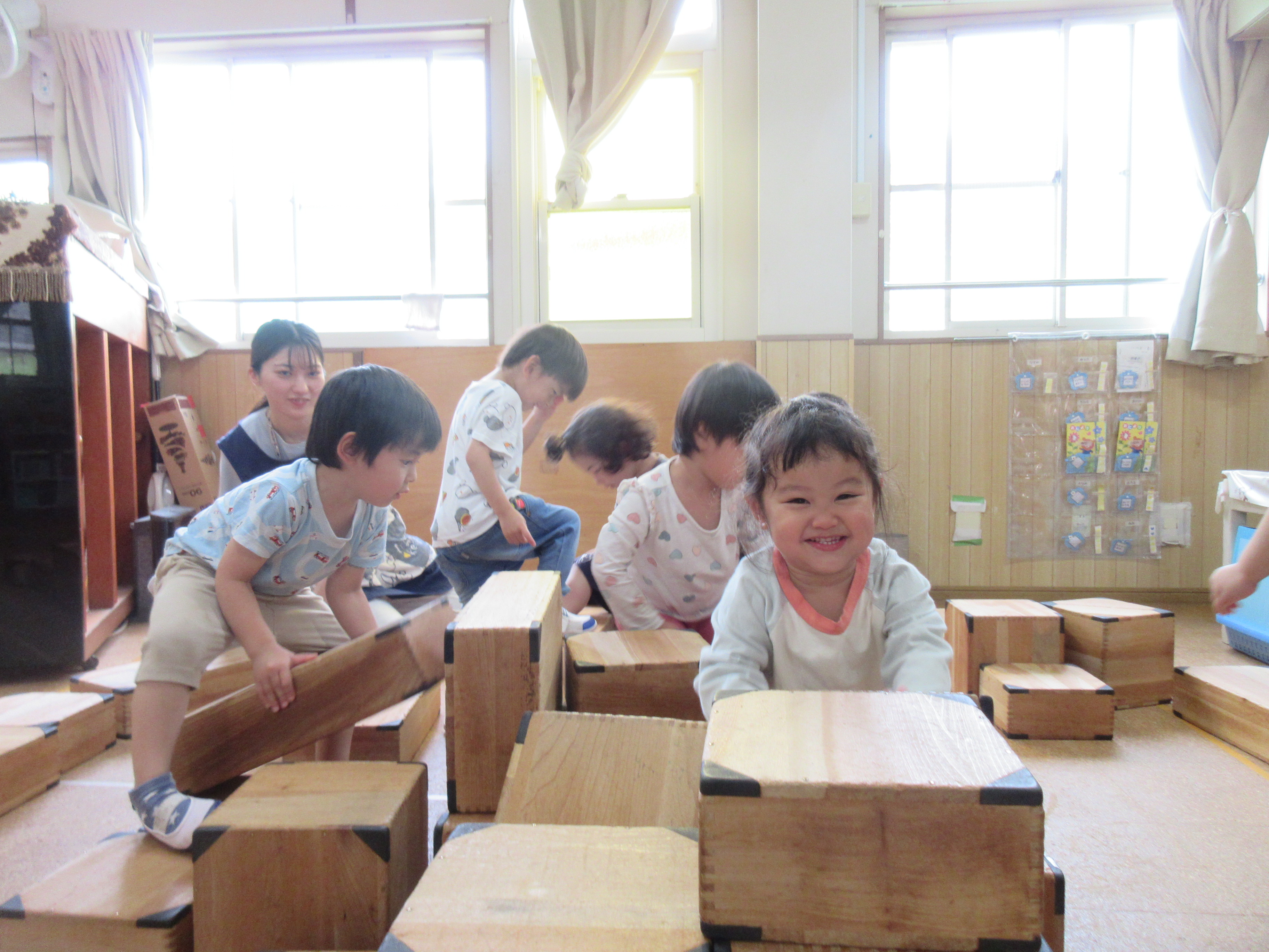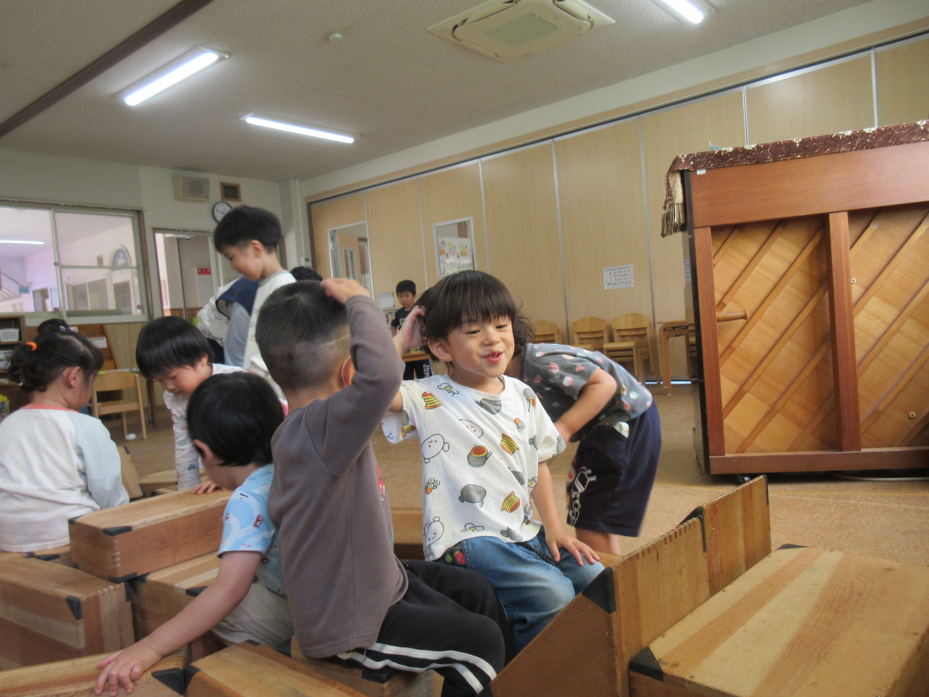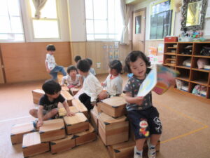 ご飯を食べた後は、すみれ組さんのおへにお邪魔して大型積み木で遊びました!車やお家を作ったり、とっても楽しそうな子どもたちでした(^^♪