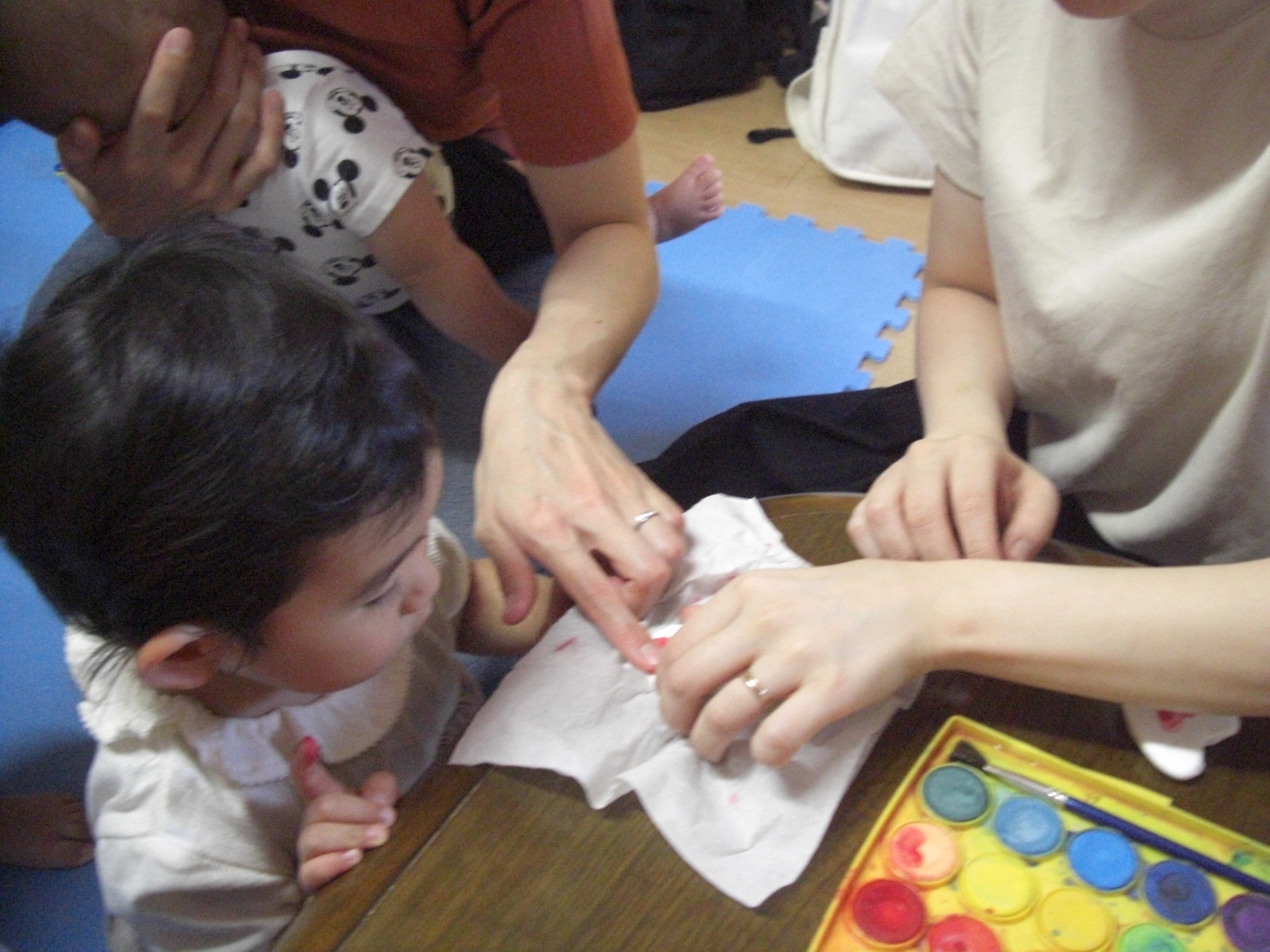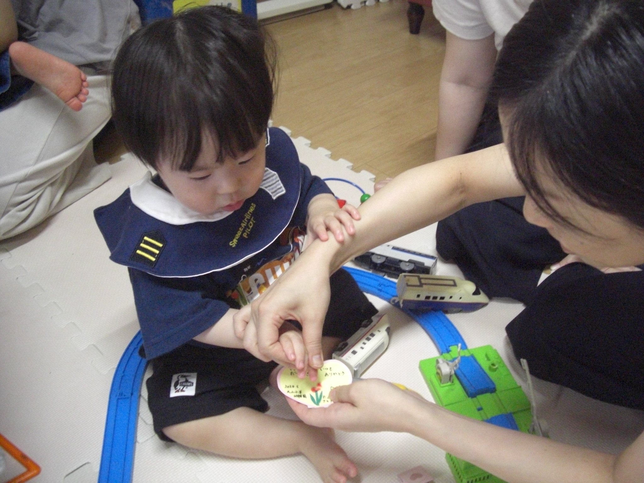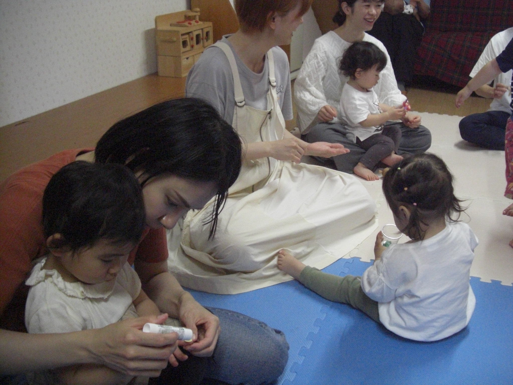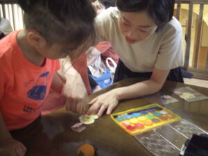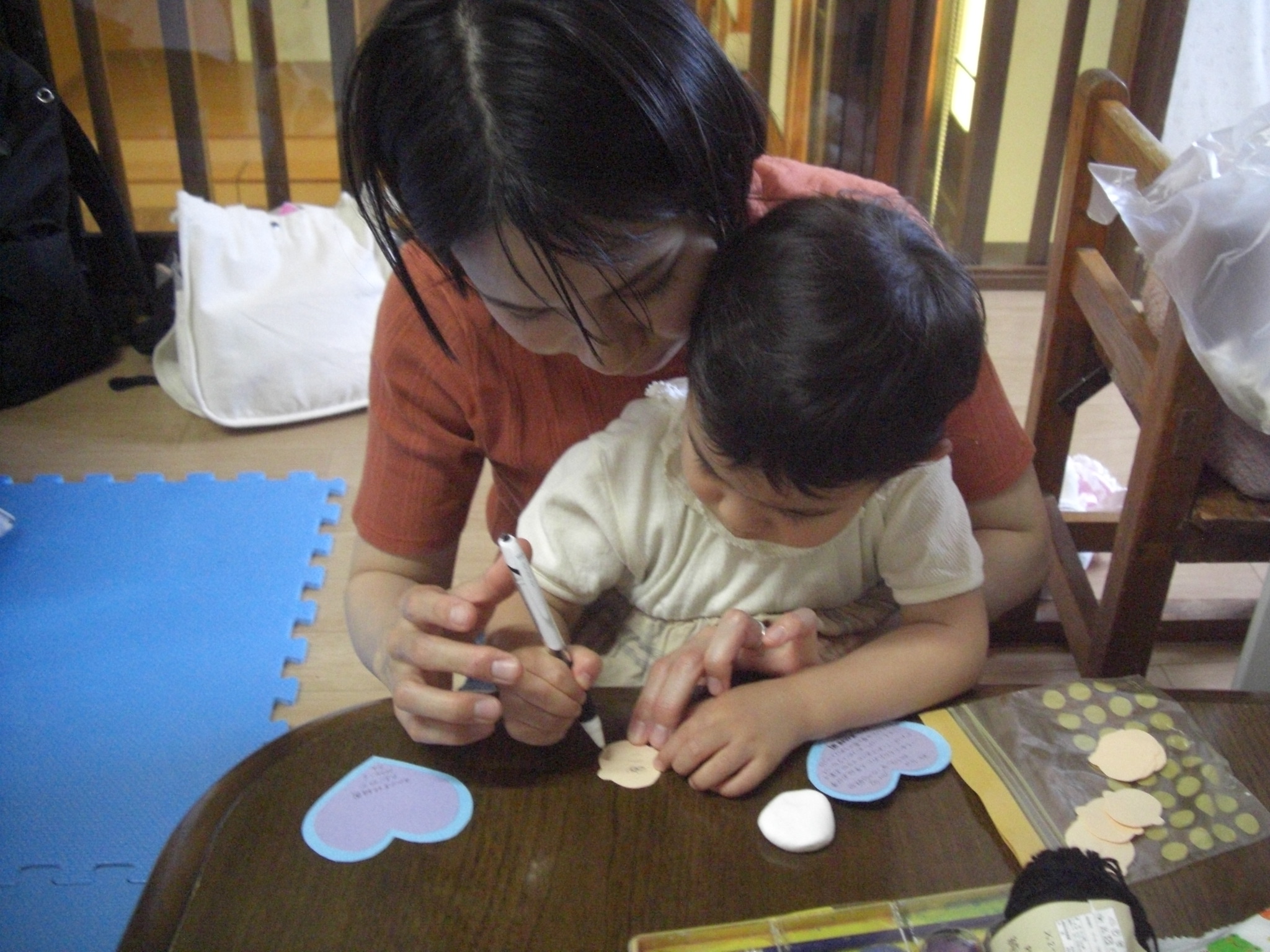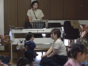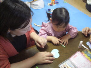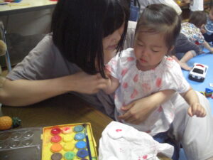 絵本の後は、いよいよ楽器作り!ままと一緒にお顔を貼ったり、シールを付けて、1人1人オリジナルのマラカス作り(^^)中にはストローやお花のおはじきを入れて・・シャカシャカと音が鳴るマラカスの完成!来週のリズム遊びでみんなで鳴らして遊ぼうね♡来週お休みのお友だちは、お家で鳴らして遊んでね♬