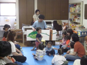 はらぺこあおむしの楽器作りの前に、西原夫妻にはらぺこあおむしの大きな絵本も読んでもらったよ!子どもたちも興味津々♬絵本を指さしたり、一緒に身体を揺らしたり、とても楽しい絵本の時間でした♡