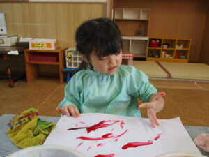 赤・青・緑・黄の好きな色を指に付けて遊びました。