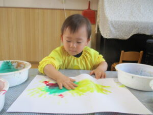 大胆なに沢山の色を使って画用紙で色を混ぜている子や、色が混ざらないようにしている子など様々な様子が見れました。