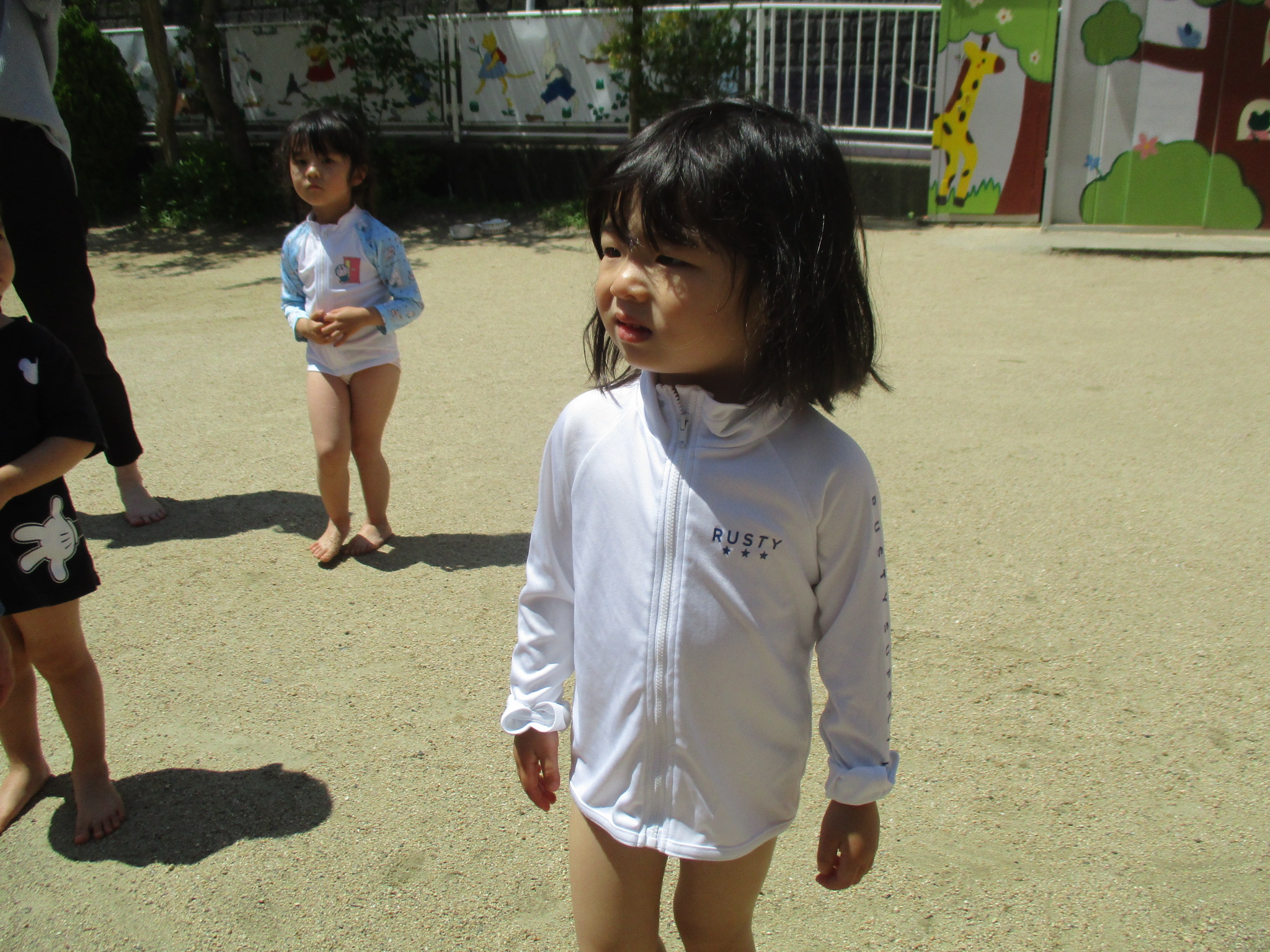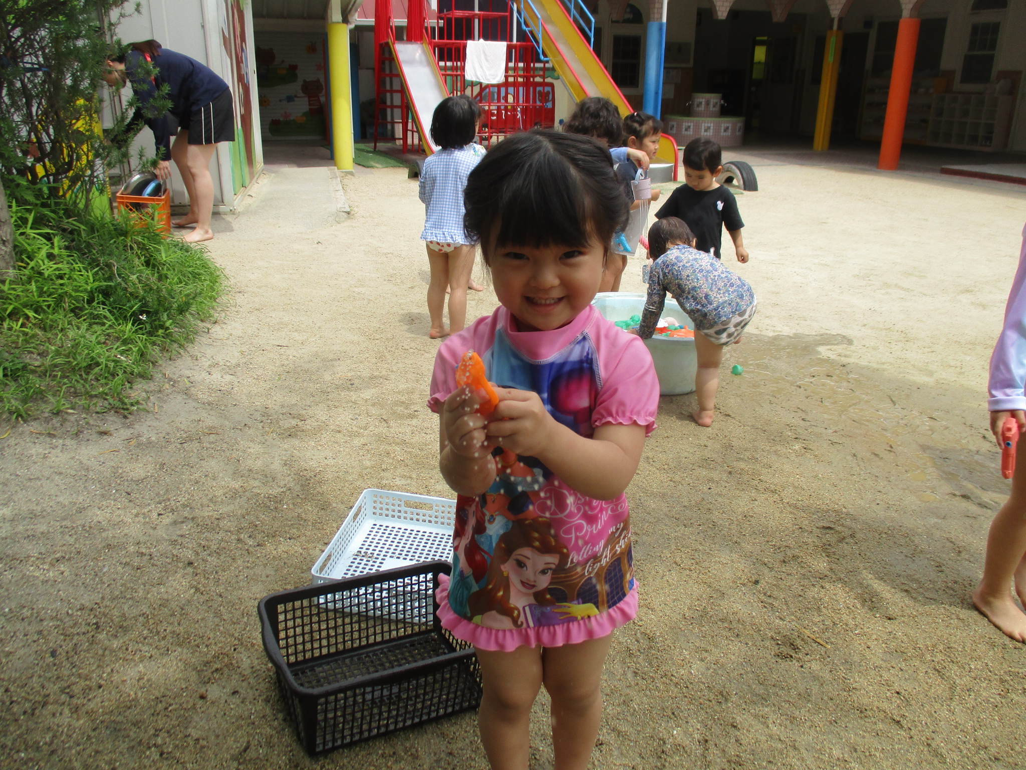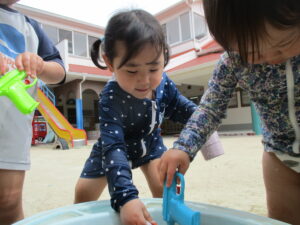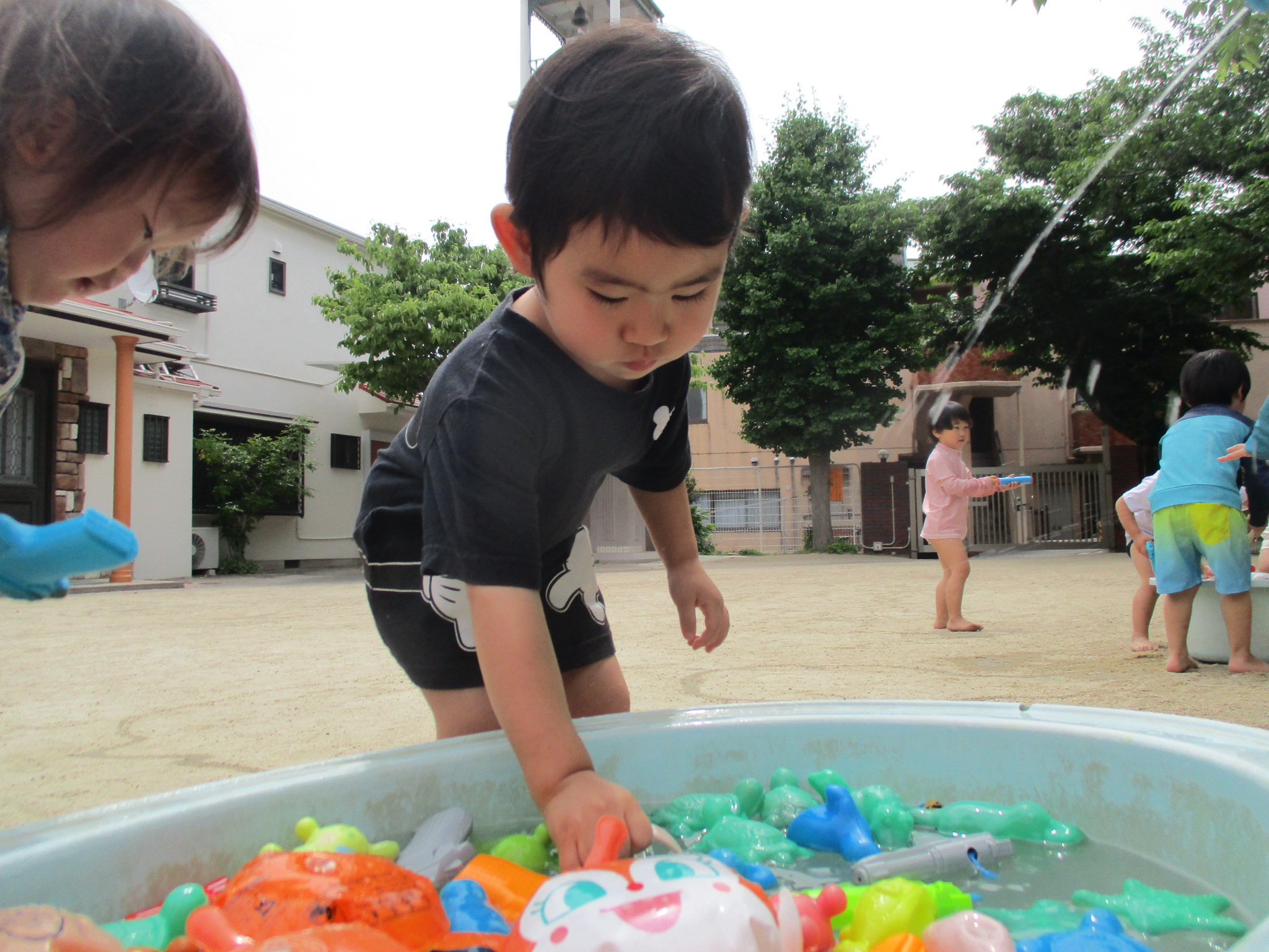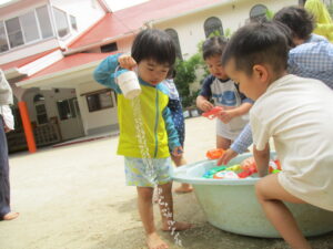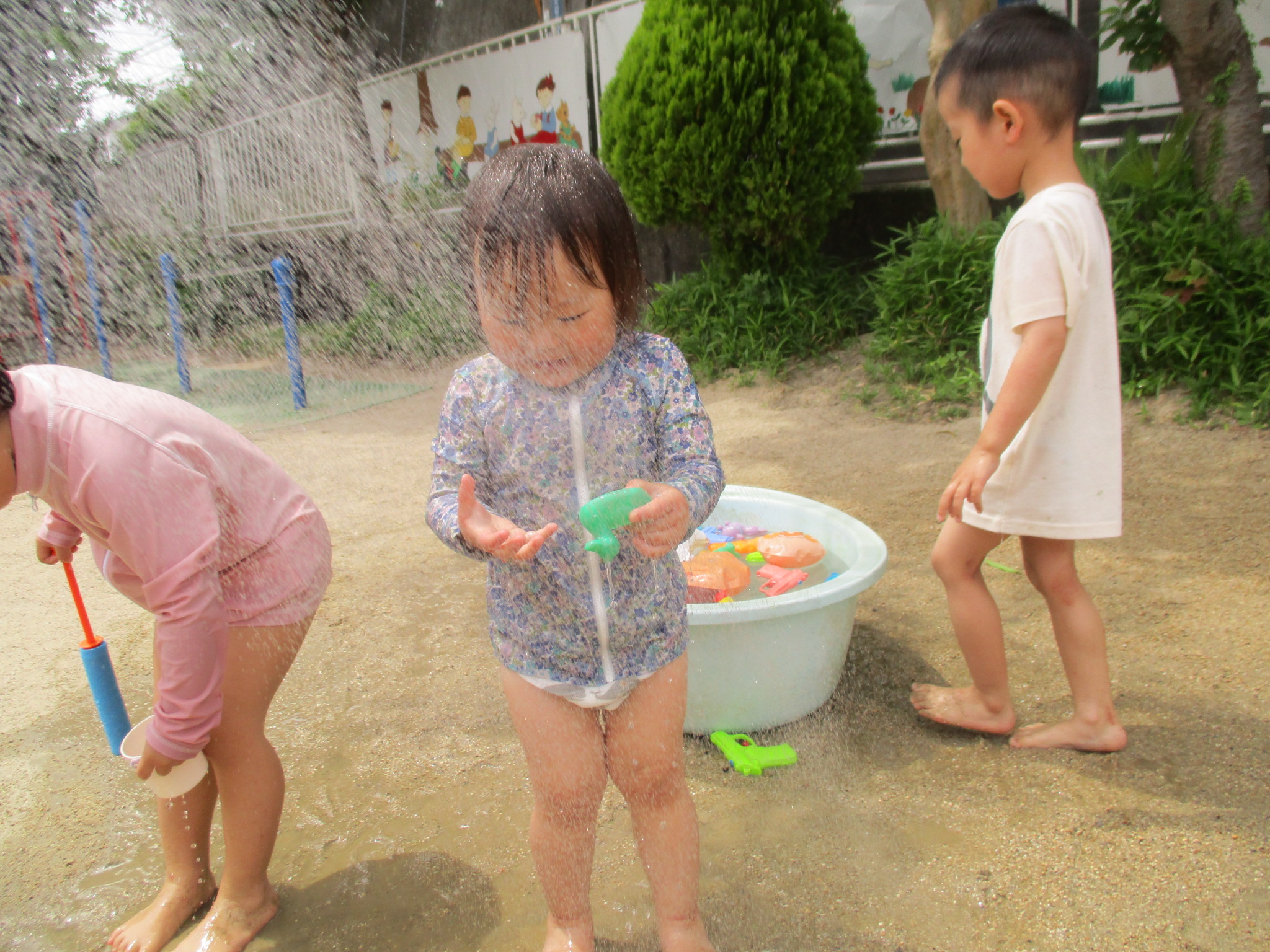 お水が上から降ってくるのに最初は逃げている子や頭からかかって子やベビーバスにたまったお水をちゃぷちゃぷする子水鉄砲で狙い撃ちしている子などがいました。