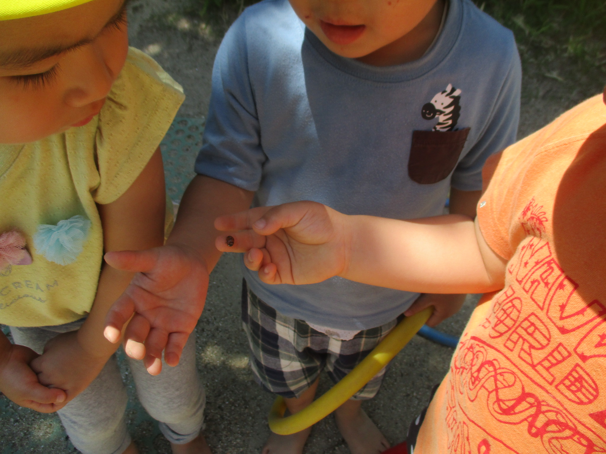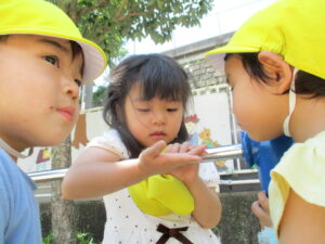 今日はテントウムシを見つけて捕まえて逃げられて捕まえて逃げられて・・・興味津々な子どもたちでした。