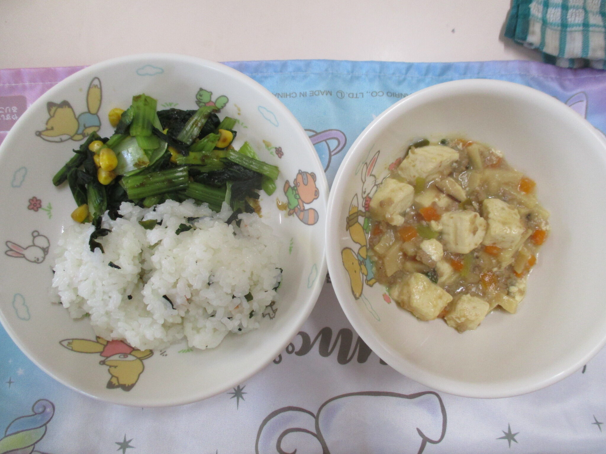 今日の給食は麻婆豆腐・ごはん・海苔和えでした。