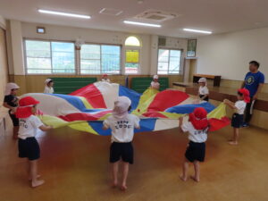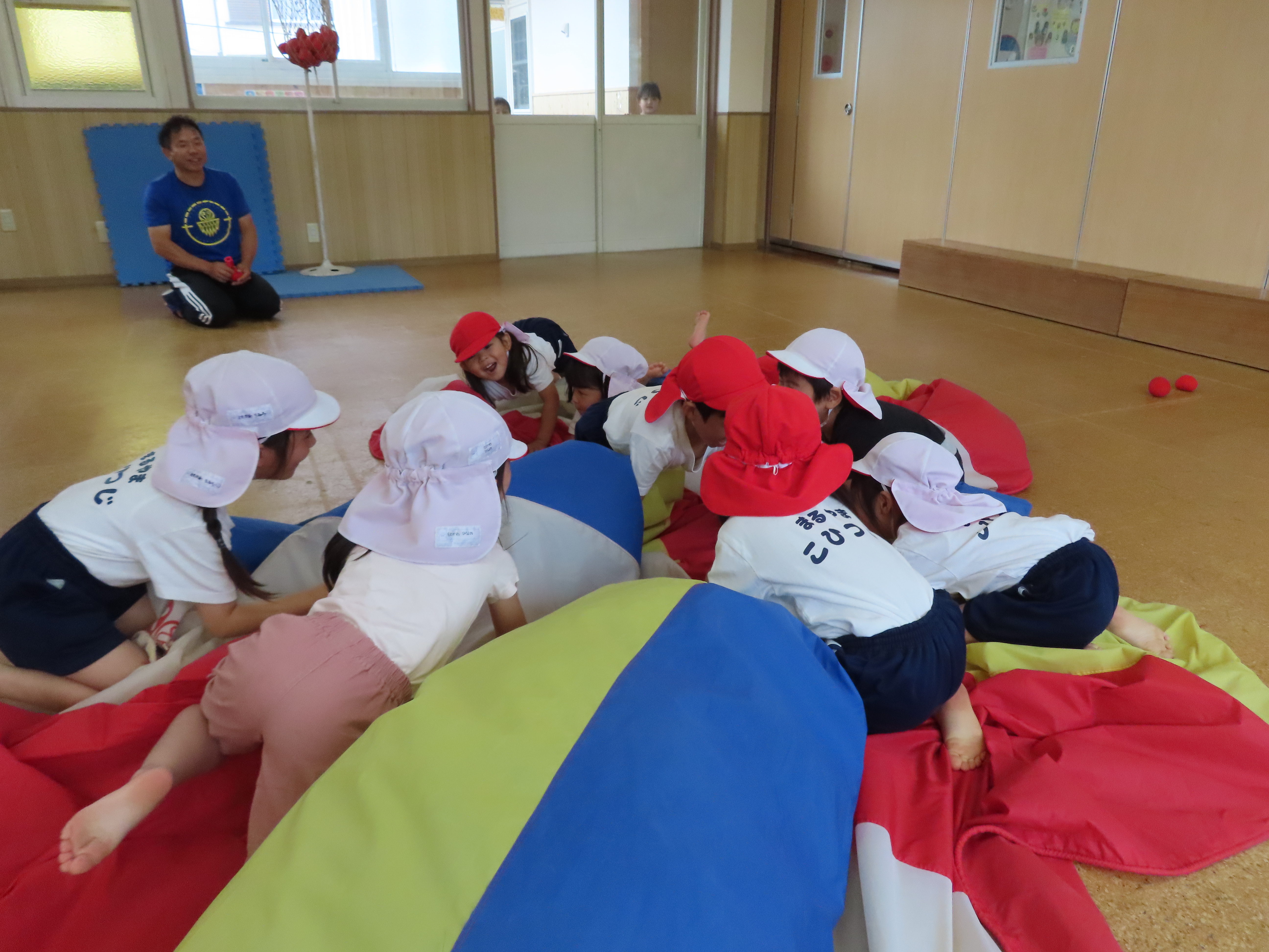 パラバルーンでは、後ろにピーンと引っ張って技をしたり、タイミングを合わせて動くことに少し苦戦していましたが、最後は大きなプリンを作ることができ、嬉しそうに食べる真似をしている姿がとっても可愛かったです💕