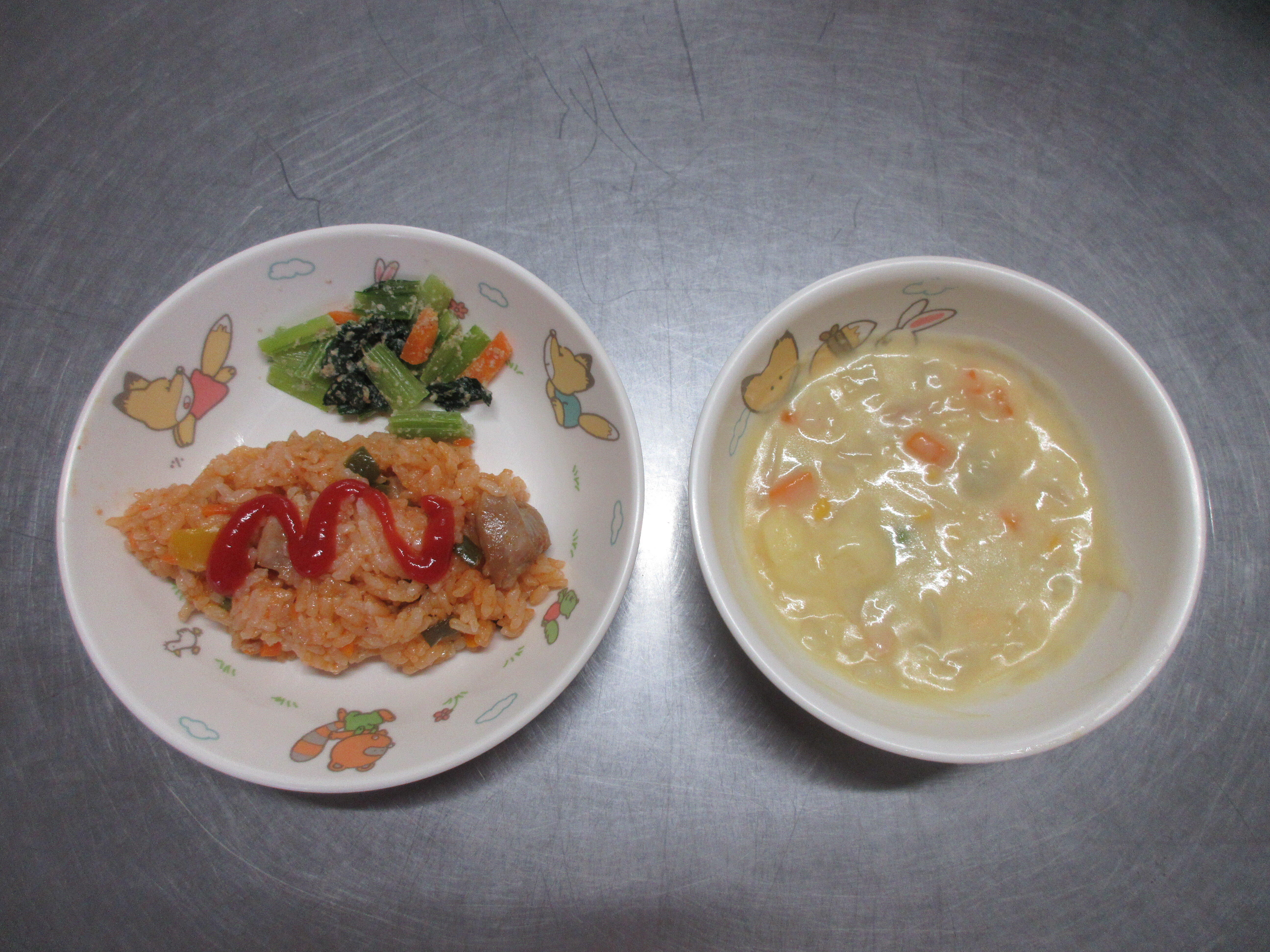 今日は、チキンライスとコーンチャウダーと胡麻和えでした🥣