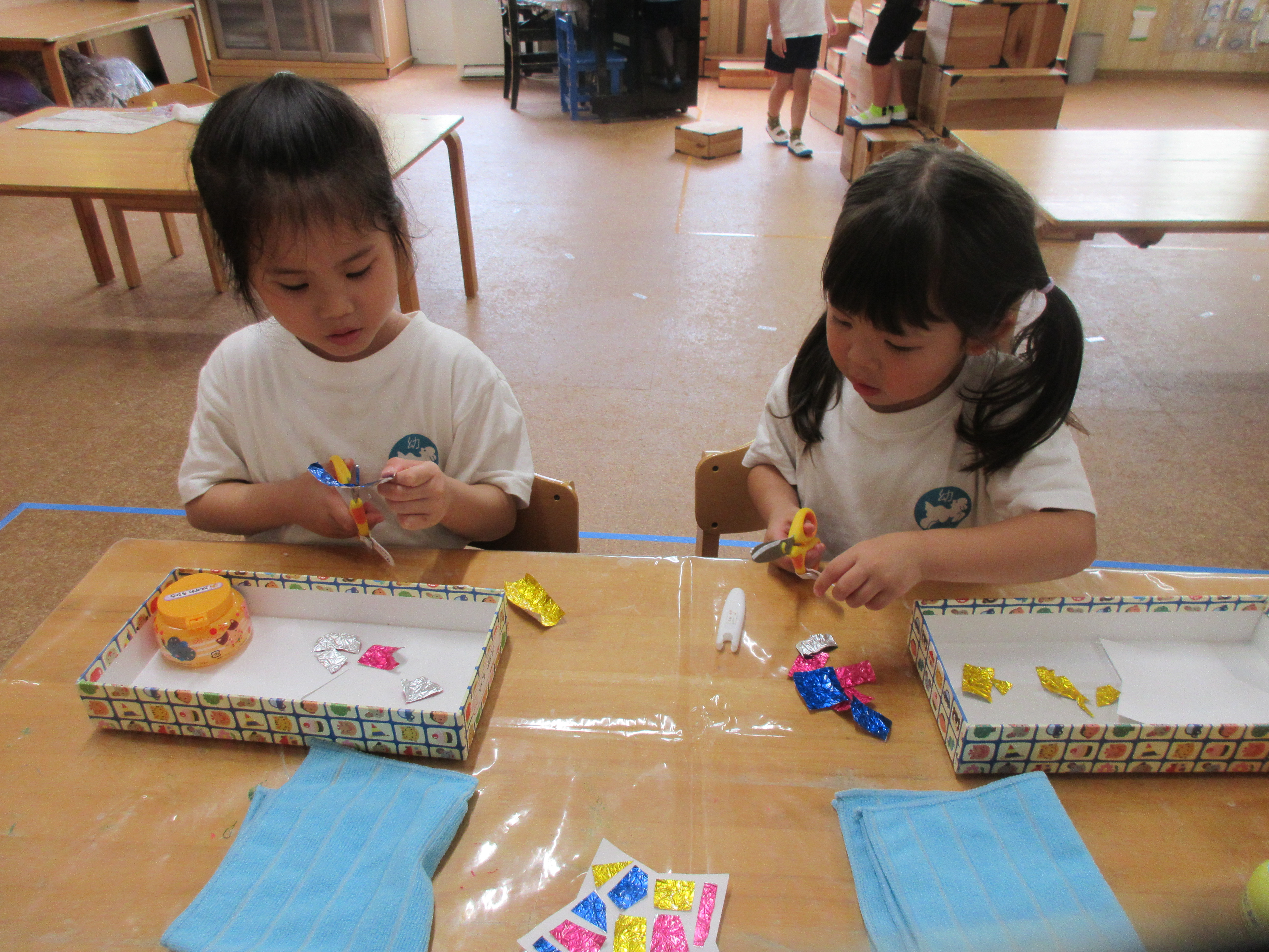 今日は色がついたアルミホイルをはさみで切り、星の形の画用紙に貼りました✂
