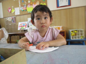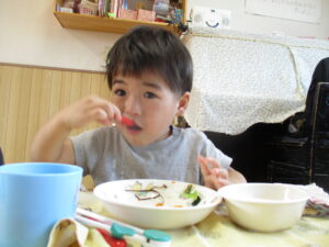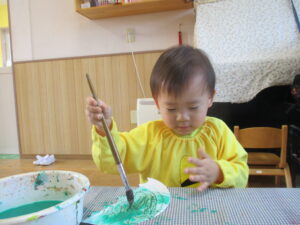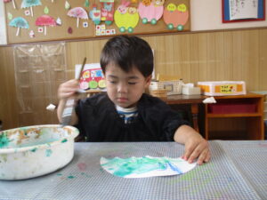 みんな用意をしている時から「したい」とお話してくれ、特に絵の具は白いところがなくなるぐらい夢中になってしてくれました。