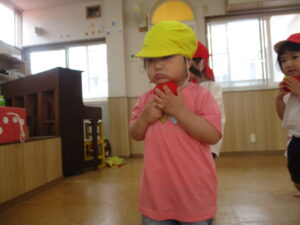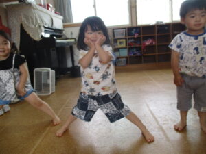 あいにくの雨でプールはできませんでしたが、大西先生とお部屋で体育あそびをしました。