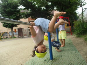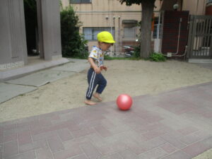リトミックで変なポーズ・可愛いポーズをしてみたり、集中してボールをけり続けていたりとお外でもお部屋でもたくさん遊びました。