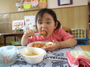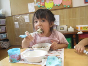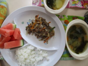 今日の2号さんの給食はチャプチェ・ごはん・味噌汁・スイカでした。