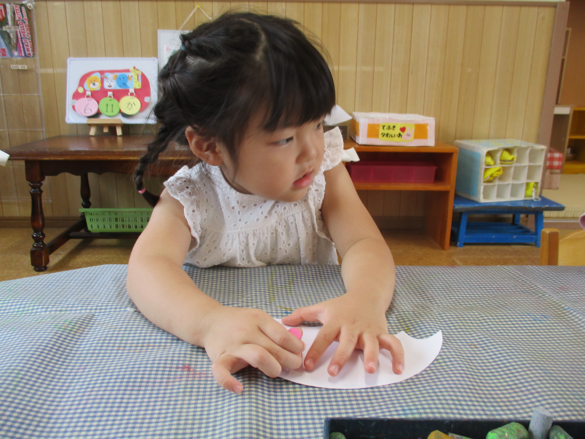 みんな用意をしている時から「したい」とお話してくれ、特に絵の具は白いところがなくなるぐらい夢中になってしてくれました。