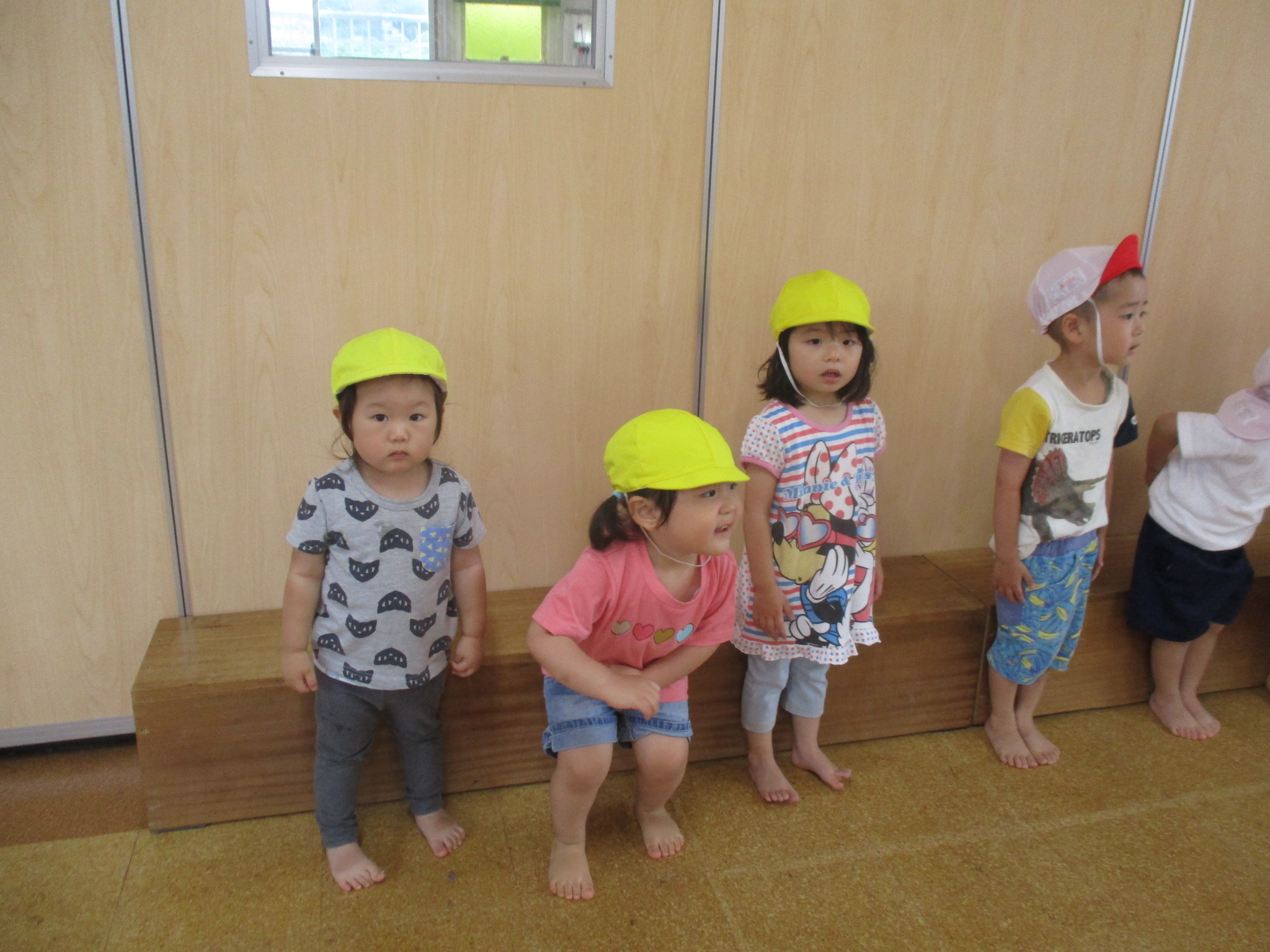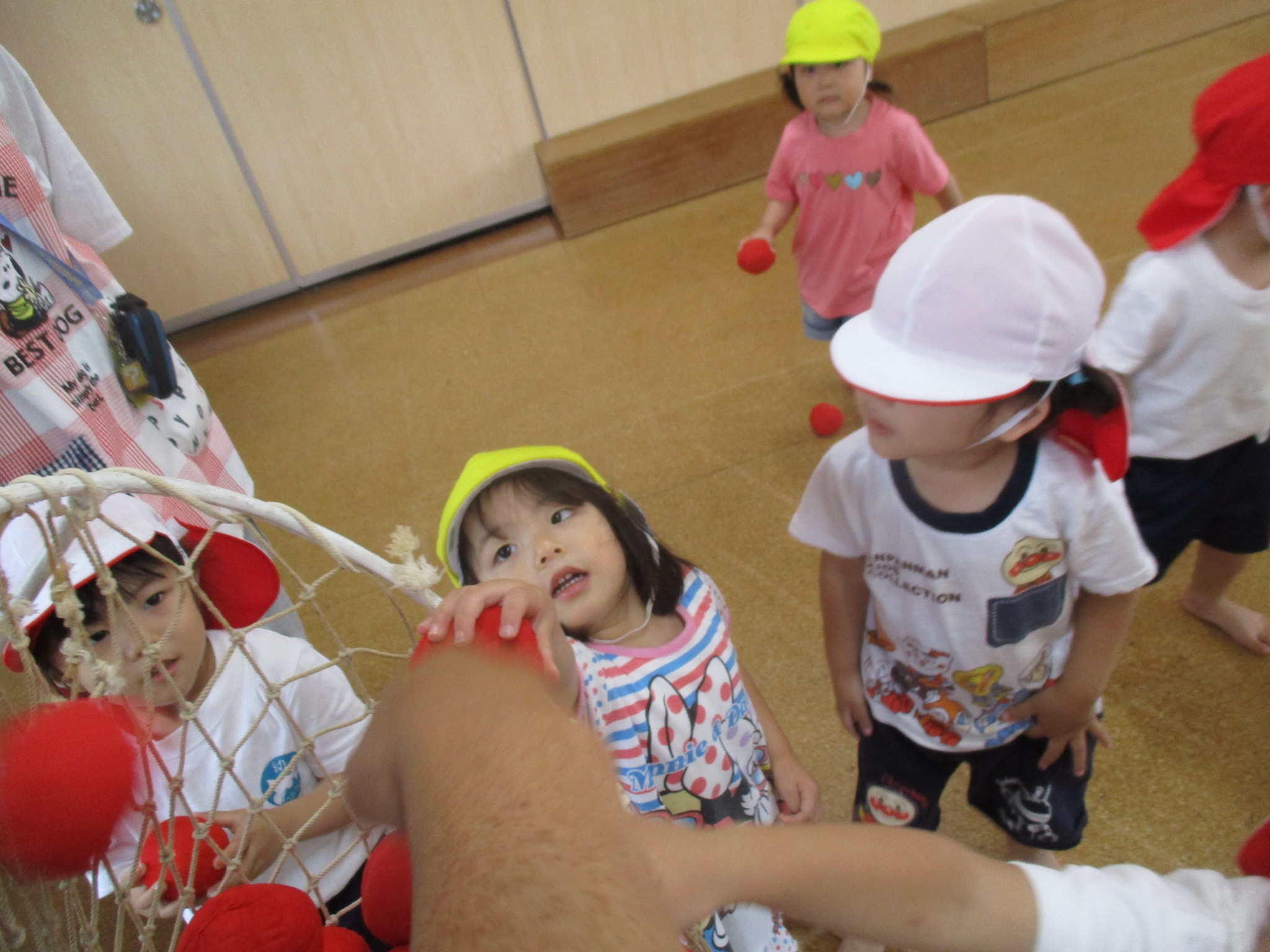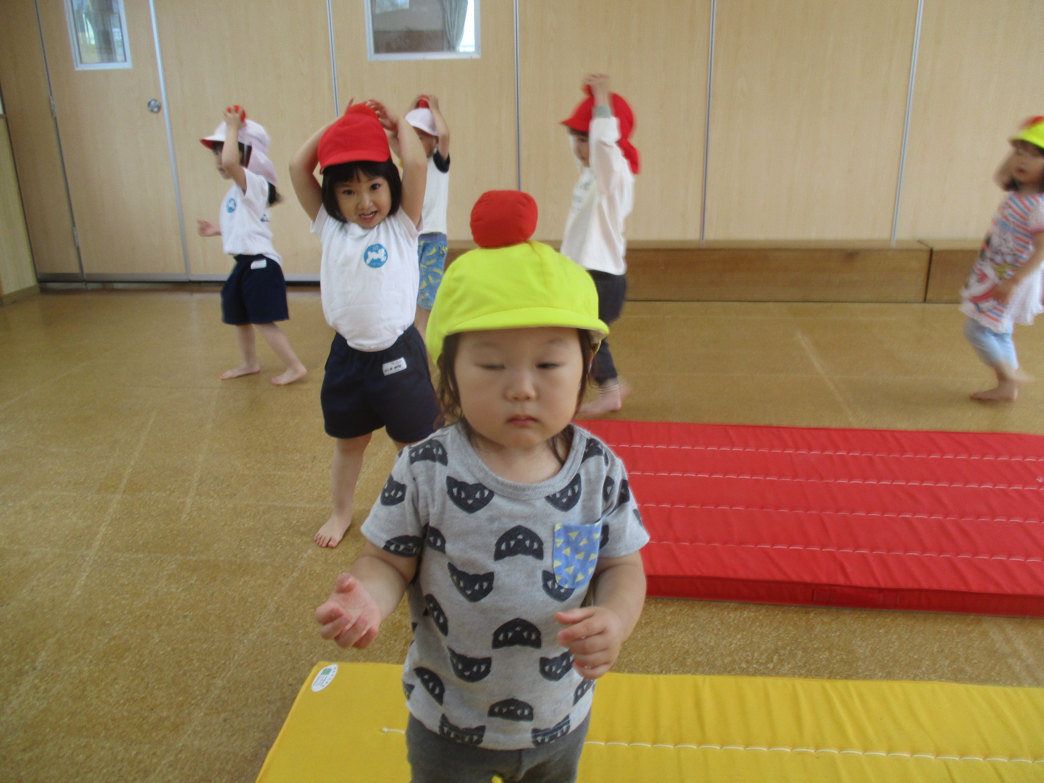 あいにくの雨でプールはできませんでしたが、大西先生とお部屋で体育あそびをしました。
