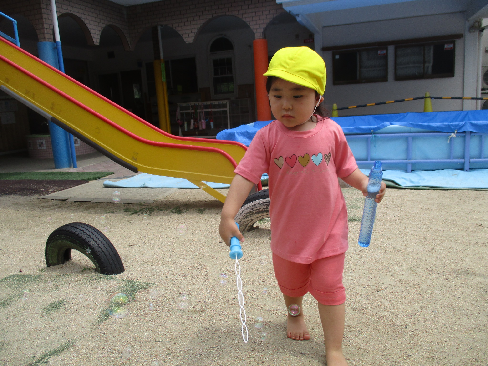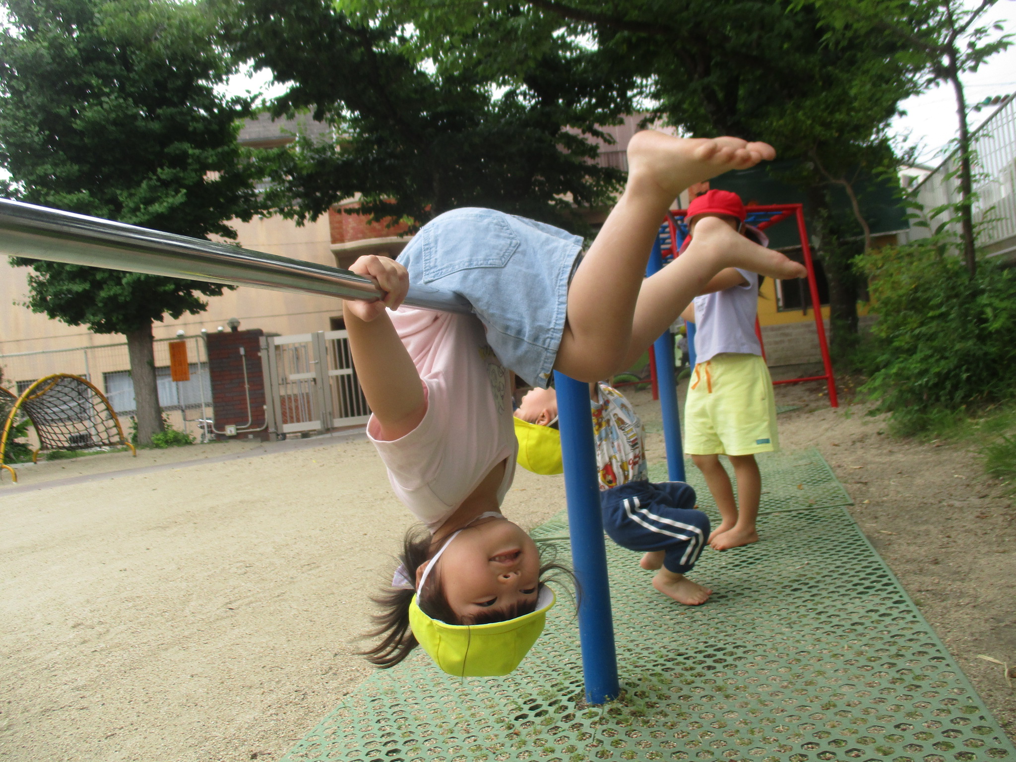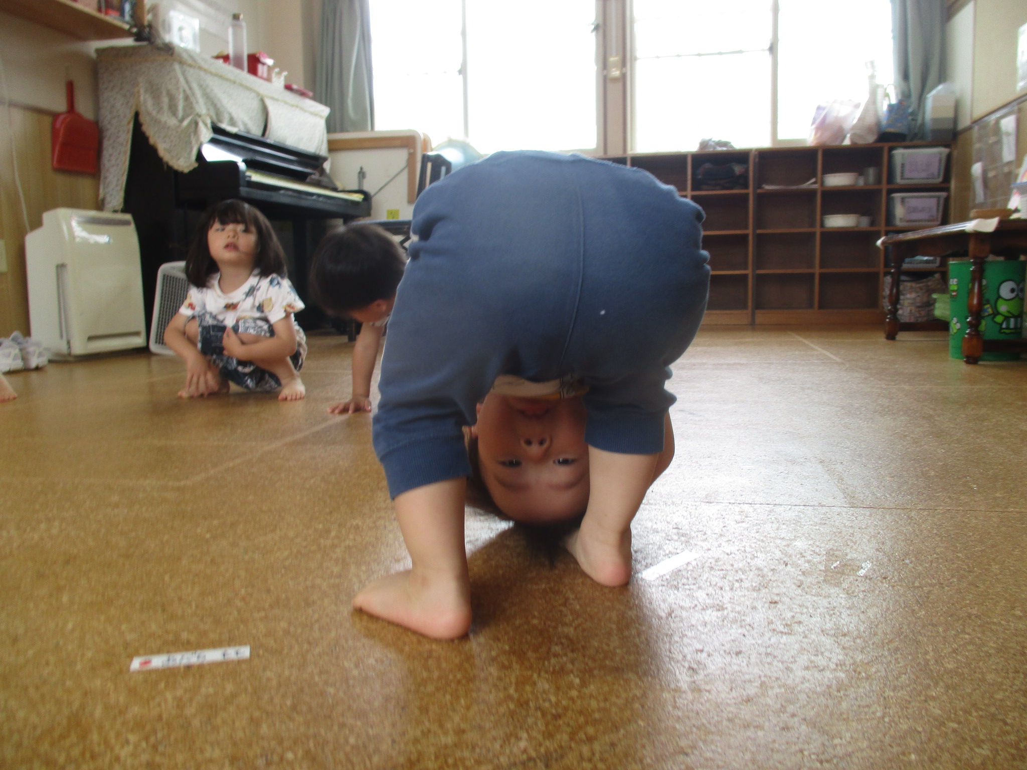 あいにくの雨でプールはできませんでしたが、大西先生とお部屋で体育あそびをしました。