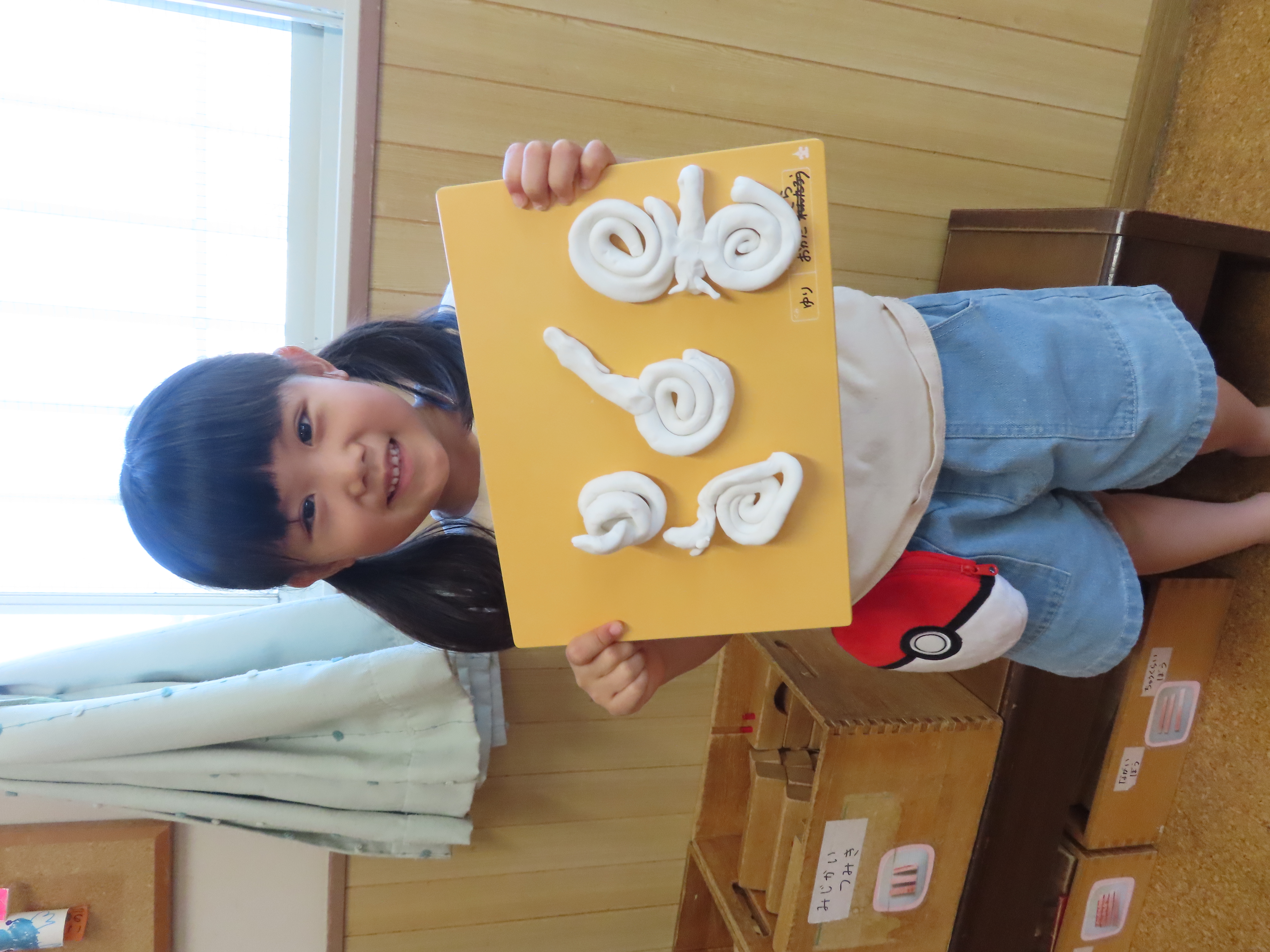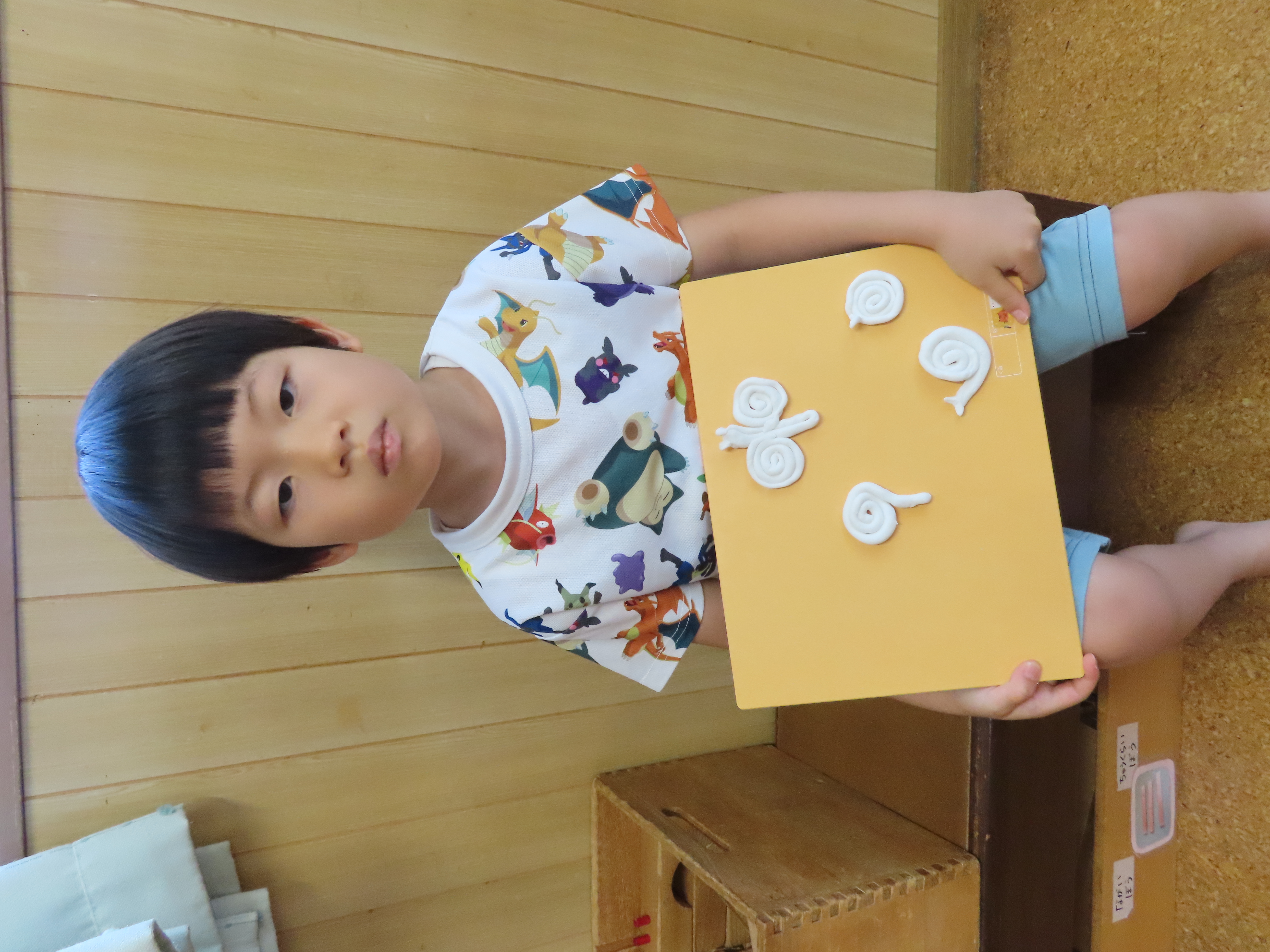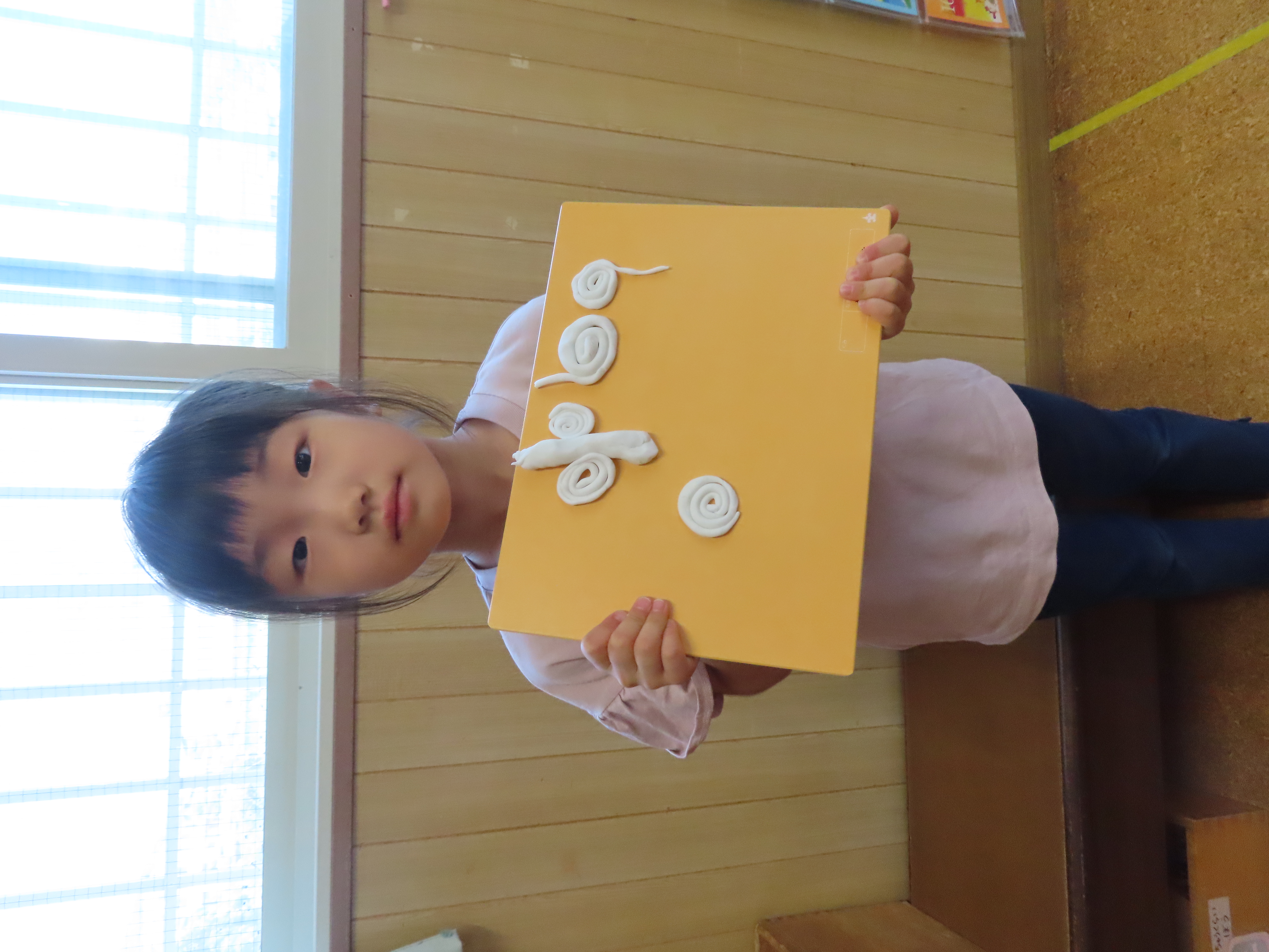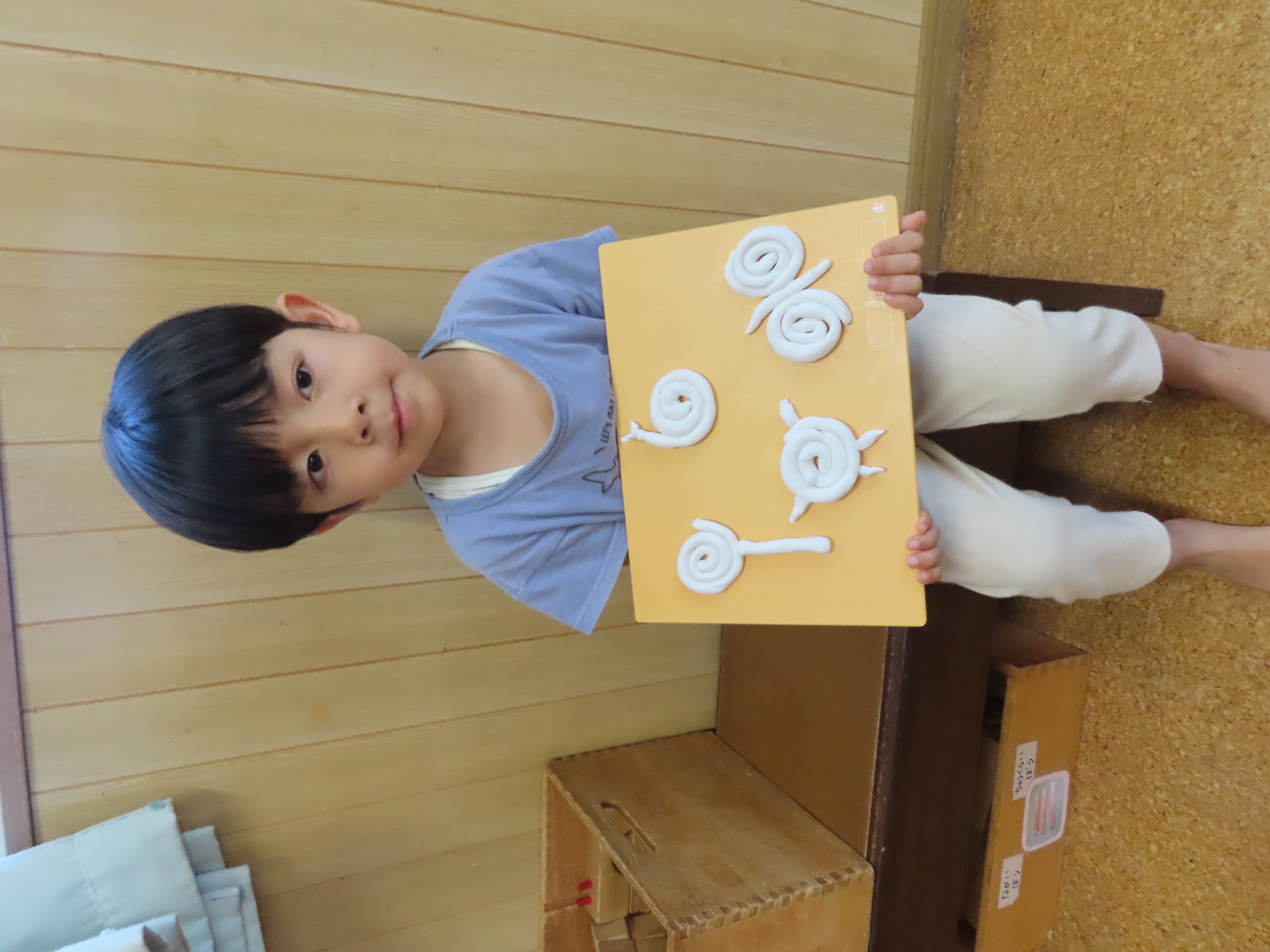 ながい棒を5本作って、1本目は、かたつむり。2本目は、ペロペロキャンディー。3本目と4本目をつかってちょうちょ。