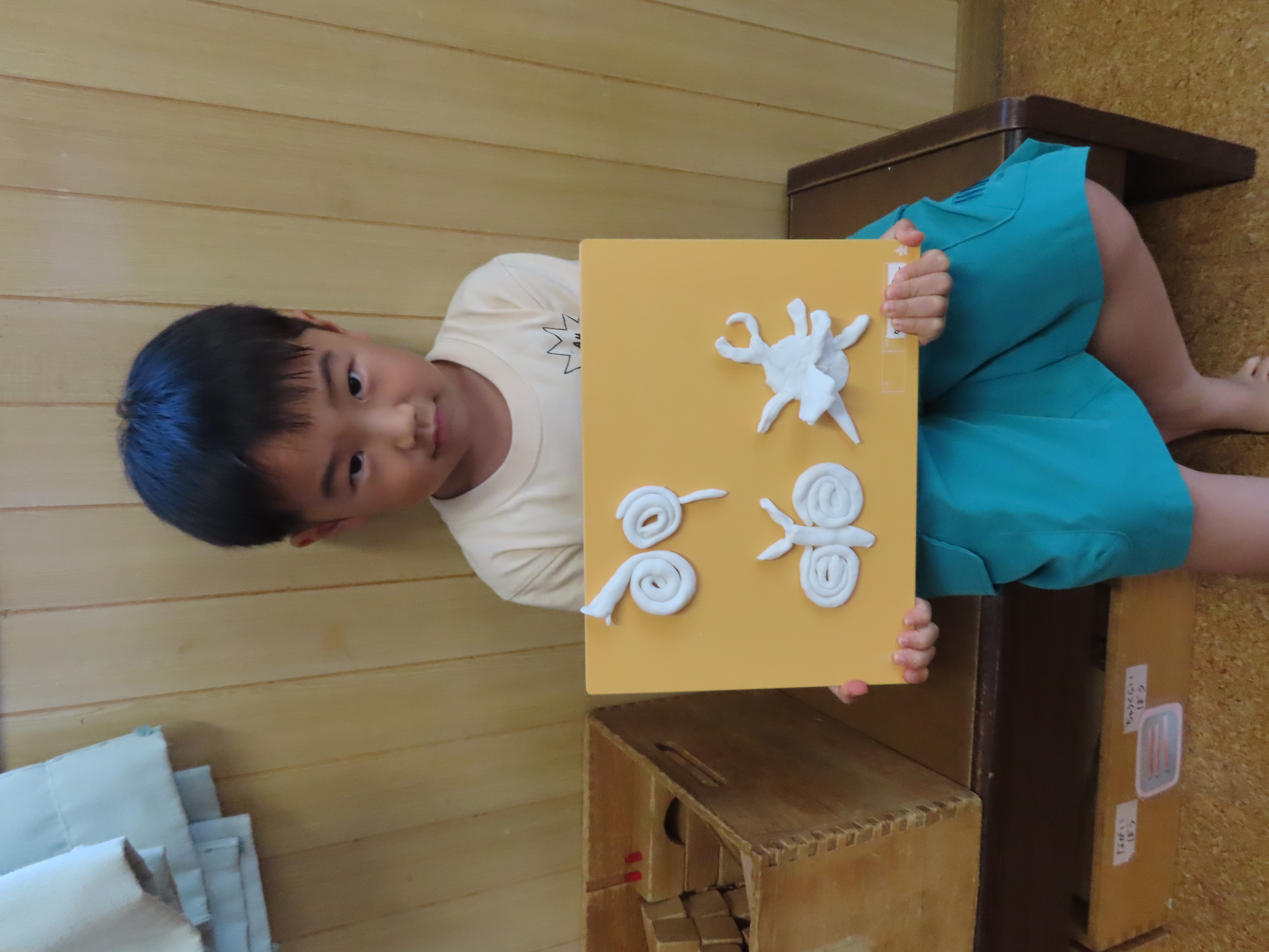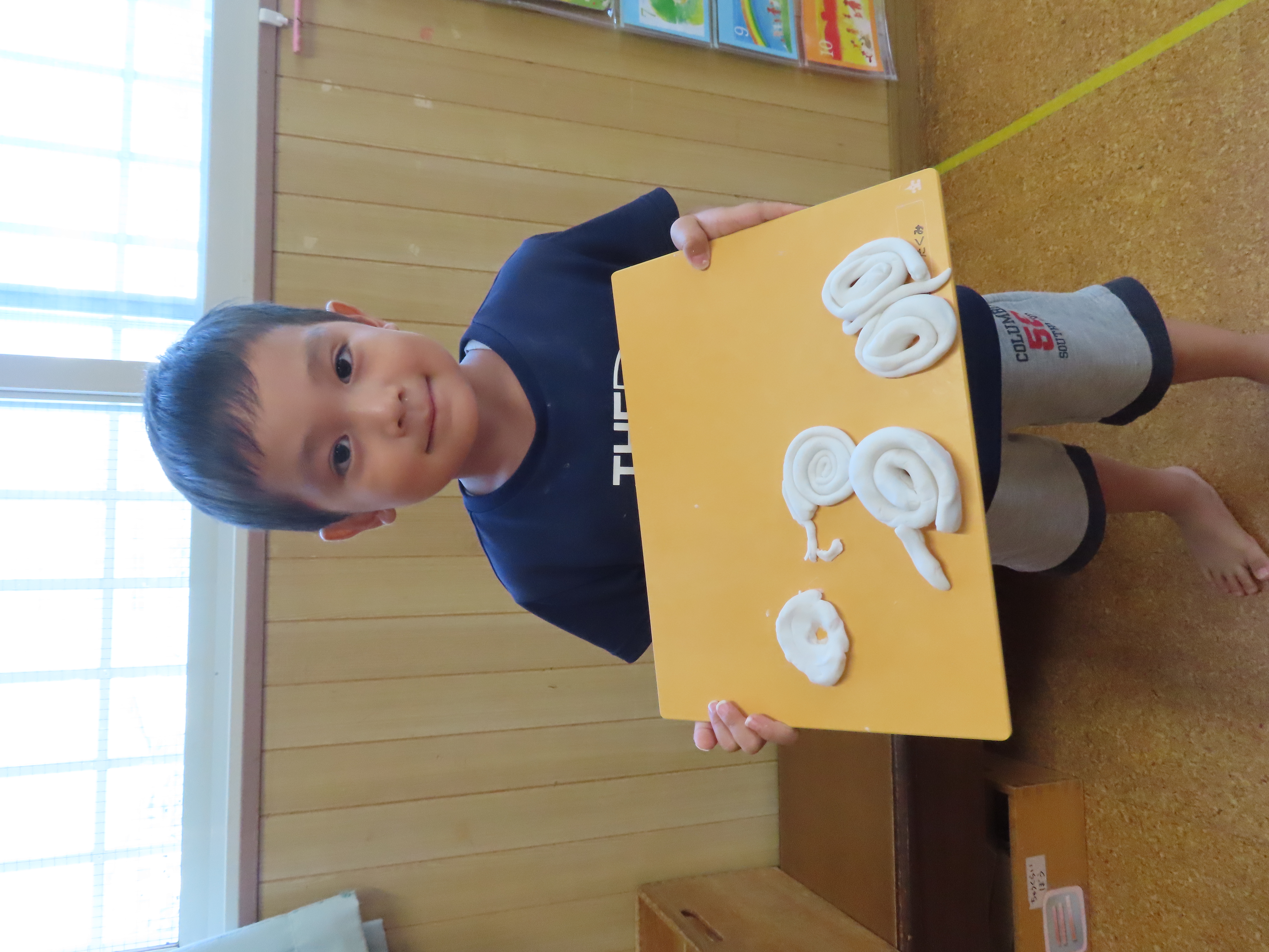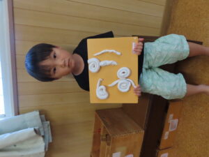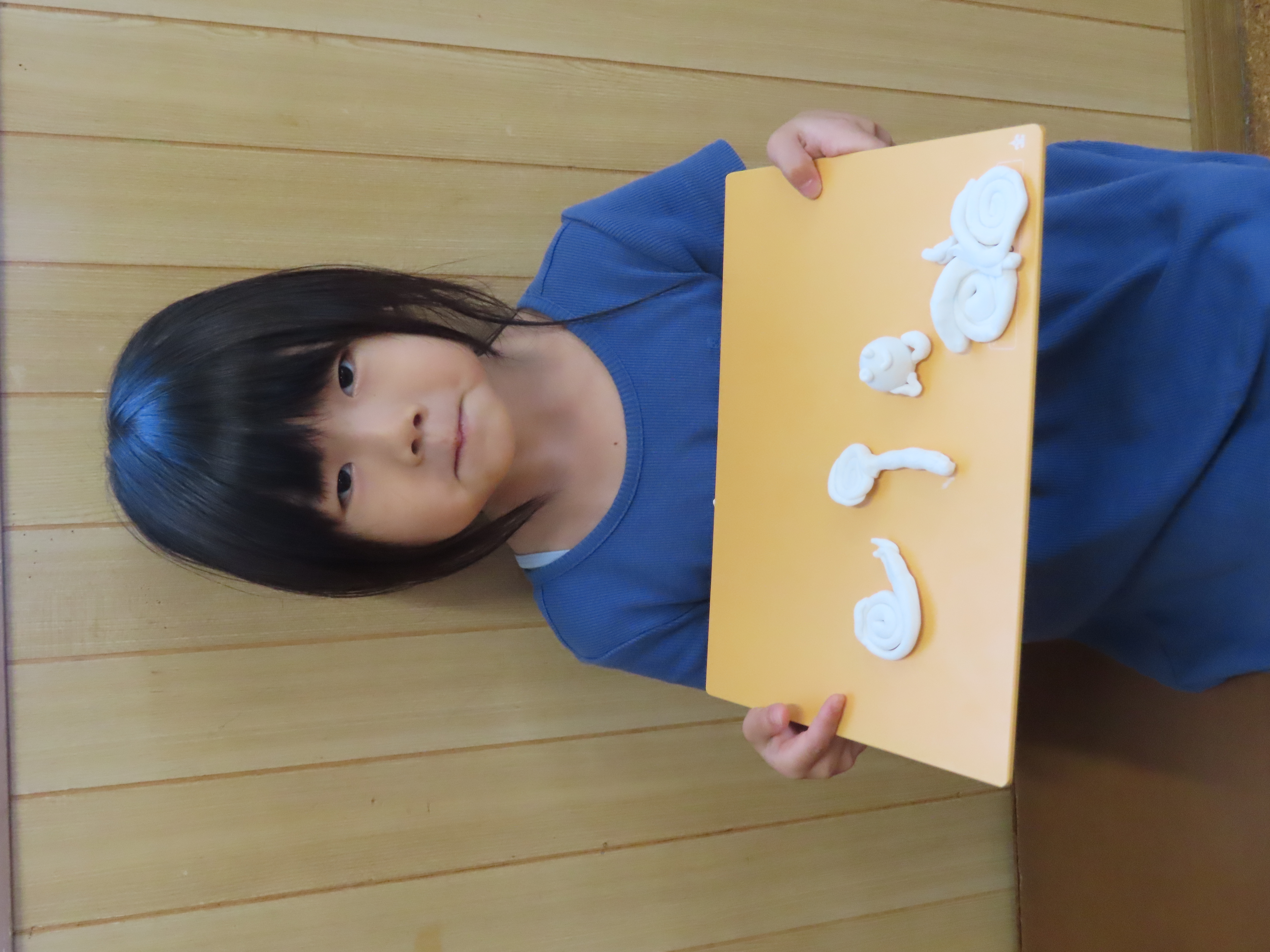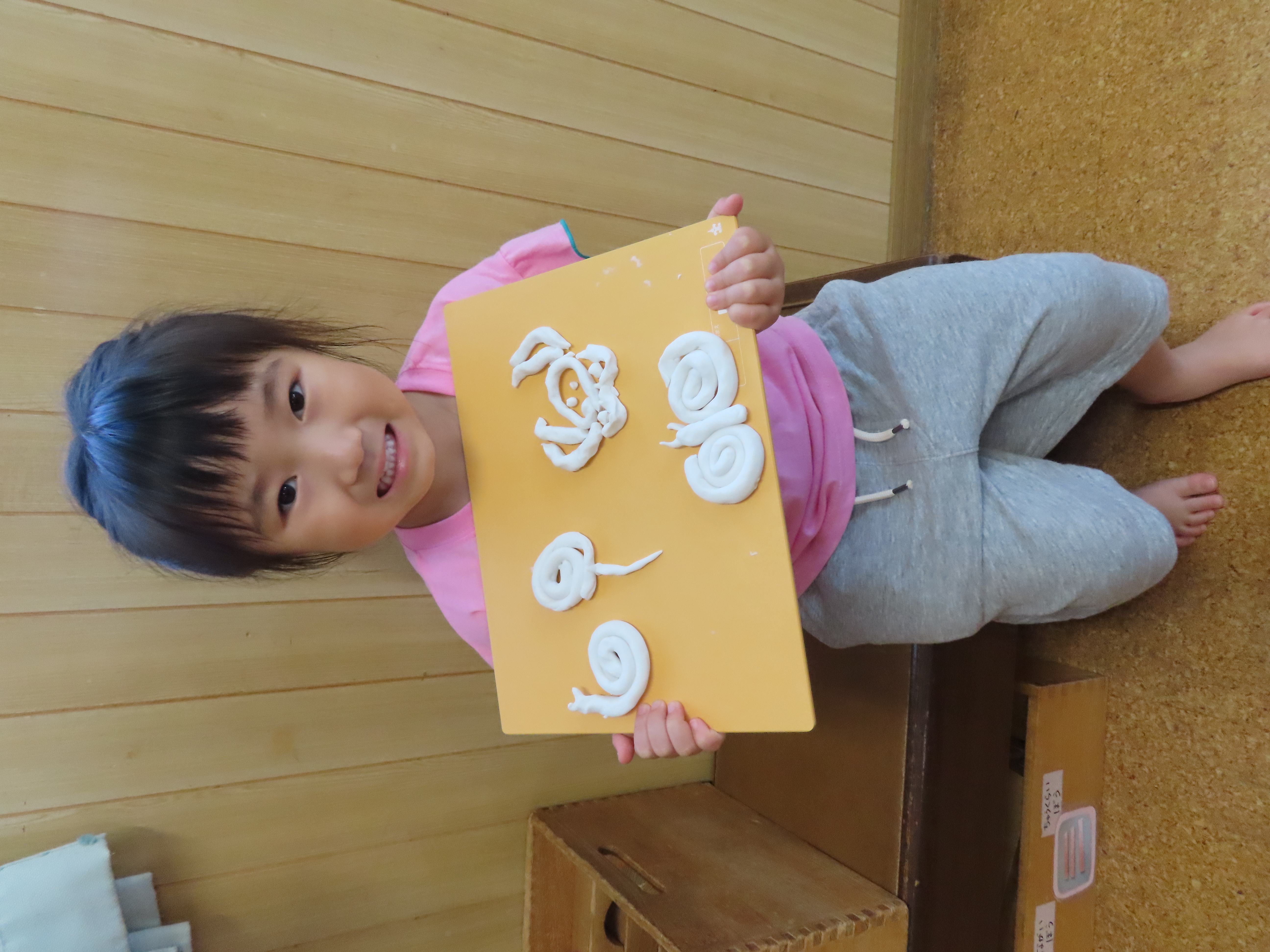 ながい棒を5本作って、1本目は、かたつむり。2本目は、ペロペロキャンディー。3本目と4本目をつかってちょうちょ。
