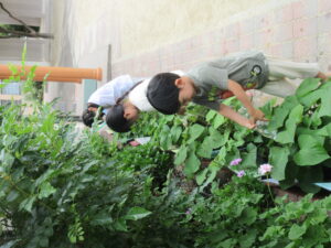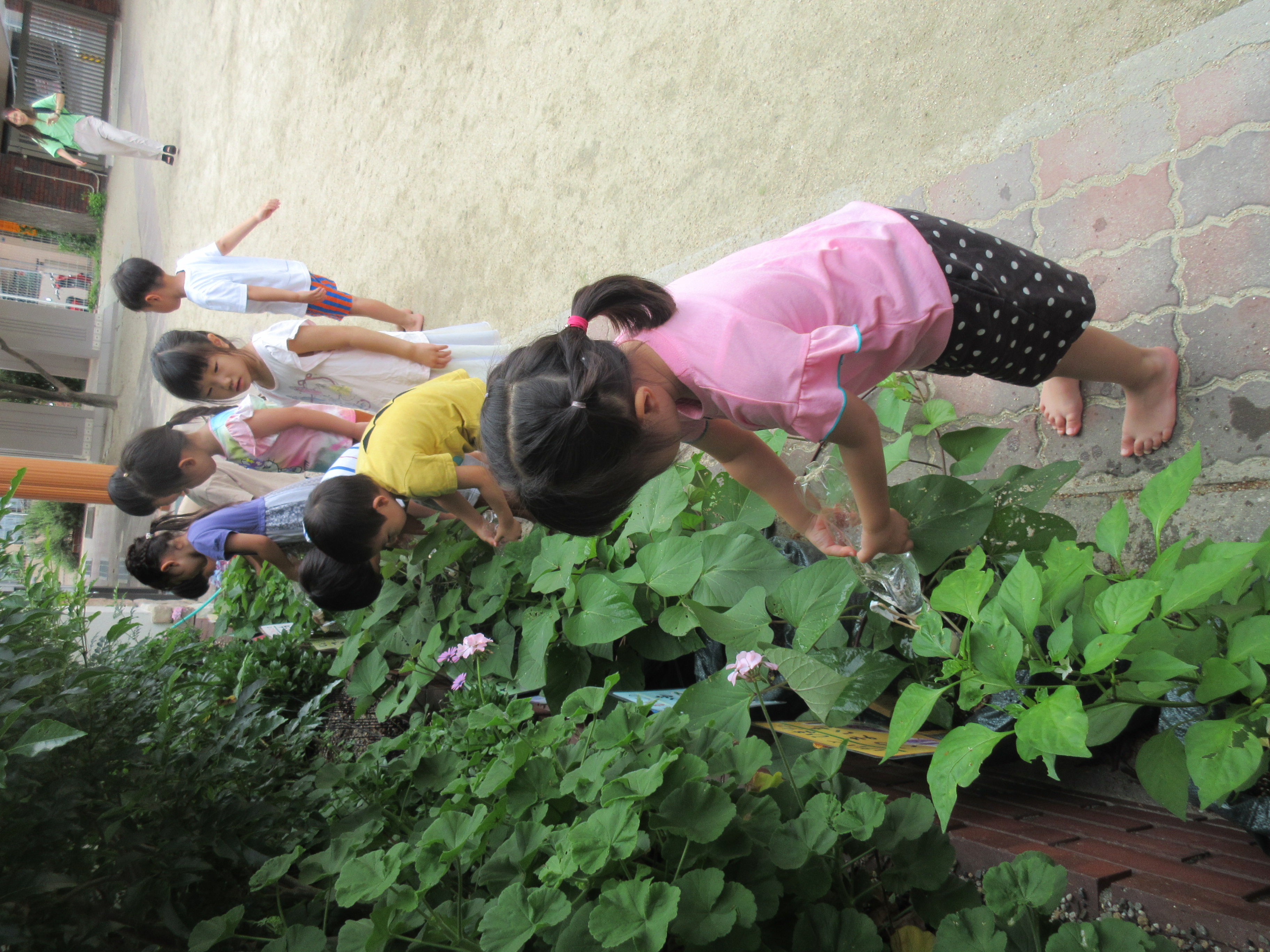 葉っぱが大きくなって、名前がみえないよーなんていいながら、一生懸命お水やりを頑張っている子どもたちです。
