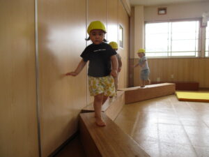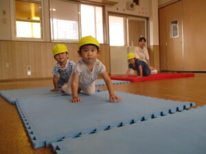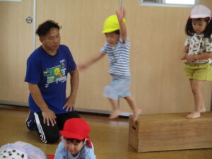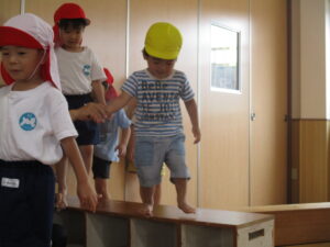 金曜日の体育あそびでたんぽぽ組さんと一緒に体をいっぱい動かして室内でサーキット遊びをしました。