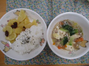 今日の給食はご飯・重ね煮・豆腐中華煮でした。