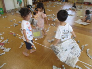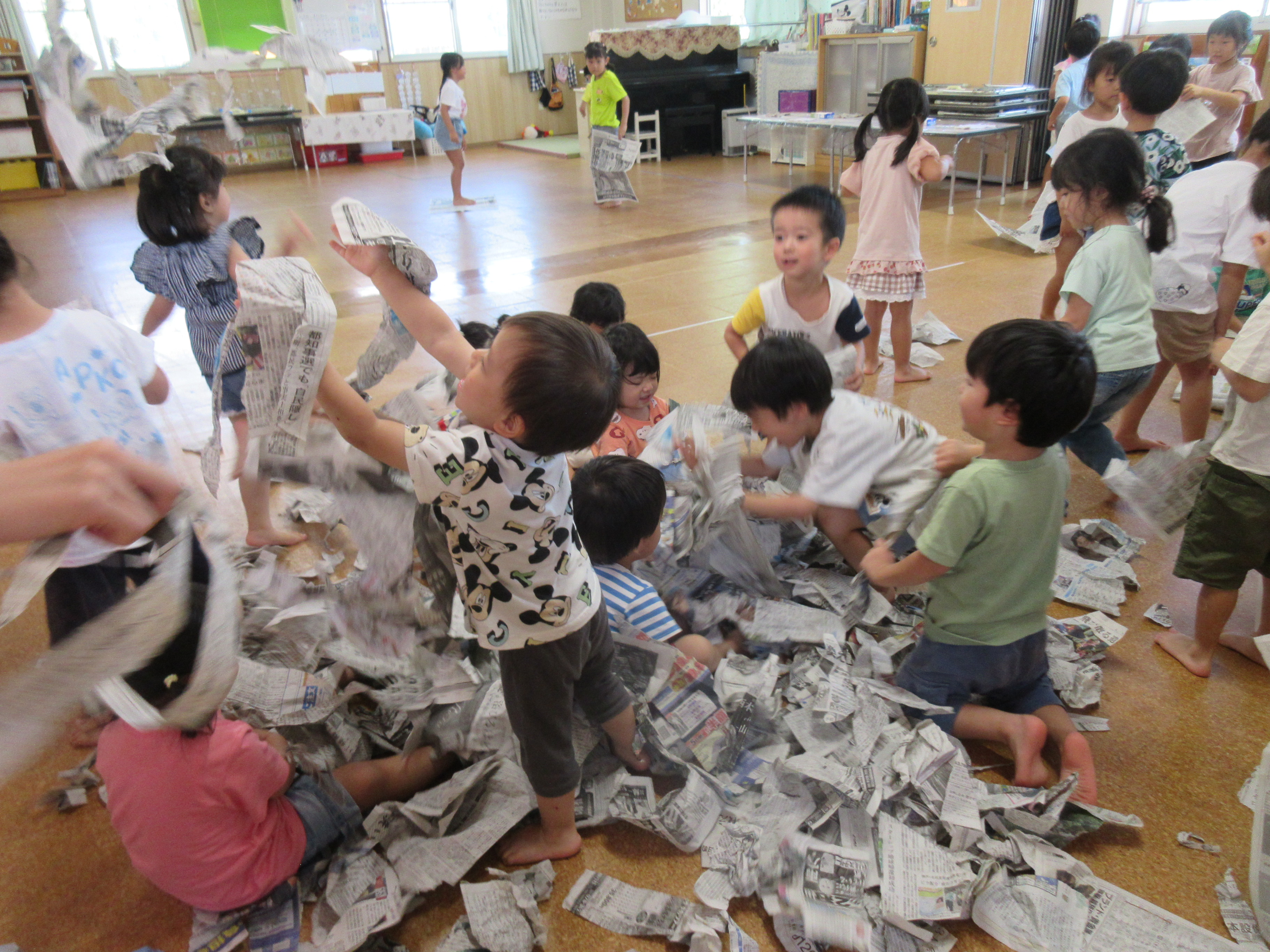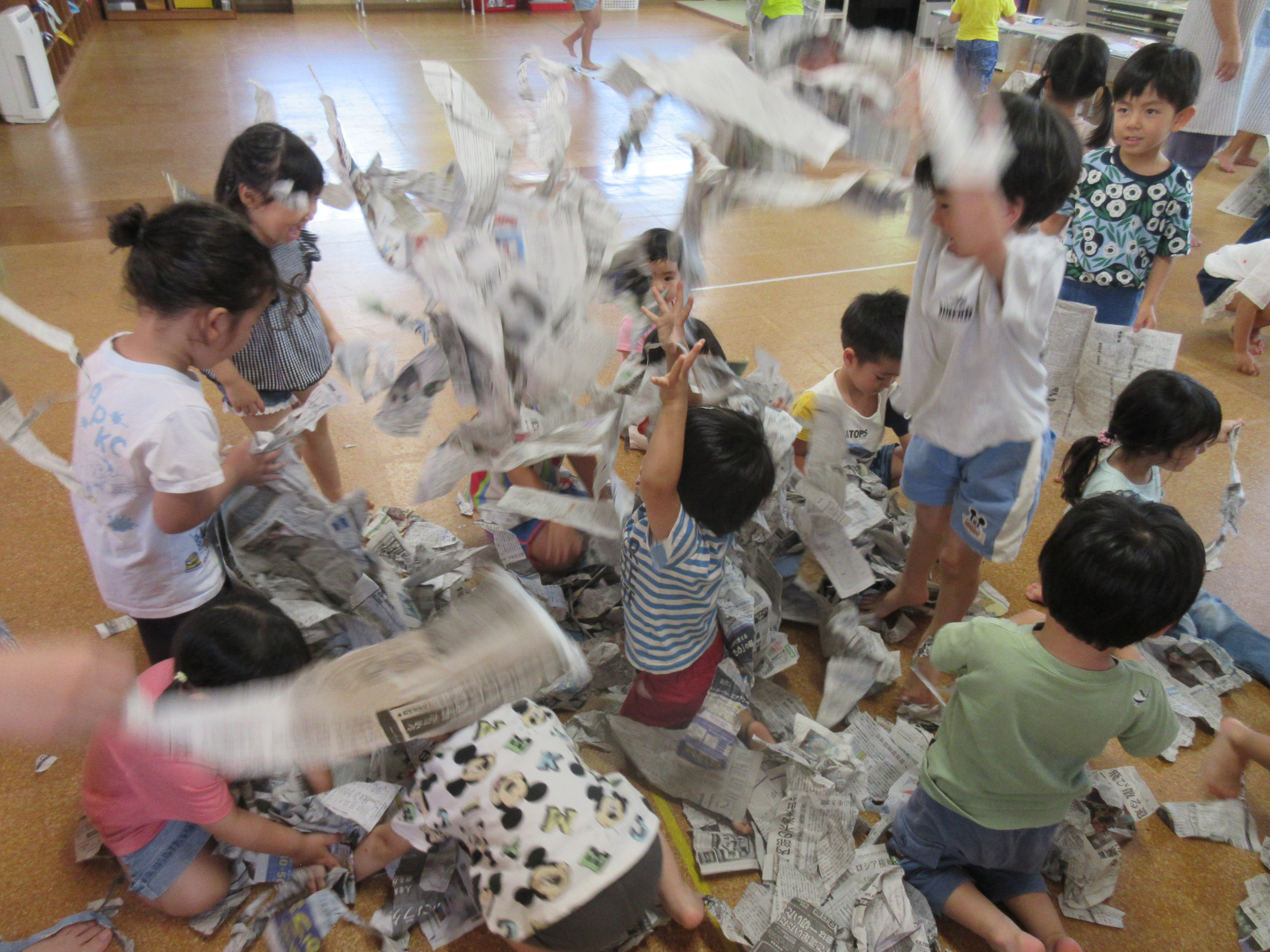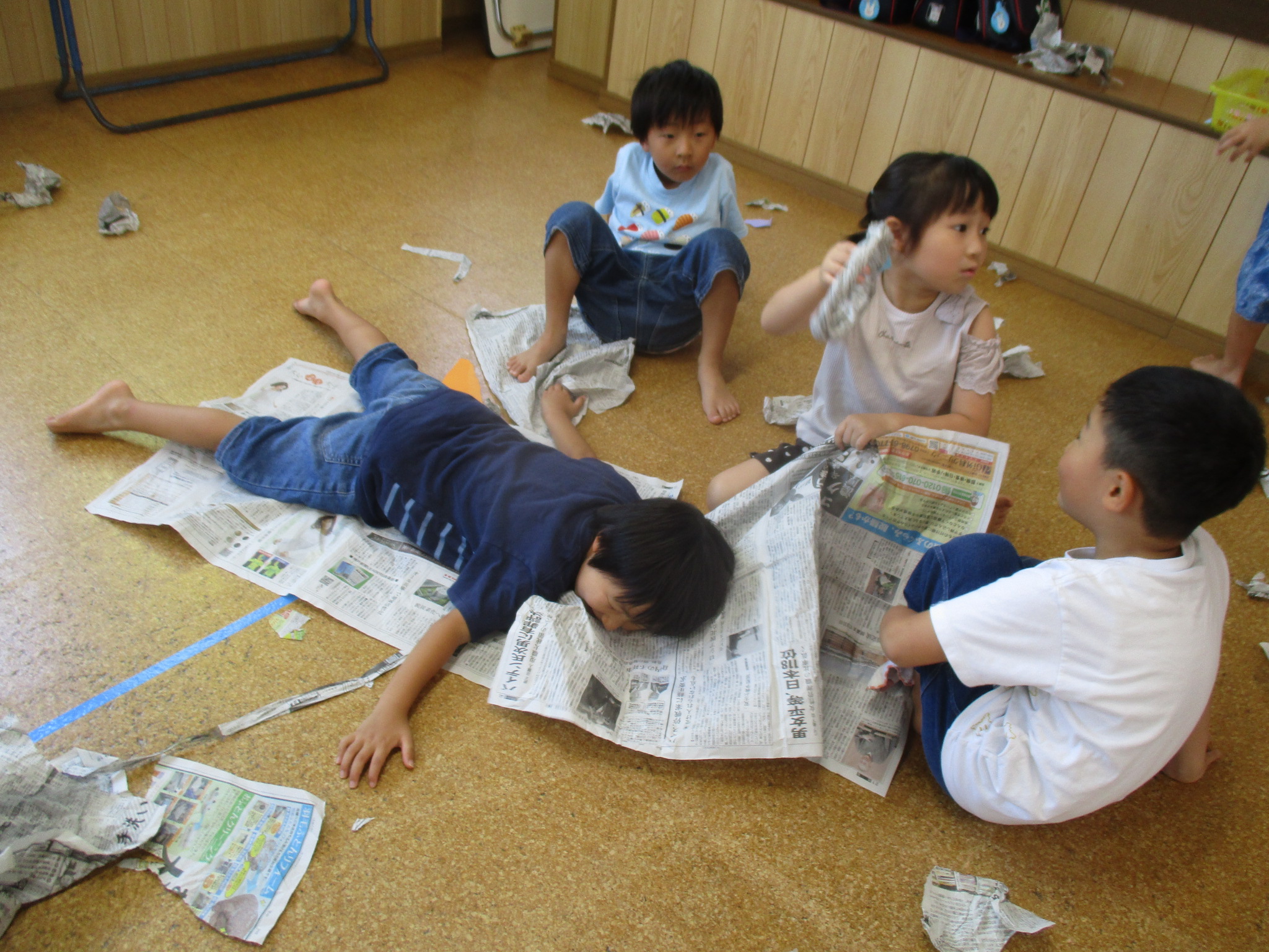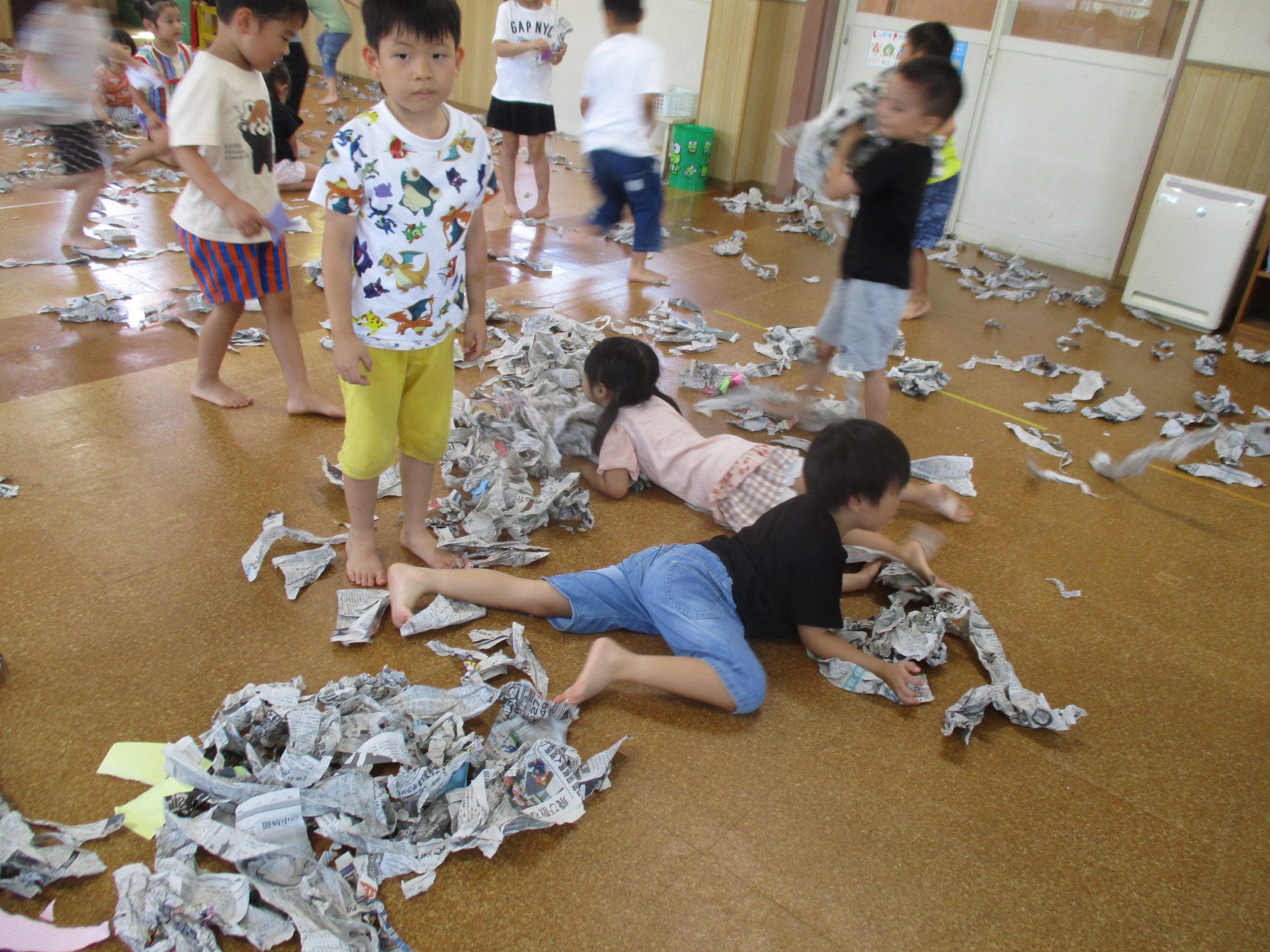 新聞紙をちぎったり、丸めたり、色々な遊び方をしていた子どもたち!画用紙をテープや糊を使って自由に張り付けたり、新聞紙の海を作ったり、新聞ゲームをしたり、とっても楽しかったです❤