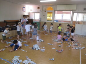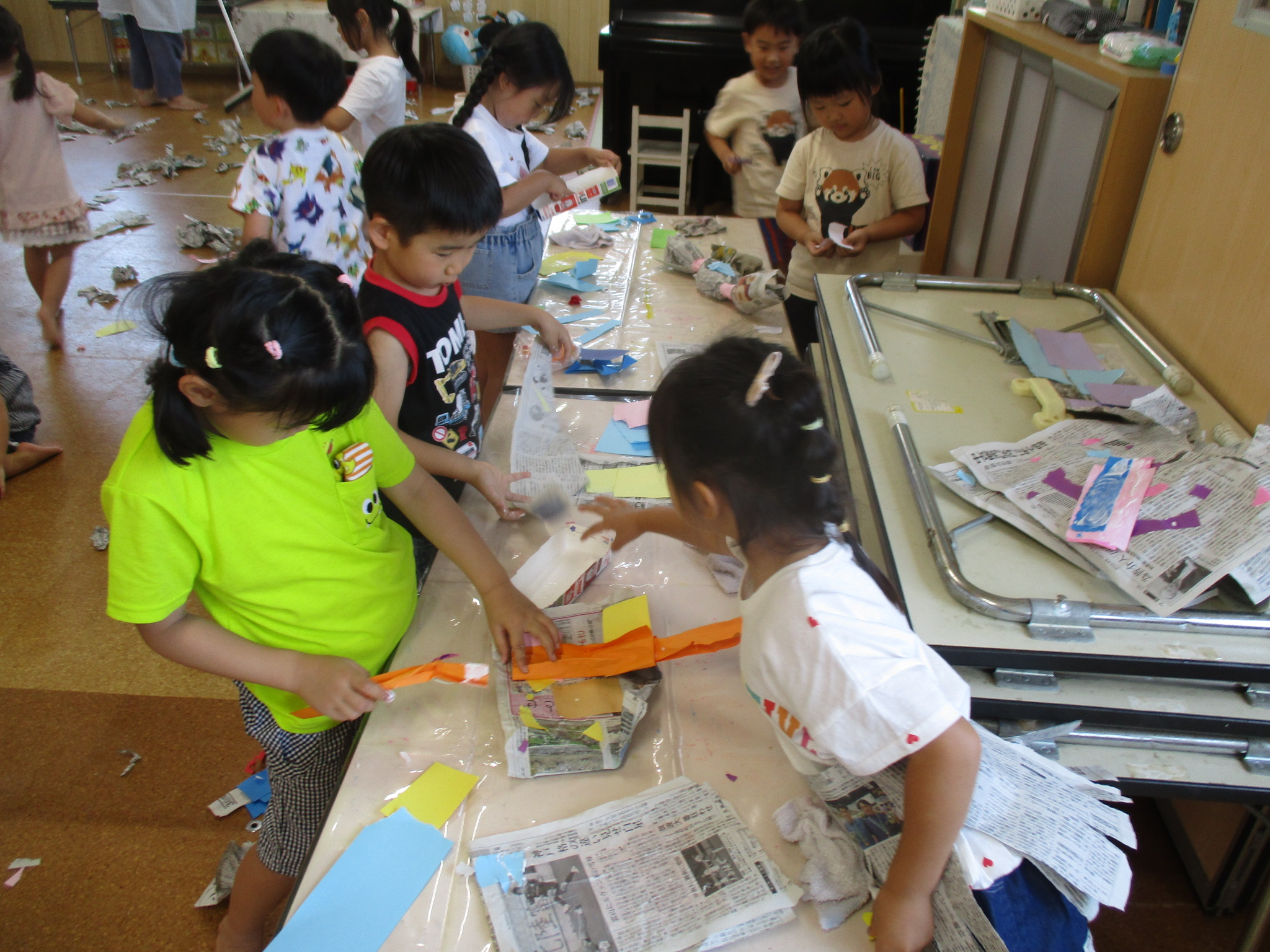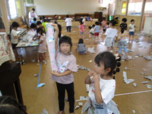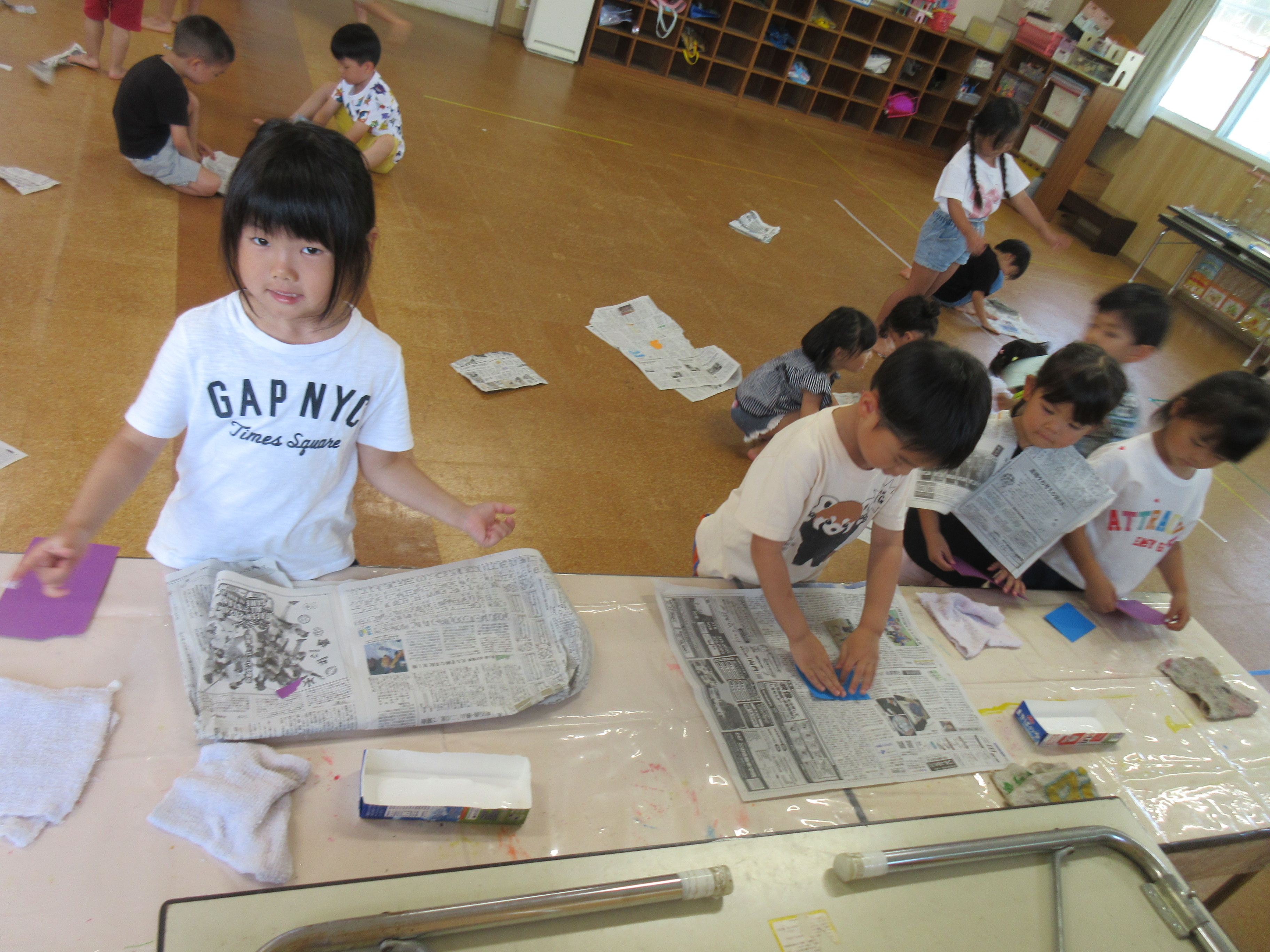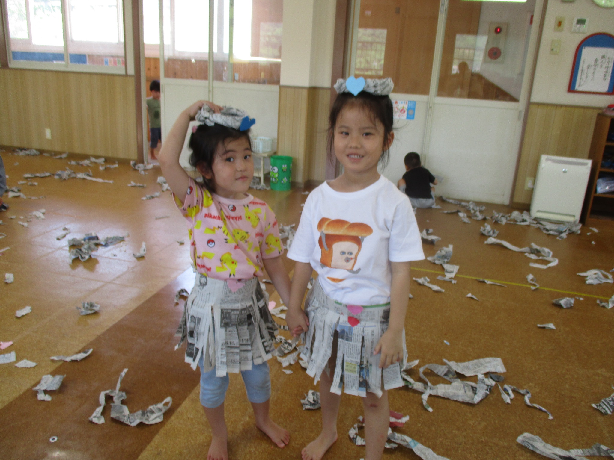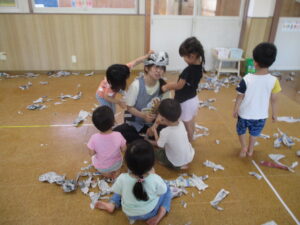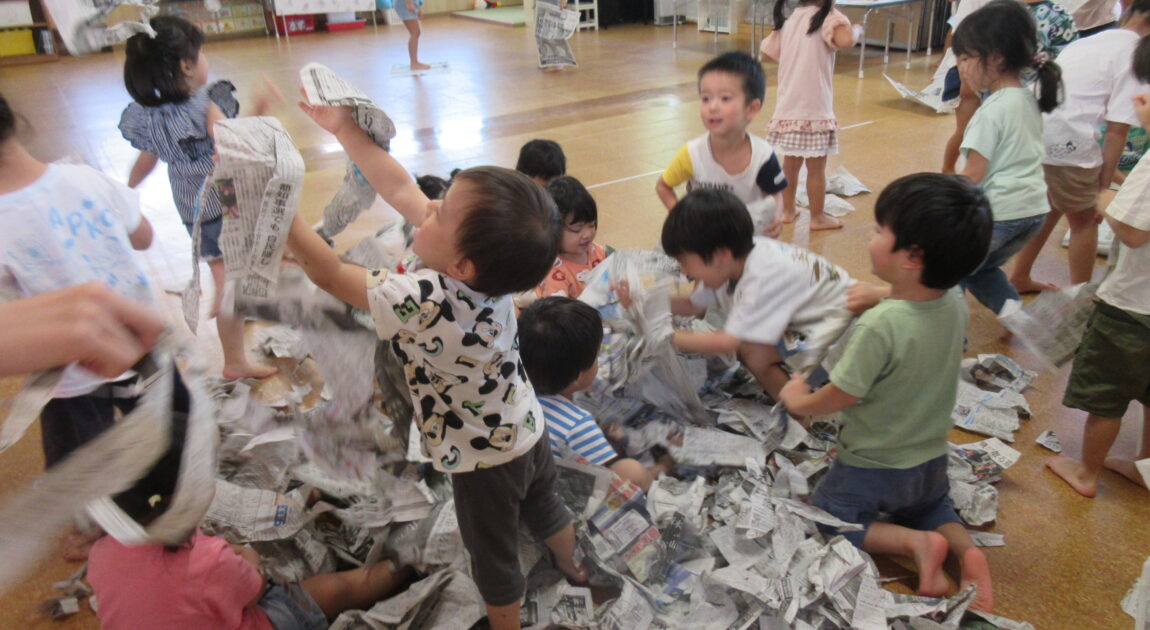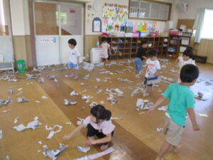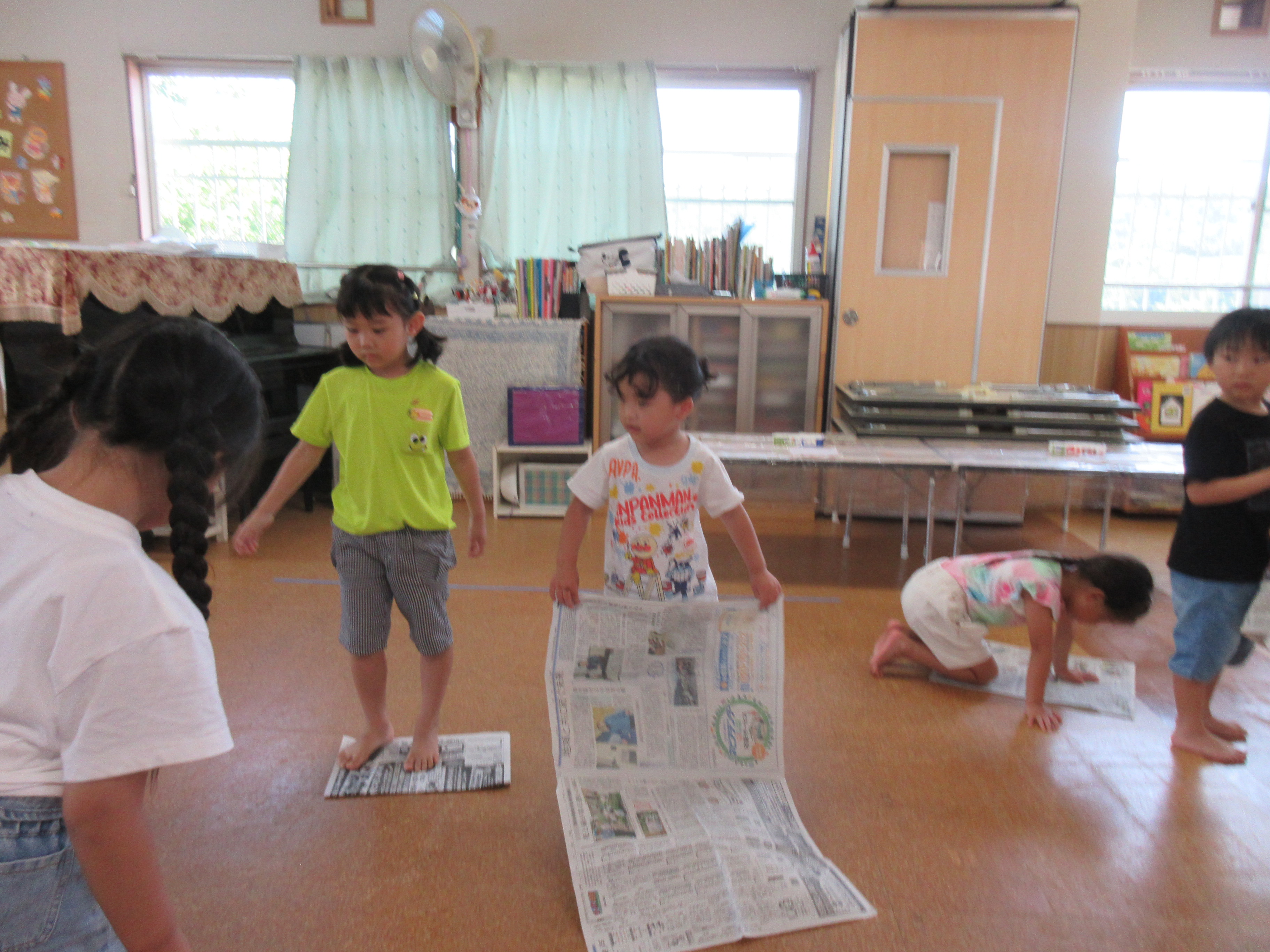 新聞紙をちぎったり、丸めたり、色々な遊び方をしていた子どもたち!画用紙をテープや糊を使って自由に張り付けたり、新聞紙の海を作ったり、新聞ゲームをしたり、とっても楽しかったです❤