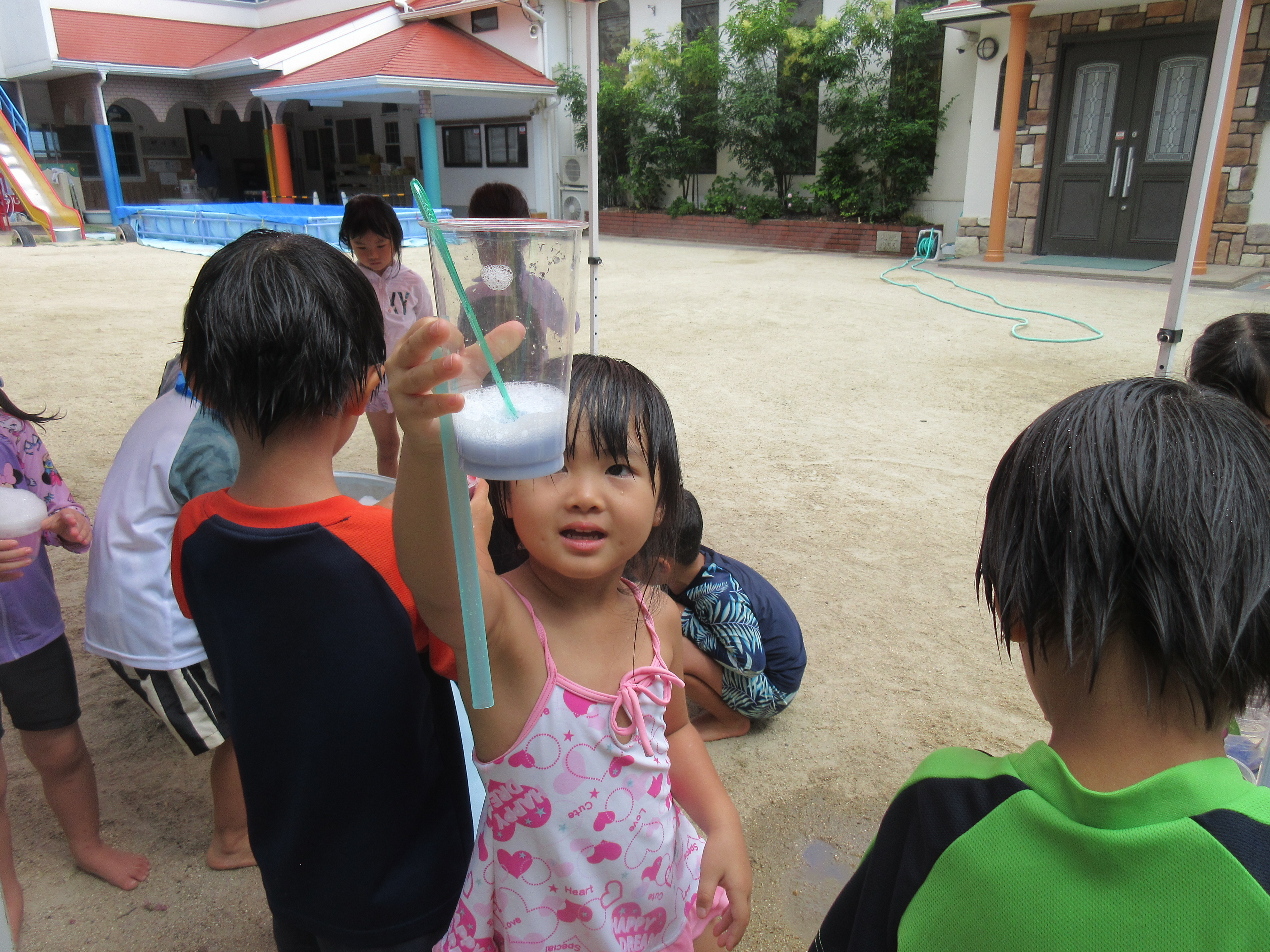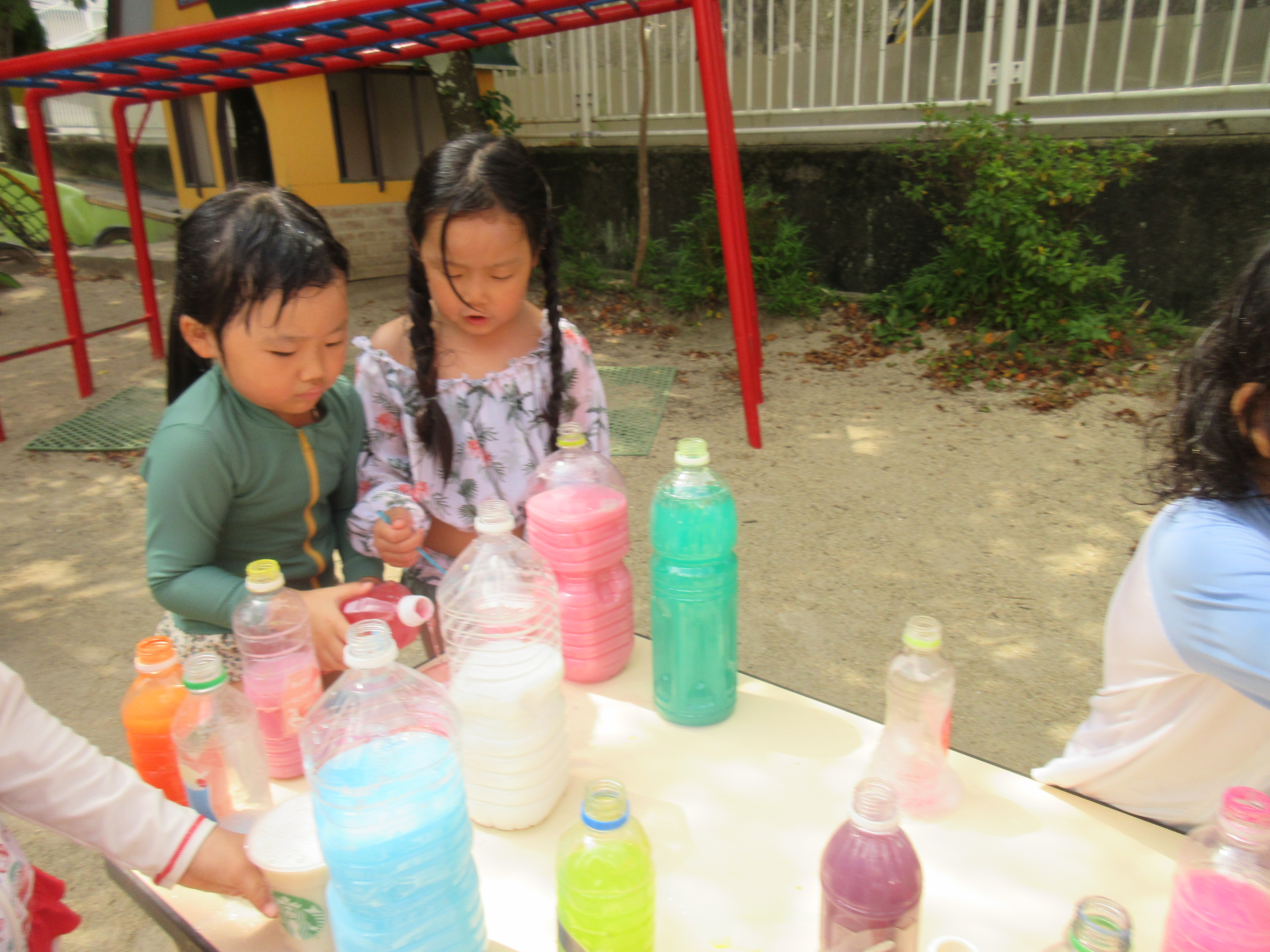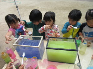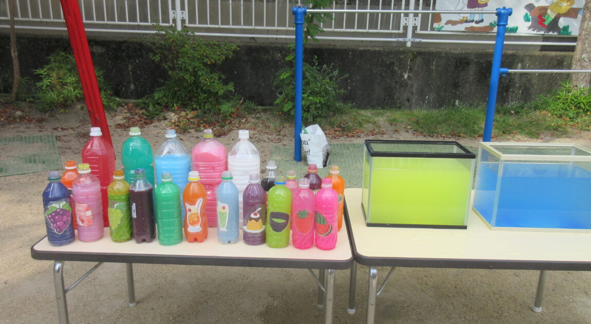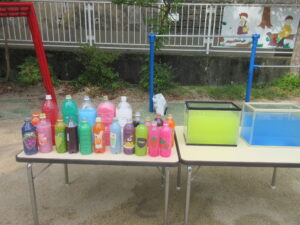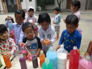 今日は、色水と泡を使ってジュースを作って遊びました♡