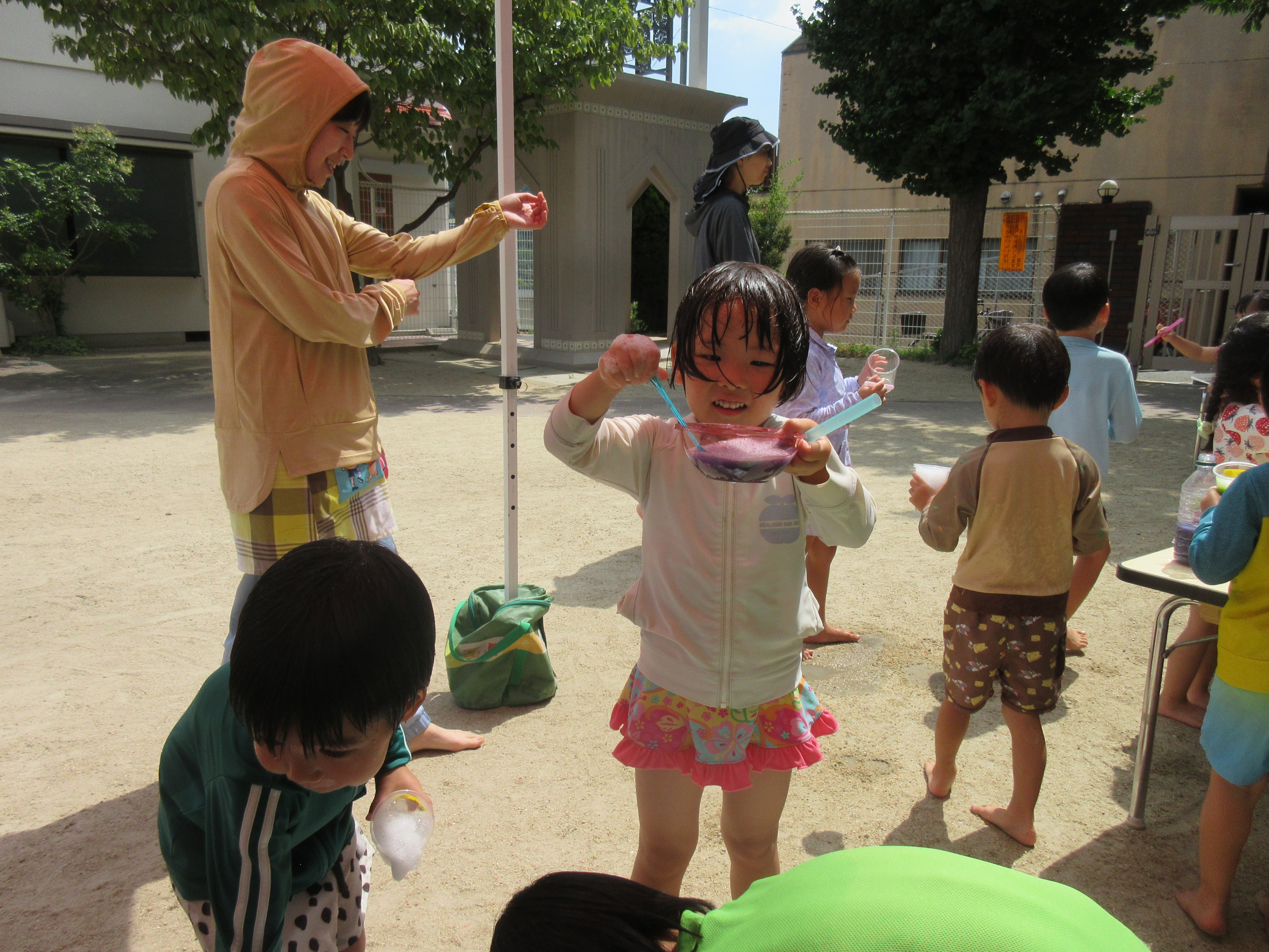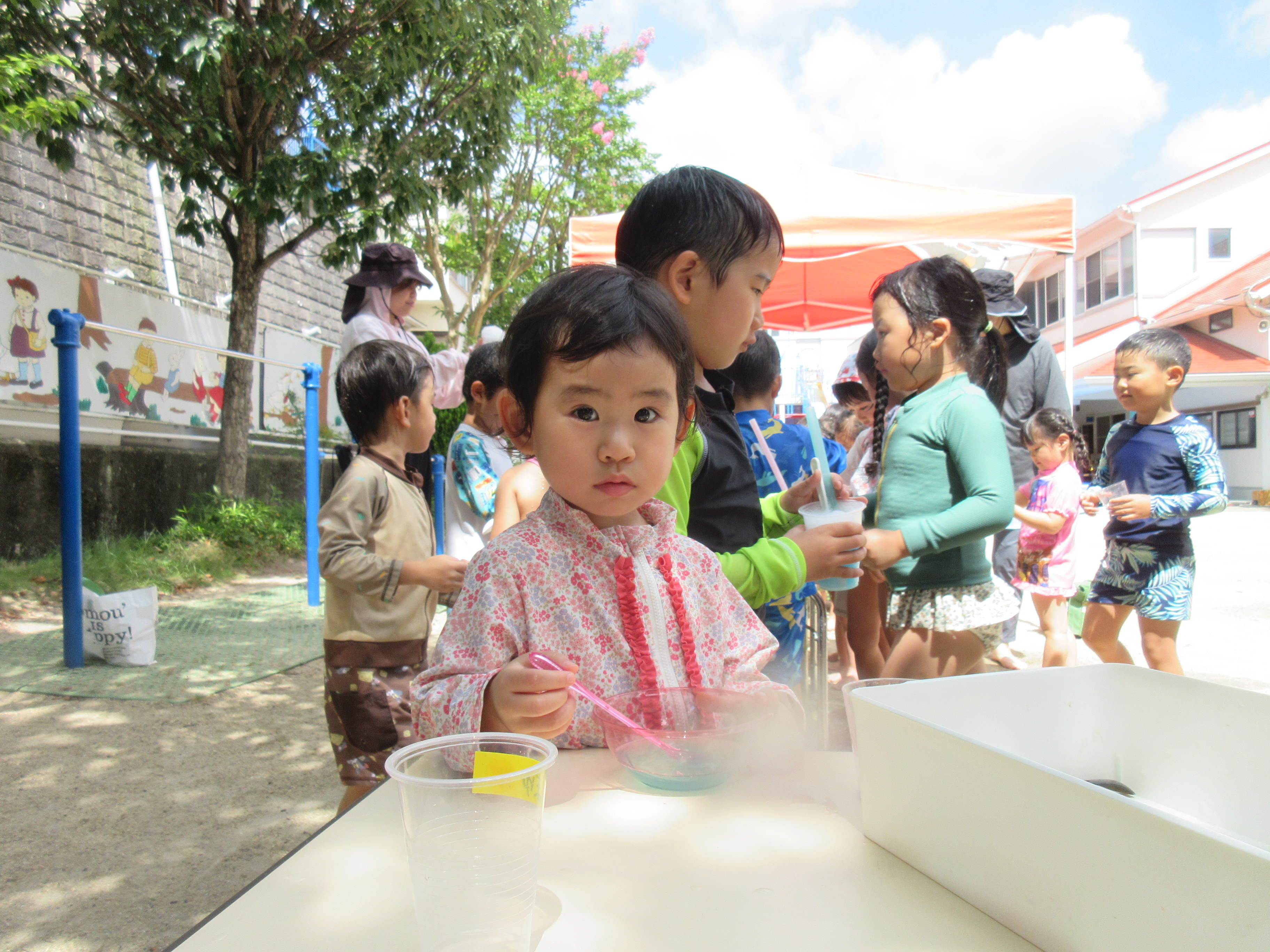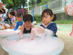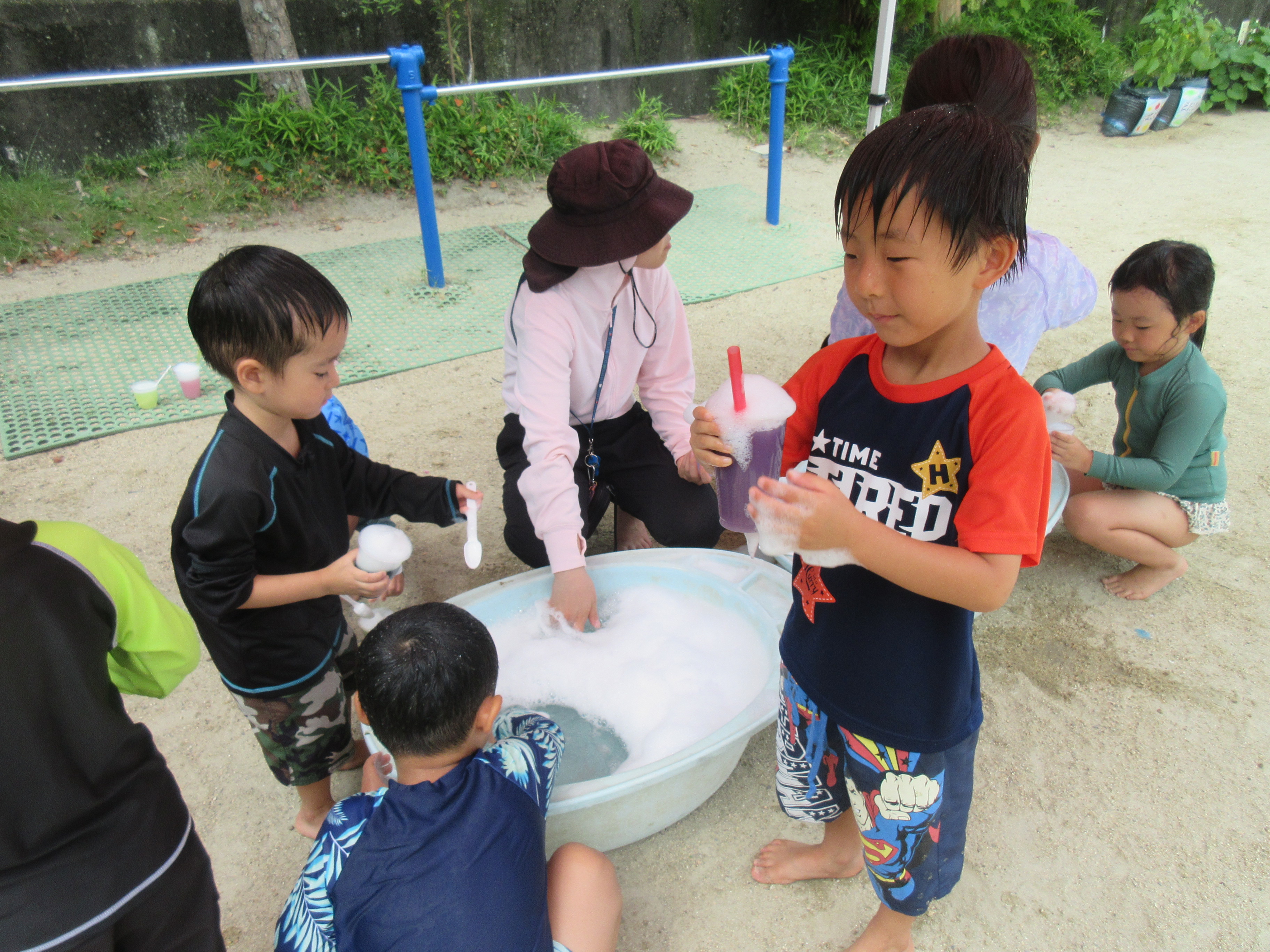 今日は、色水と泡を使ってジュースを作って遊びました♡
