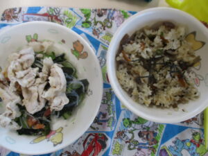 今日の給食はひじきごはん・豚しゃぶサラダでした。