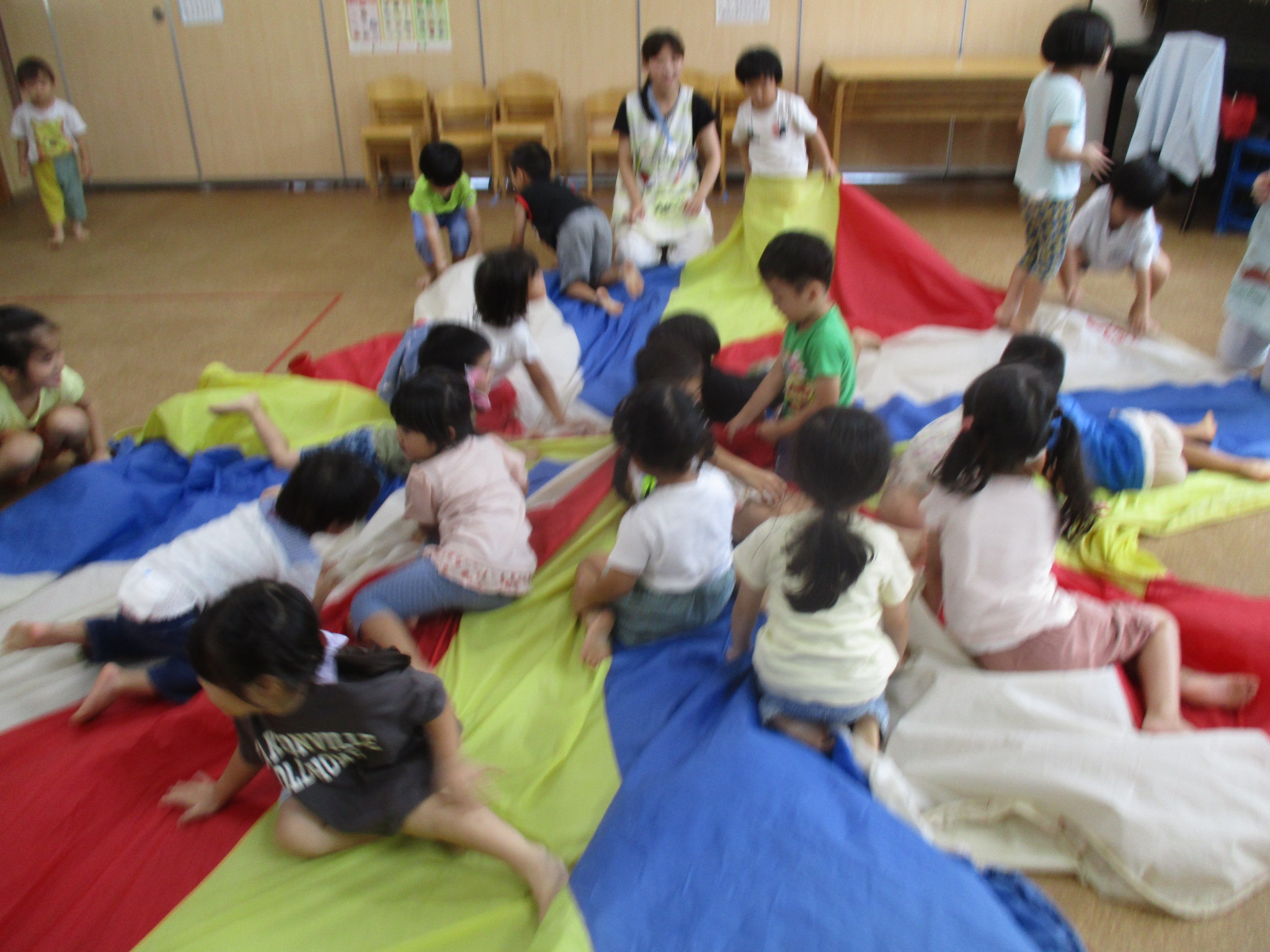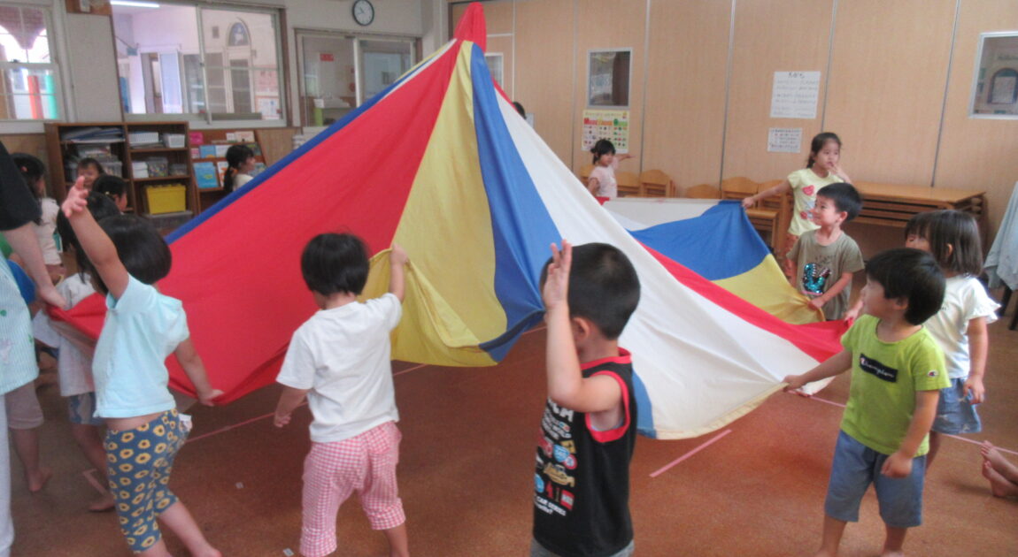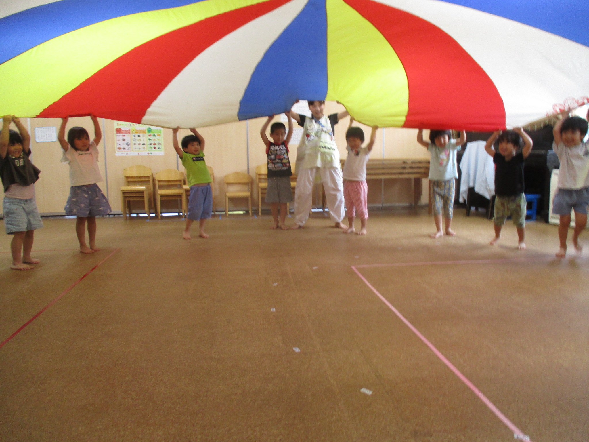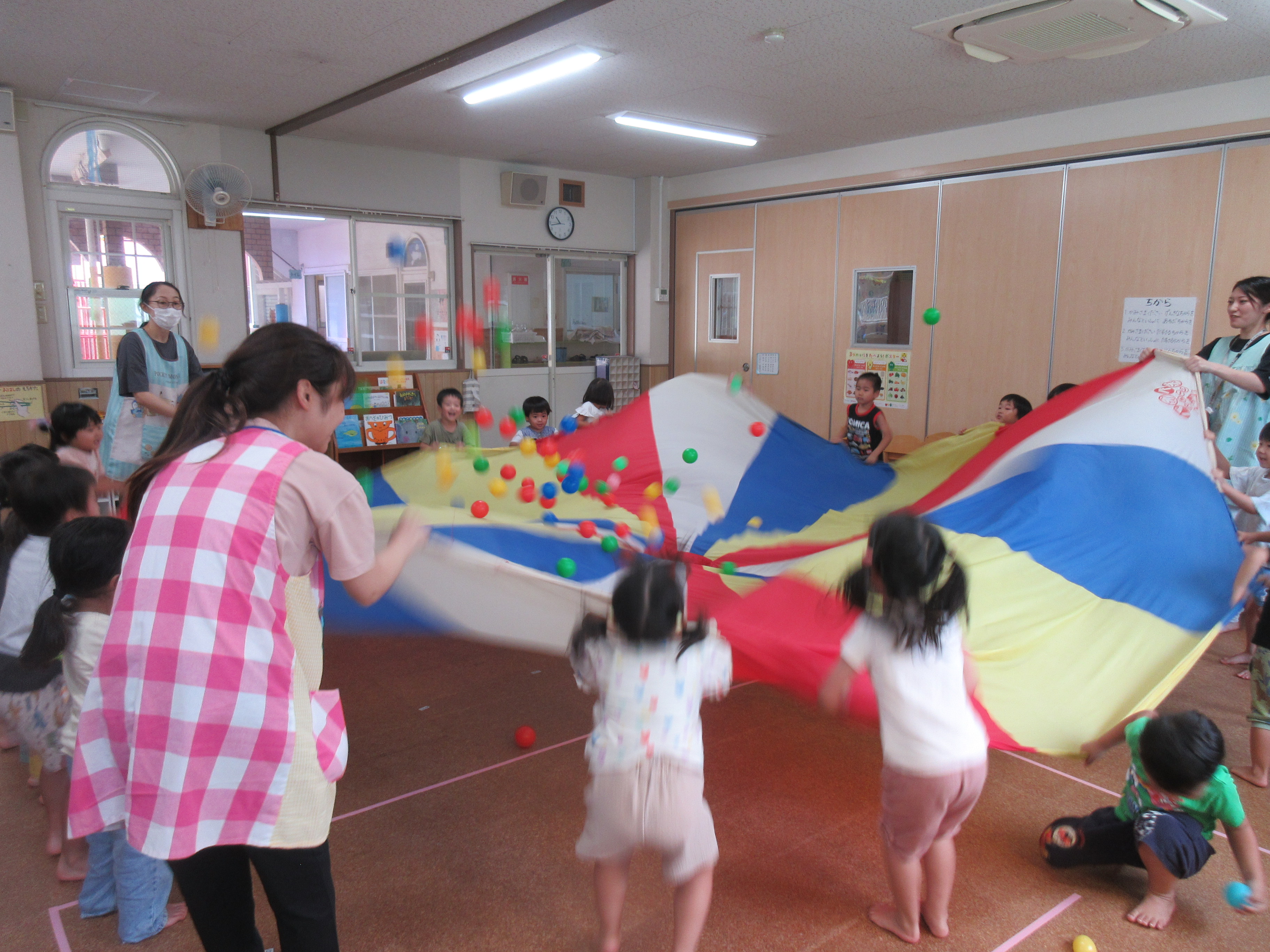 ひよこどんぐり組、たんぽぽ組、すみれ組はリトミックやお集まりみんなでパラバルーンをして遊びました(^^)/パラバルーンでは中に入ったり大きなプリンを作ったり、カラーボールを飛ばしてみたり楽しそうな姿が見られました♡ゆり組は、運動会にむけて練習をしたり、お部屋でお友だちと仲良く遊んでいました!