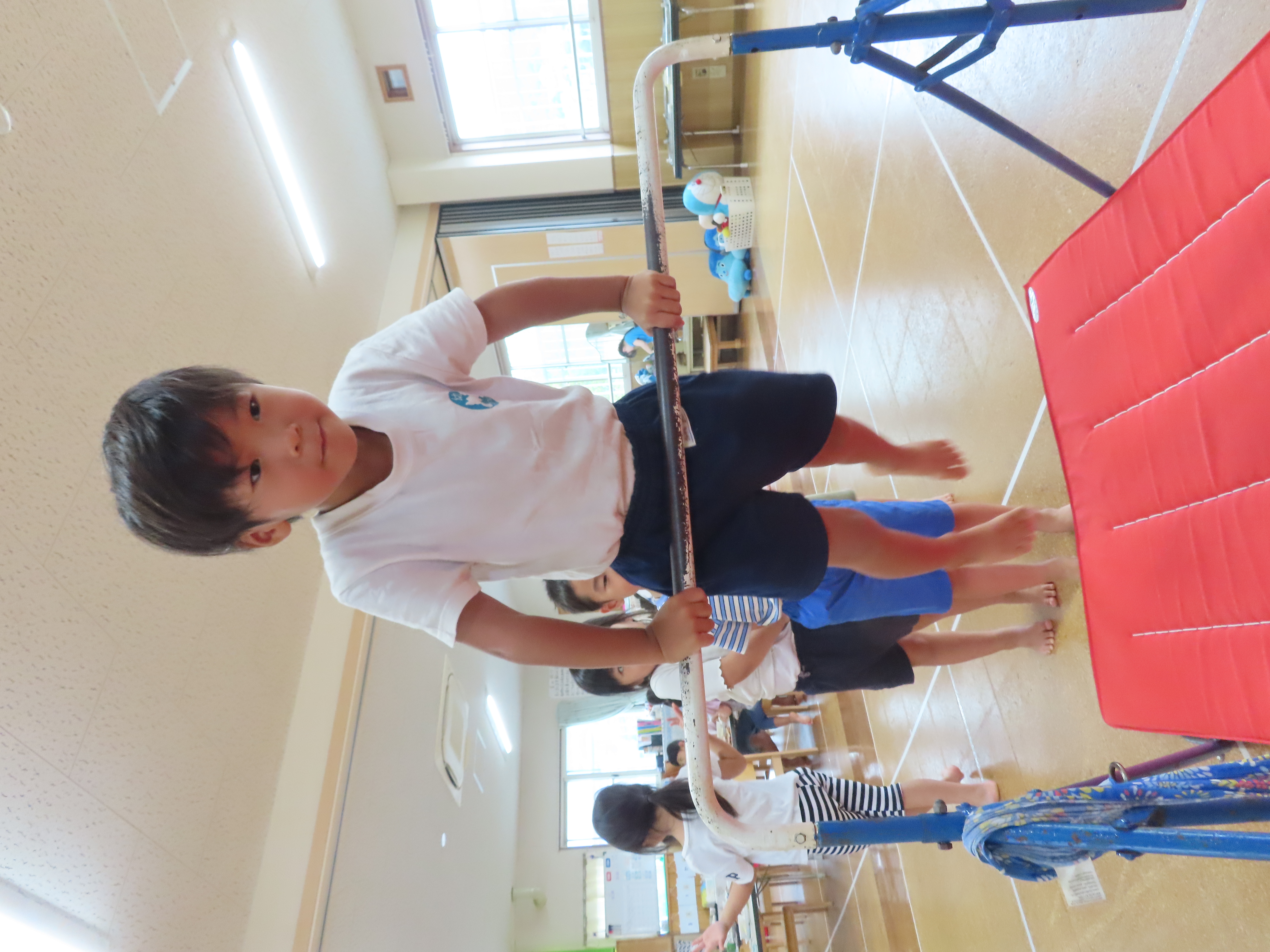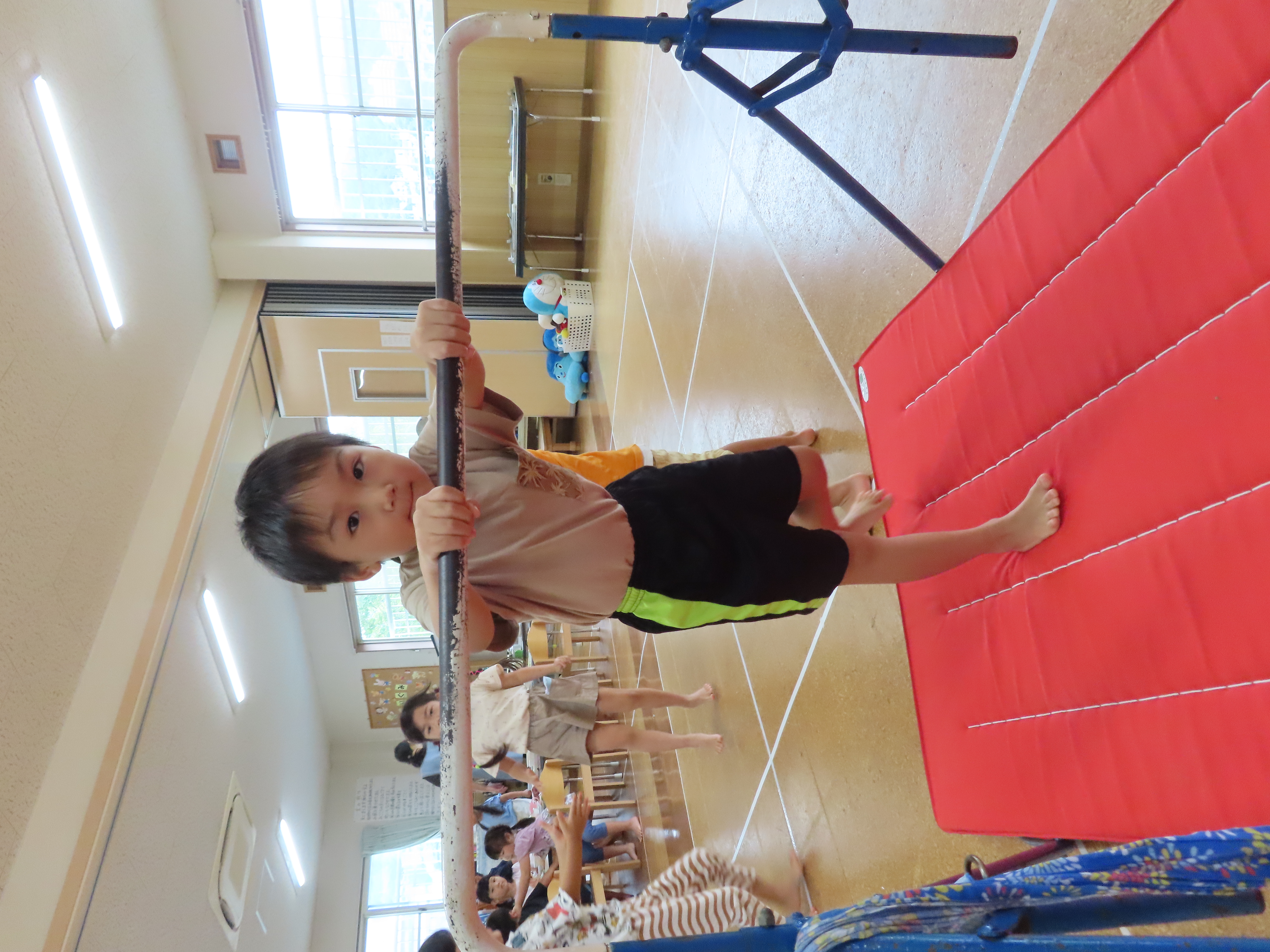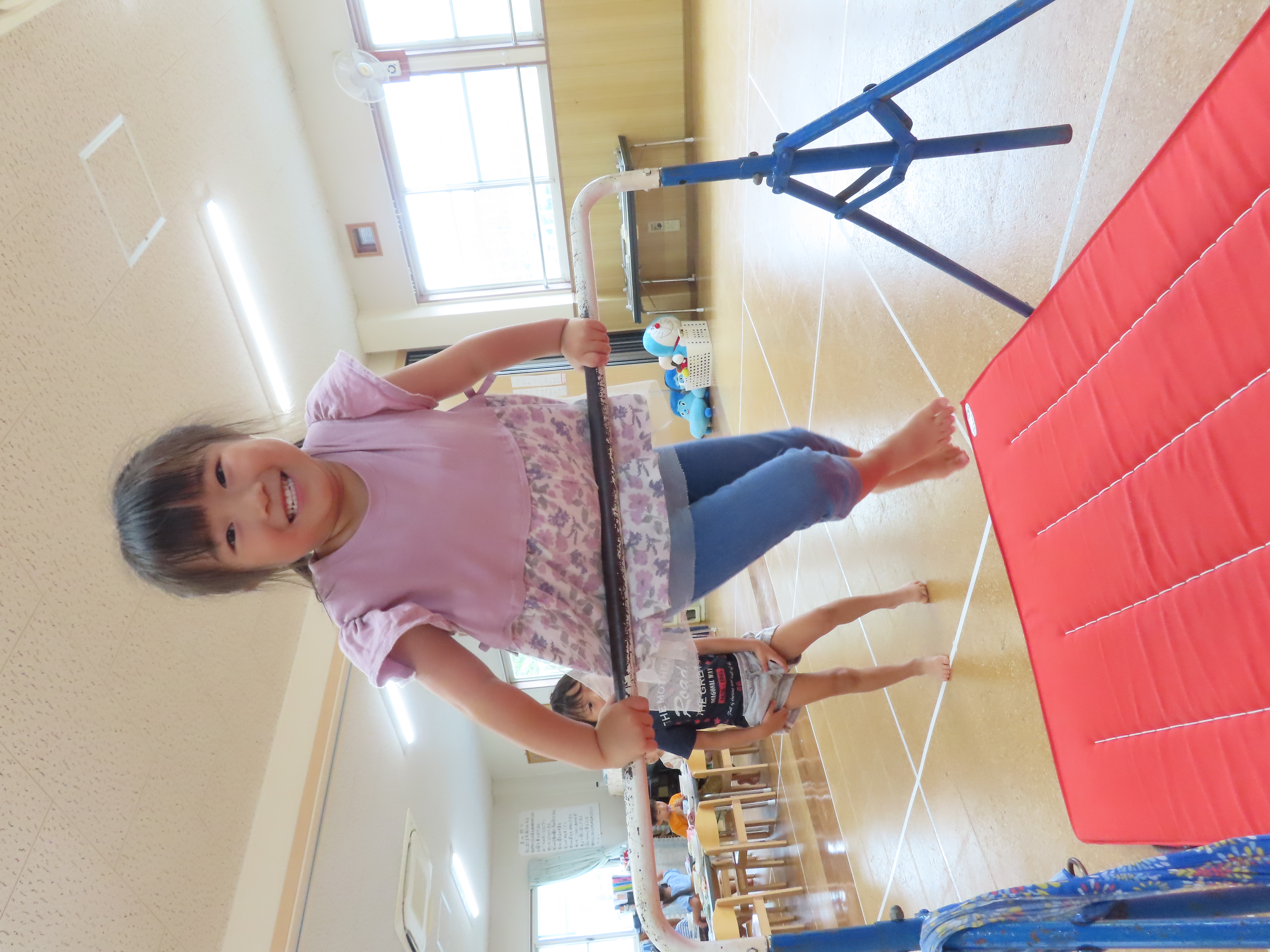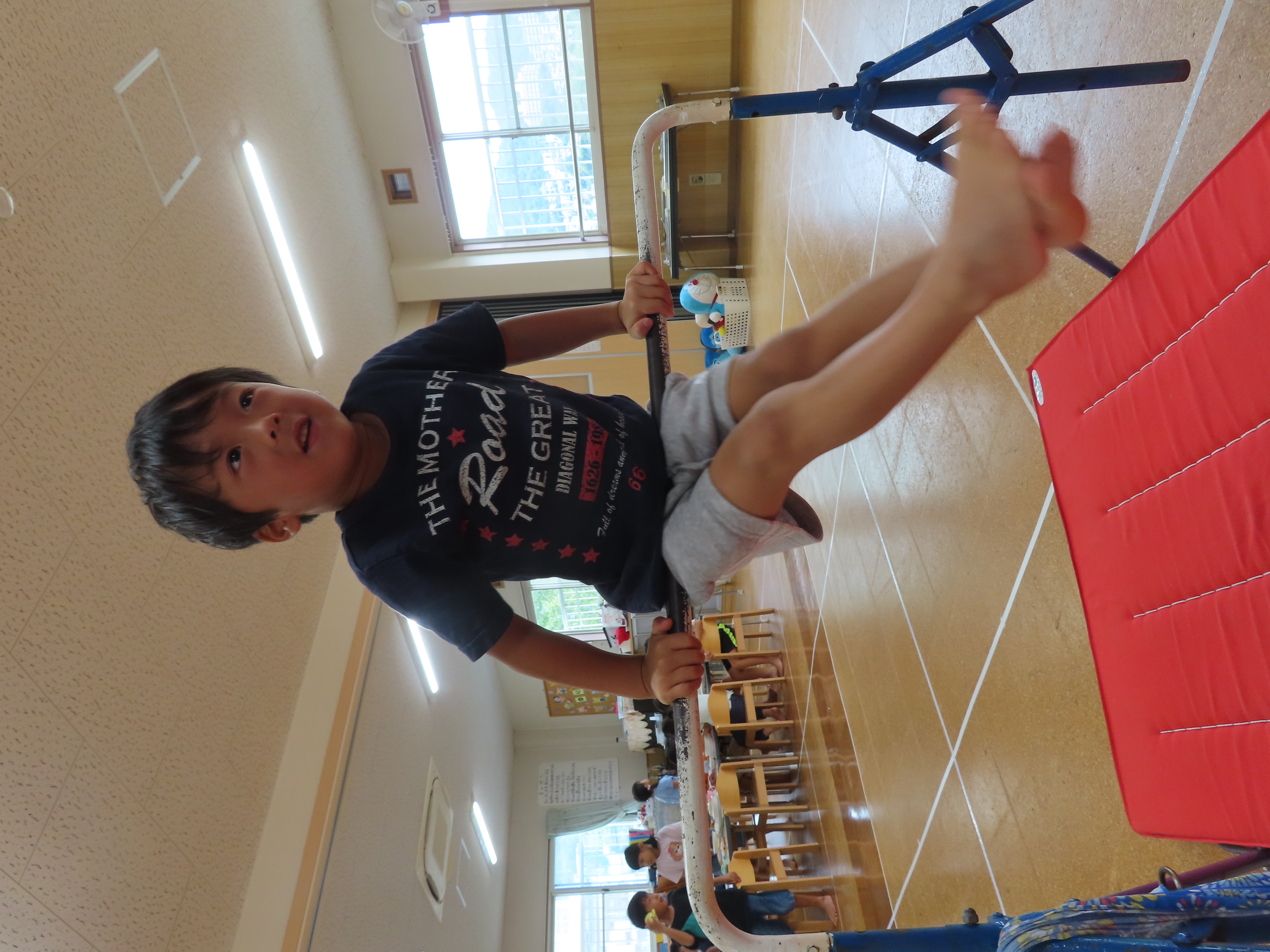 ゆりぐみの鉄棒は、逆上がりをして、そのままおりずに前回りをします。