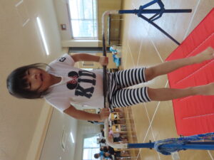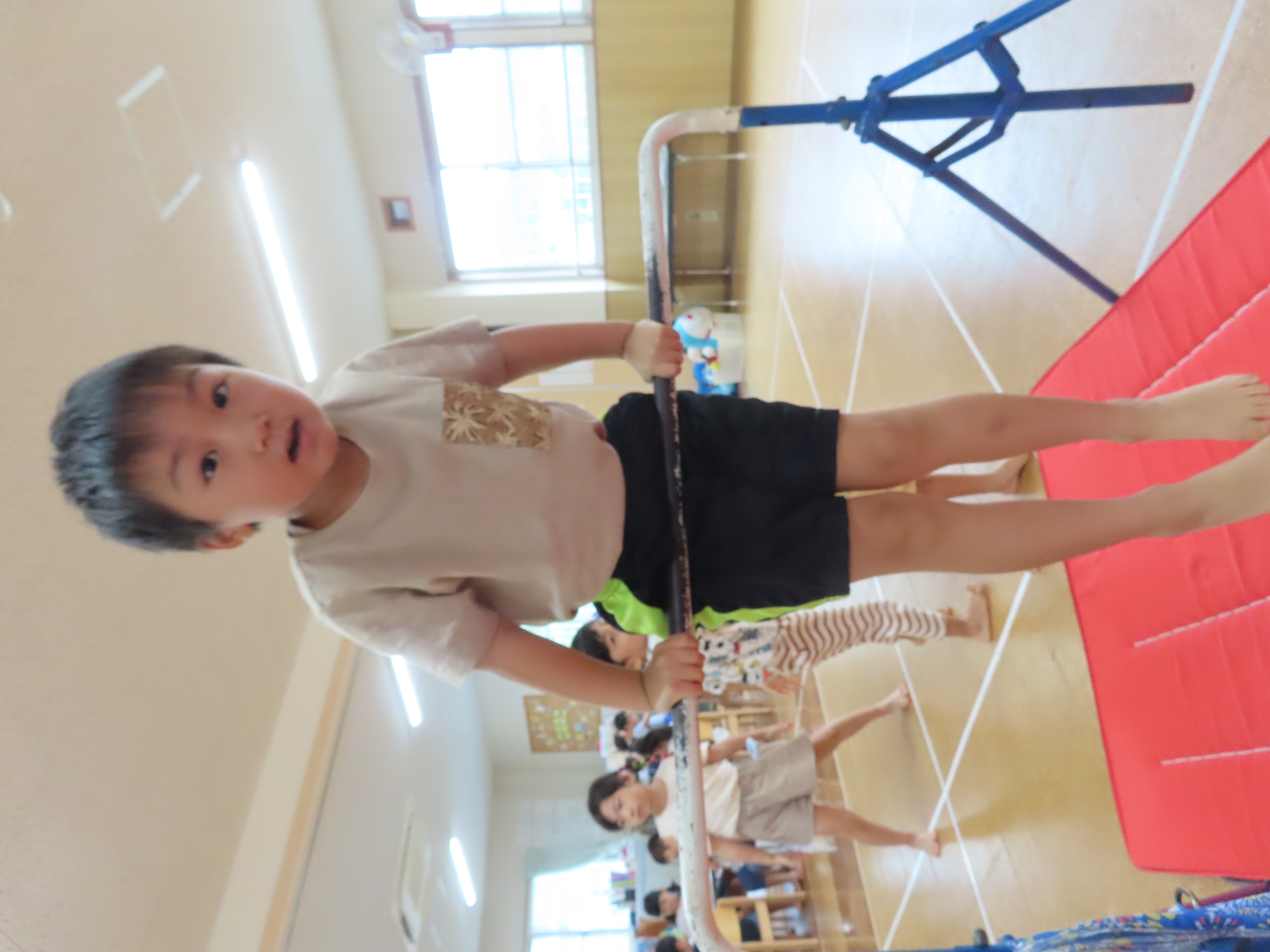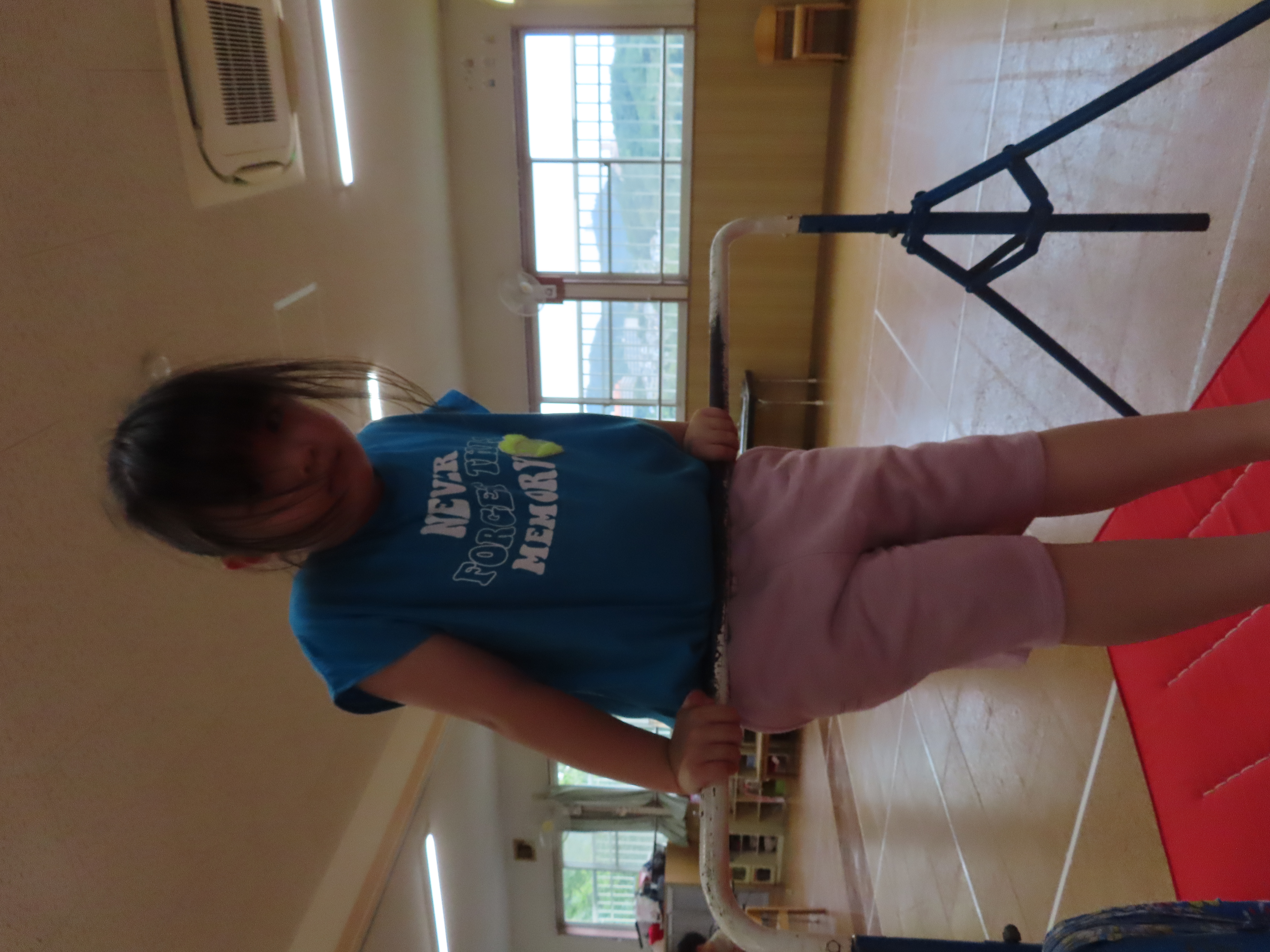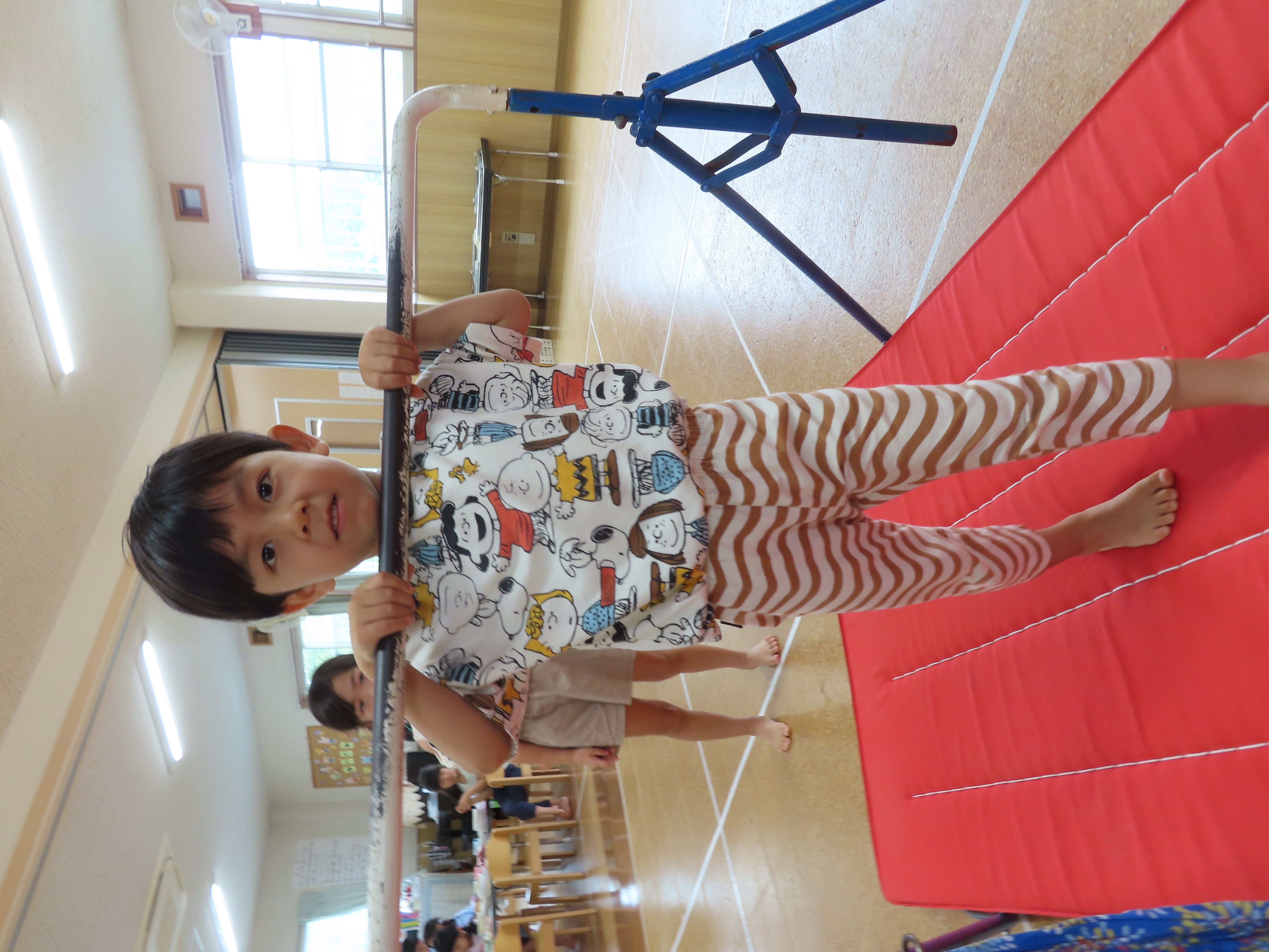 ゆりぐみの鉄棒は、逆上がりをして、そのままおりずに前回りをします。
