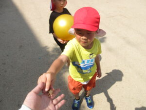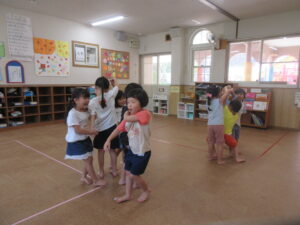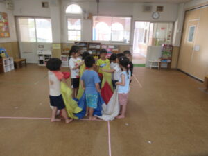 パラバルーンはみんなでタイミングを合わせたり、引っ張りながら技をすることが難しいですが、「かっこいいのみせたい!」「ママたちみてくれるかな?」といまから運動会が待ち遠しい子どもたちです(^^♪