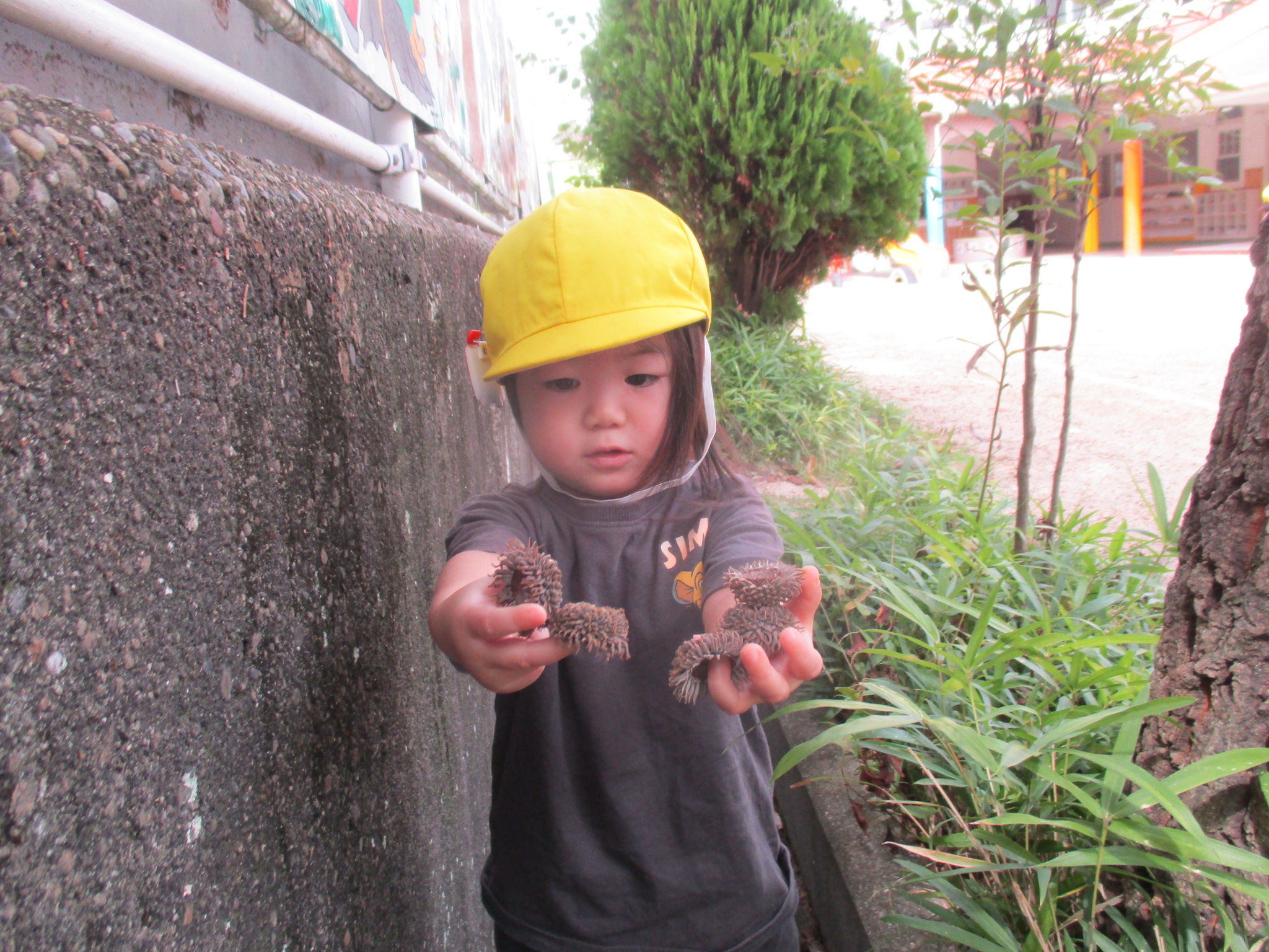 日中は太陽の日差しもあり暑い日が続いていますが、園庭で秋の訪れを子どもたちが見つけていました!!