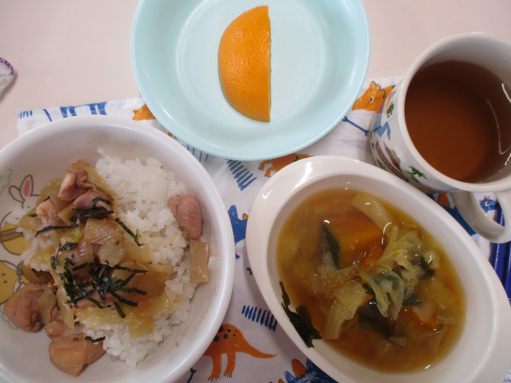 今日の給食は焼き鳥ごはん・味噌汁・オレンジでした。