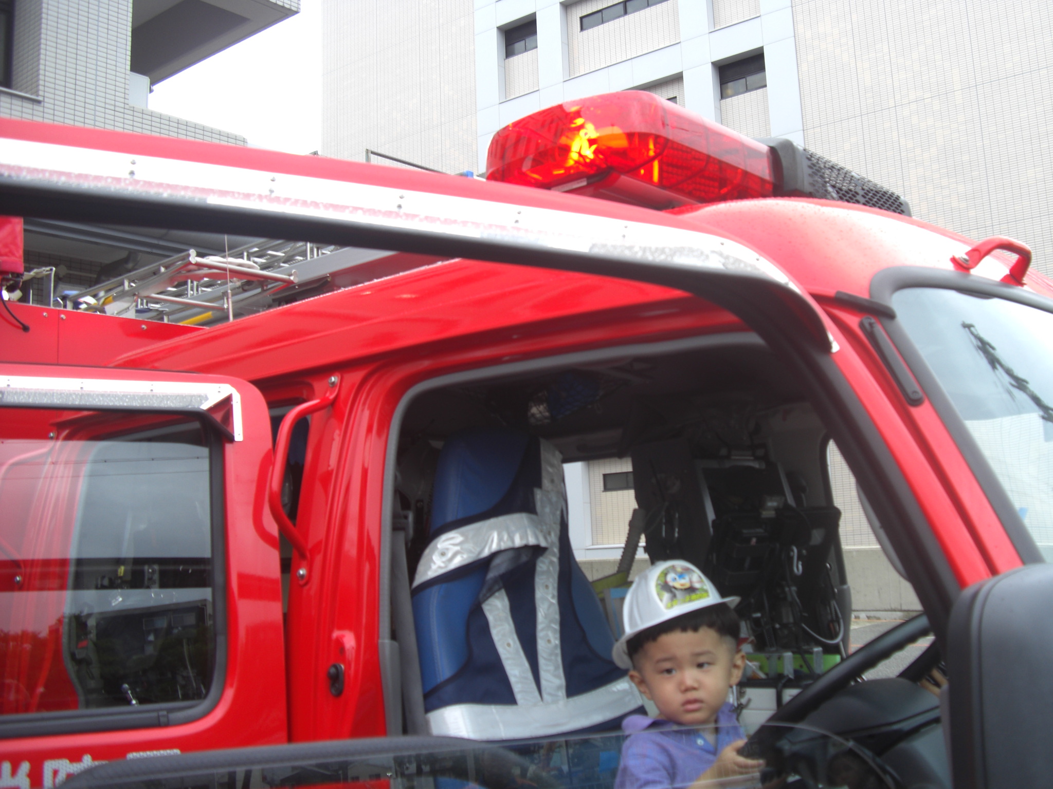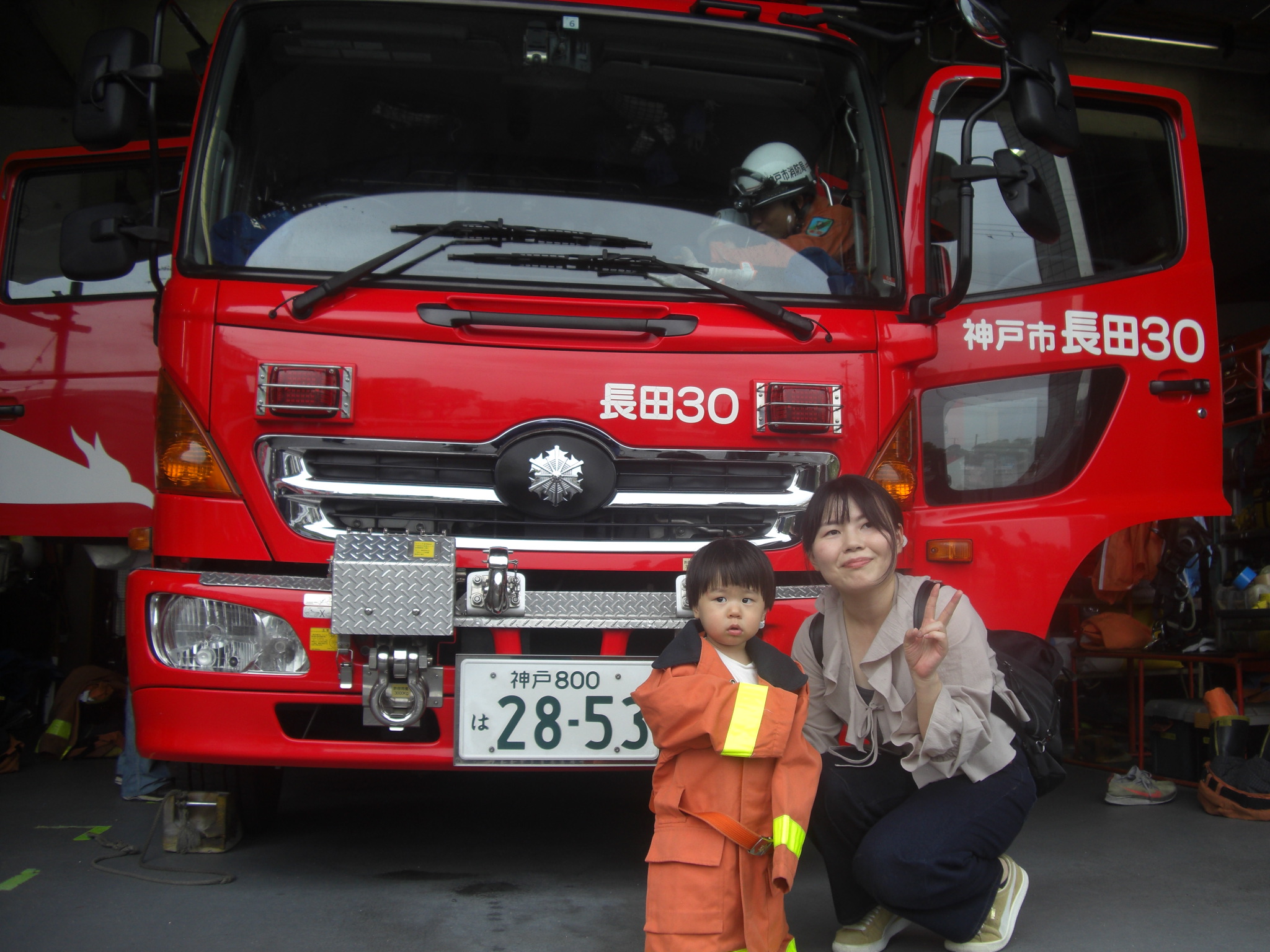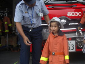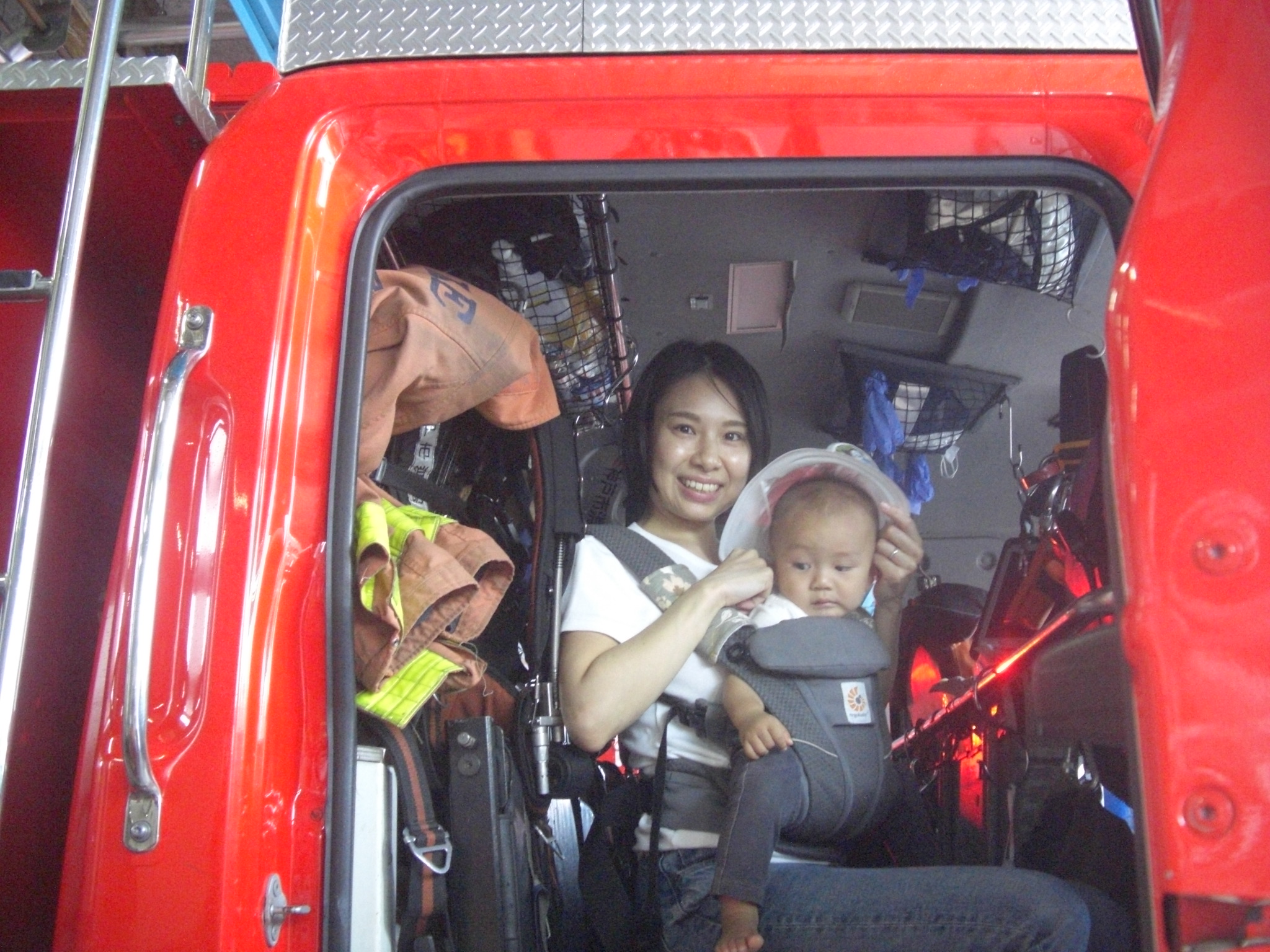 2種類の消防車が停まっていましたが、どちらも乗って良いよ!と言って頂き、運転席にのせてもらったり、前で写真を撮ったり、初めての経験に親子でワクワク♪♪キッズサイズの消防服も用意して下さっていて、みんなで順番に消防士に変身しました♡ちょっぴりぶかぶかの消防服が、みんなとーっても可愛かったです♡