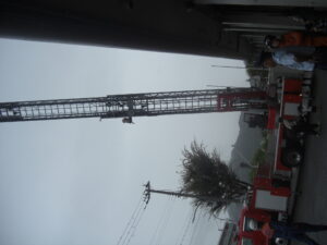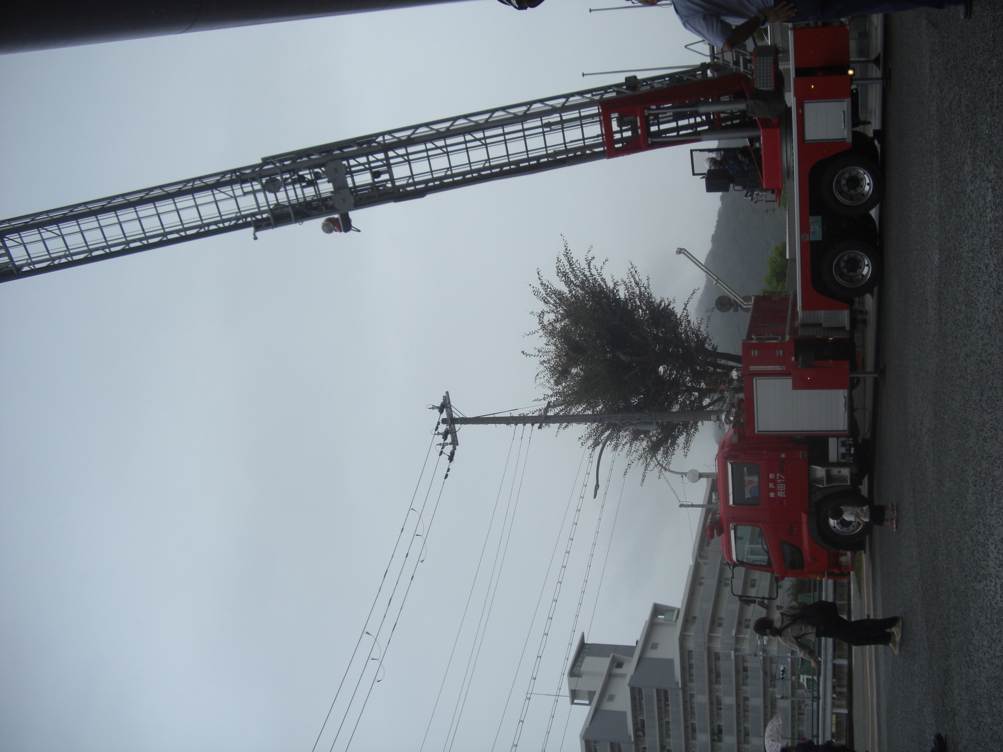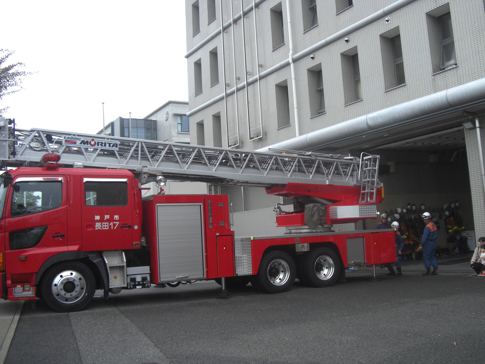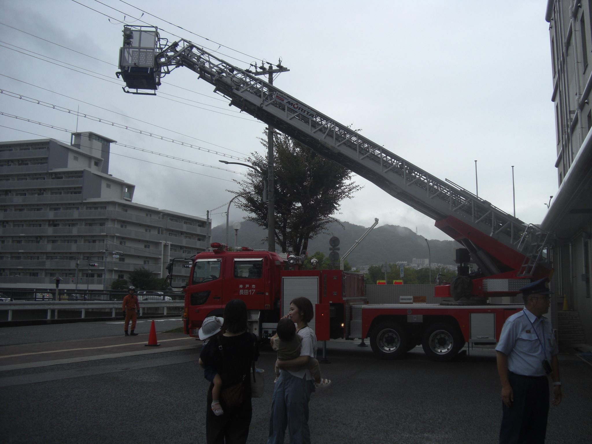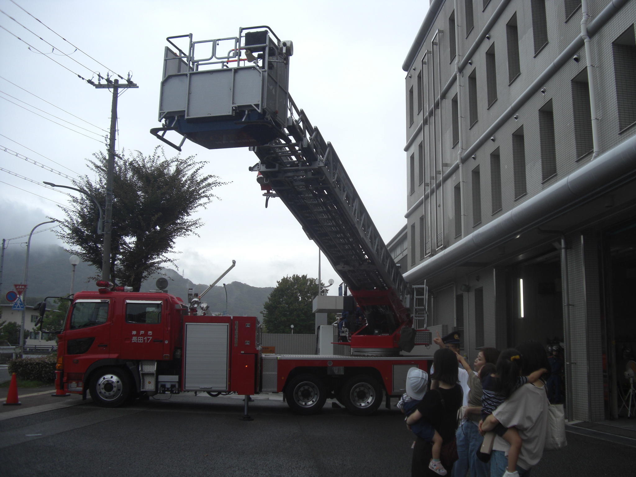 そして、最後にははしご車のはしごも出してもらって、長くたかーーく伸びるはしごにみんなびっくり!!はしごにも乗せてもらって写真をパシャリ♬