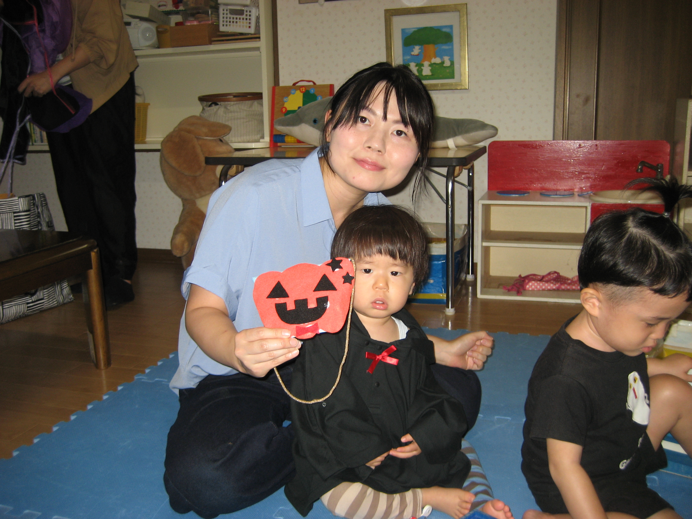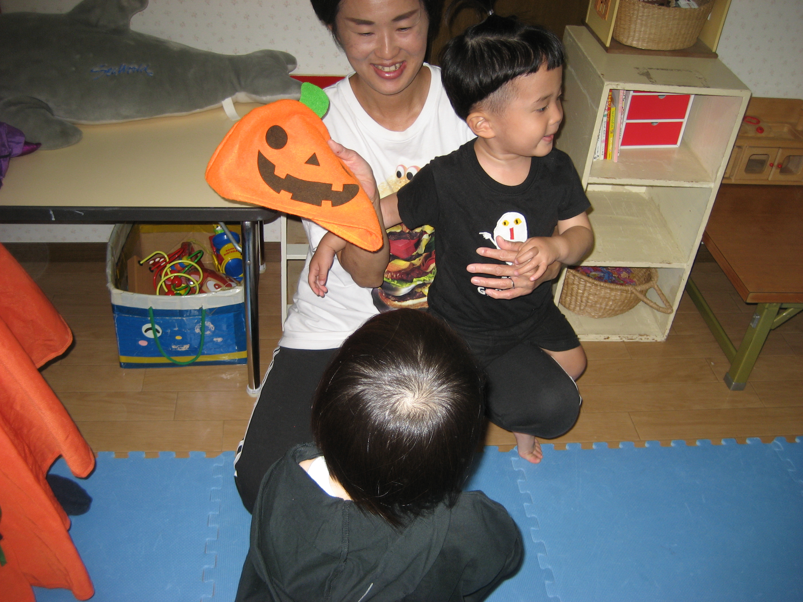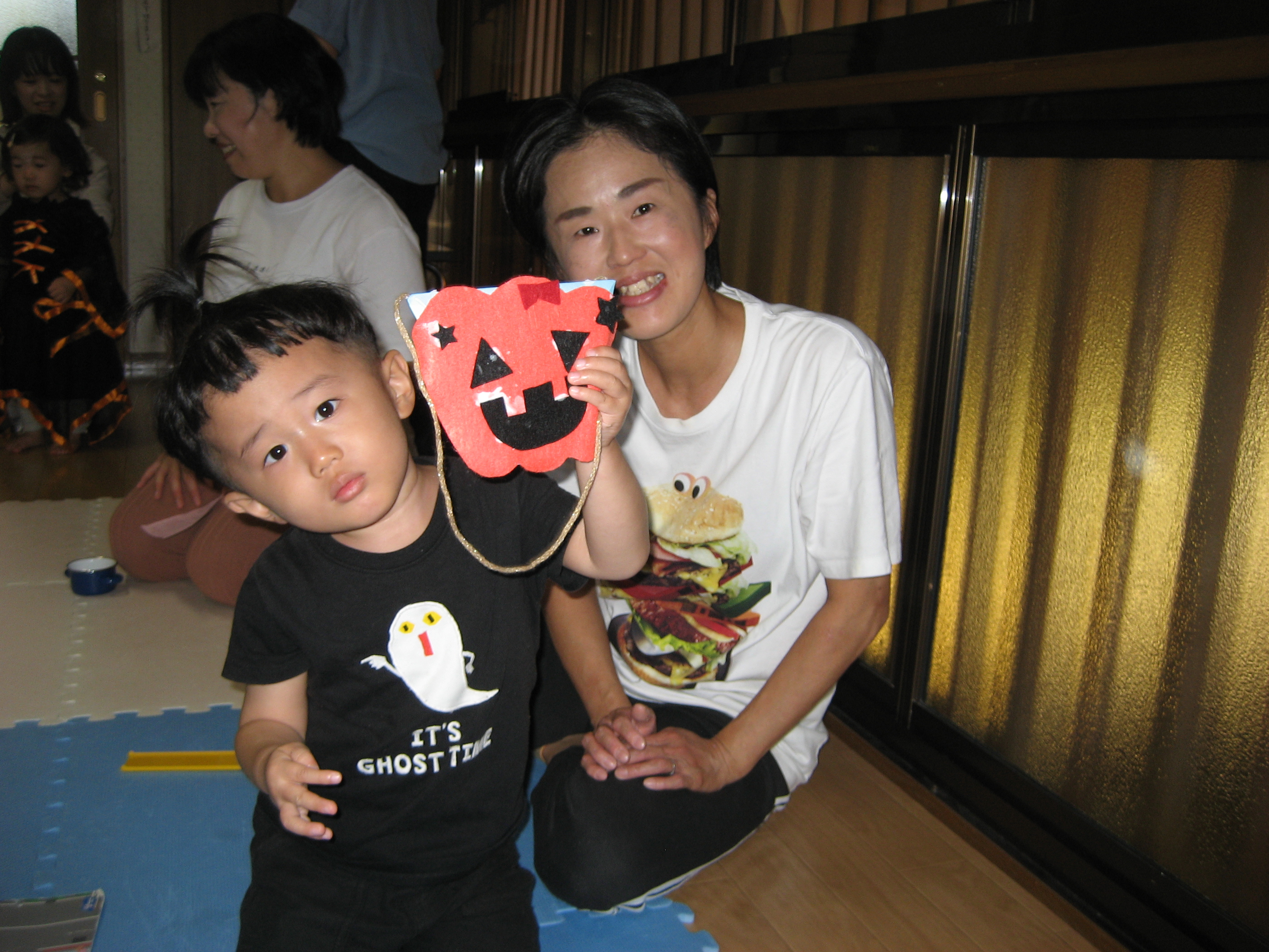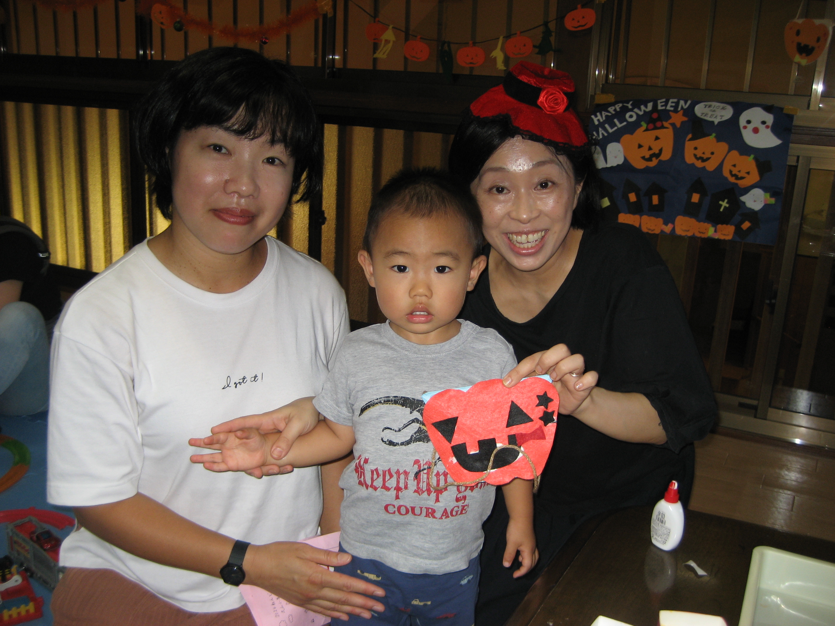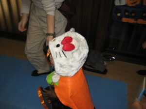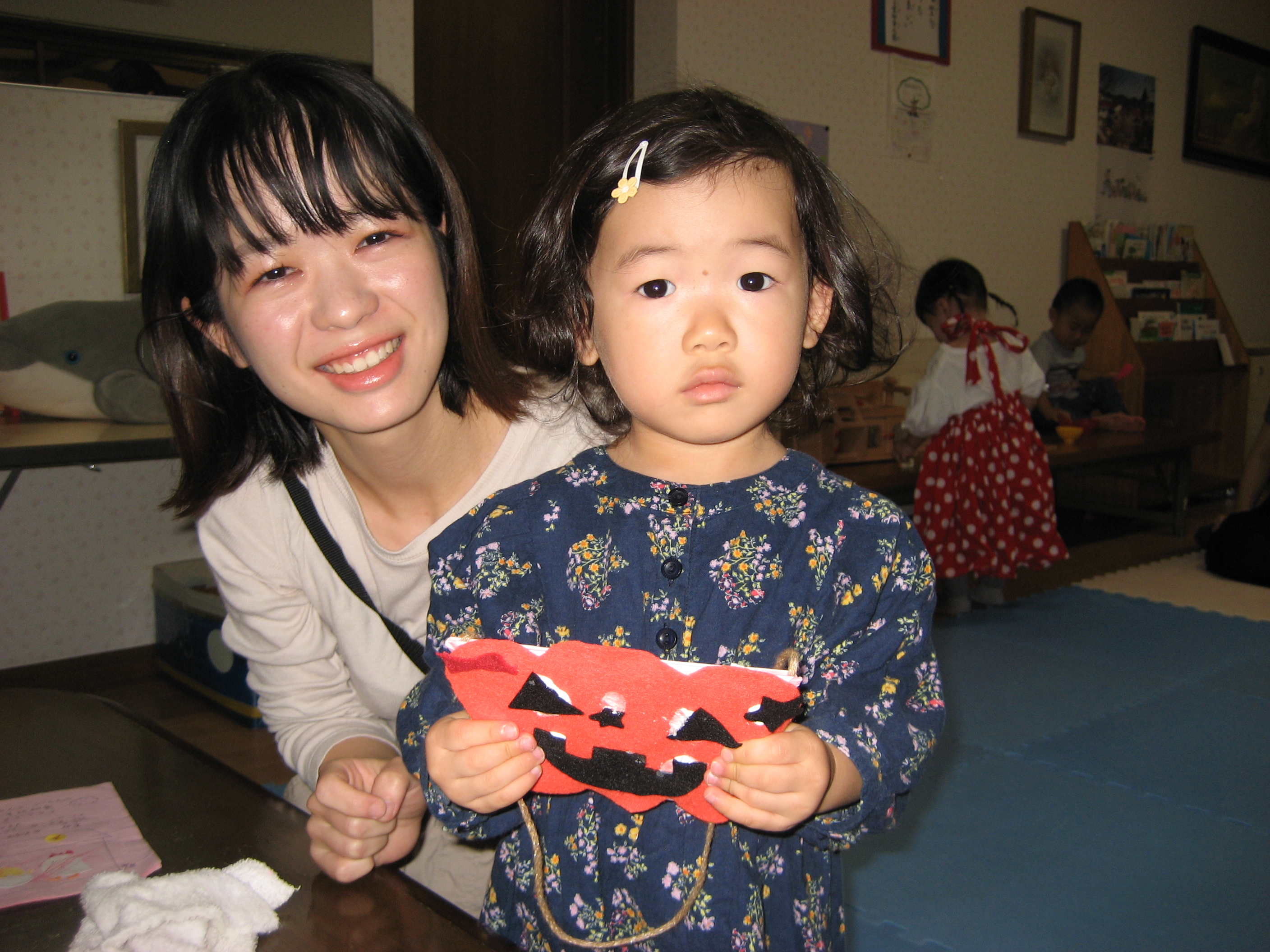 続いて☆☆ハロウィンパーティー運動会ごっこ♡パンプキンメダルバックをつくりました♡♡お目め&お口&星&リボンを、ぴったんこ☆☆とっても可愛いパンプキンメダルバック☆☆の完成♡ハロウィン運動会は、ハロウィンパーティー♬ダンスを、とっても上手に踊りました♬マントを繋いでよーいドン☆☆も、みんなとっても可愛いくて、、、♡♡笑顔いっぱいのハロウィン運動会ごっこができました♡♡頑張ったママ&子どもたちには、ハロウィンおやつのプレゼント♡ハロウィン金メダルバックに入れて♡嬉しそうな笑顔に、先生たちは、いっぱい♡癒されました~♡♡いつもありがとう♡♡