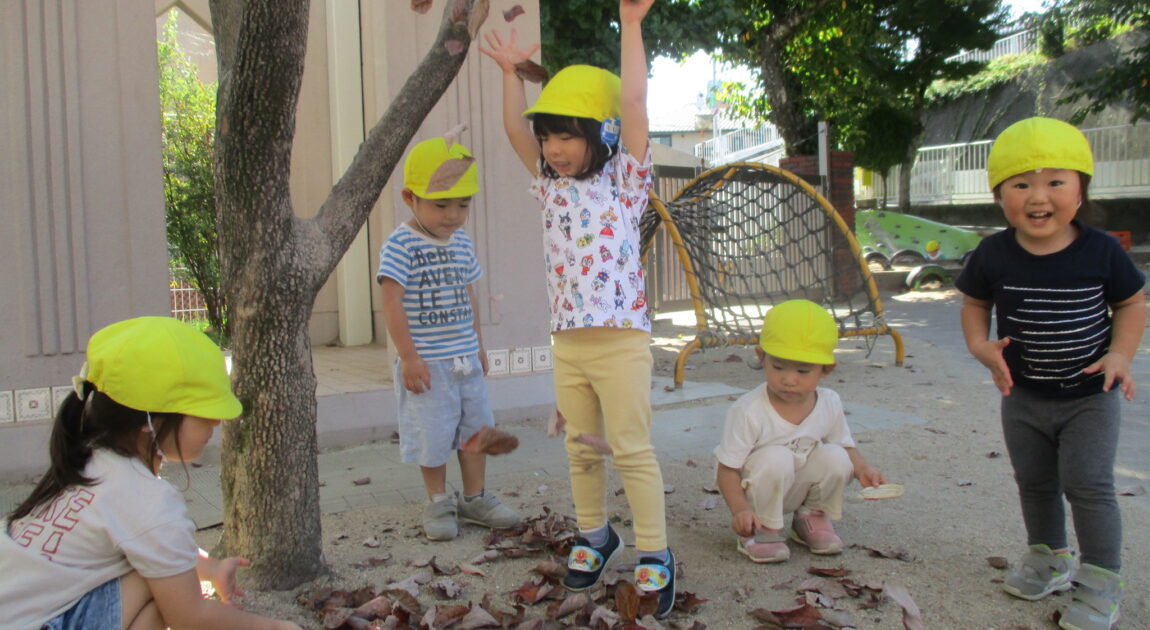 お外ではたくさんの落ち葉を集めて「ぱらぱら~」と上から落としていたり、ごっこ遊びで葉っぱのお金を使っていたりして秋の自然を楽しでいる子どもたち😊