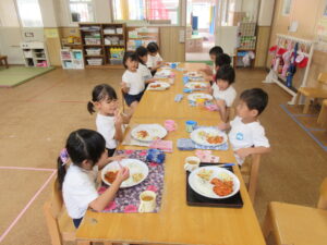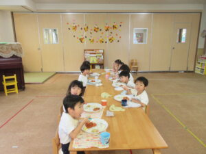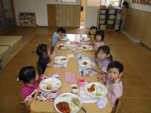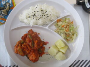 今日の給食はご飯・トマト煮・胡麻和え・小吹芋でした。