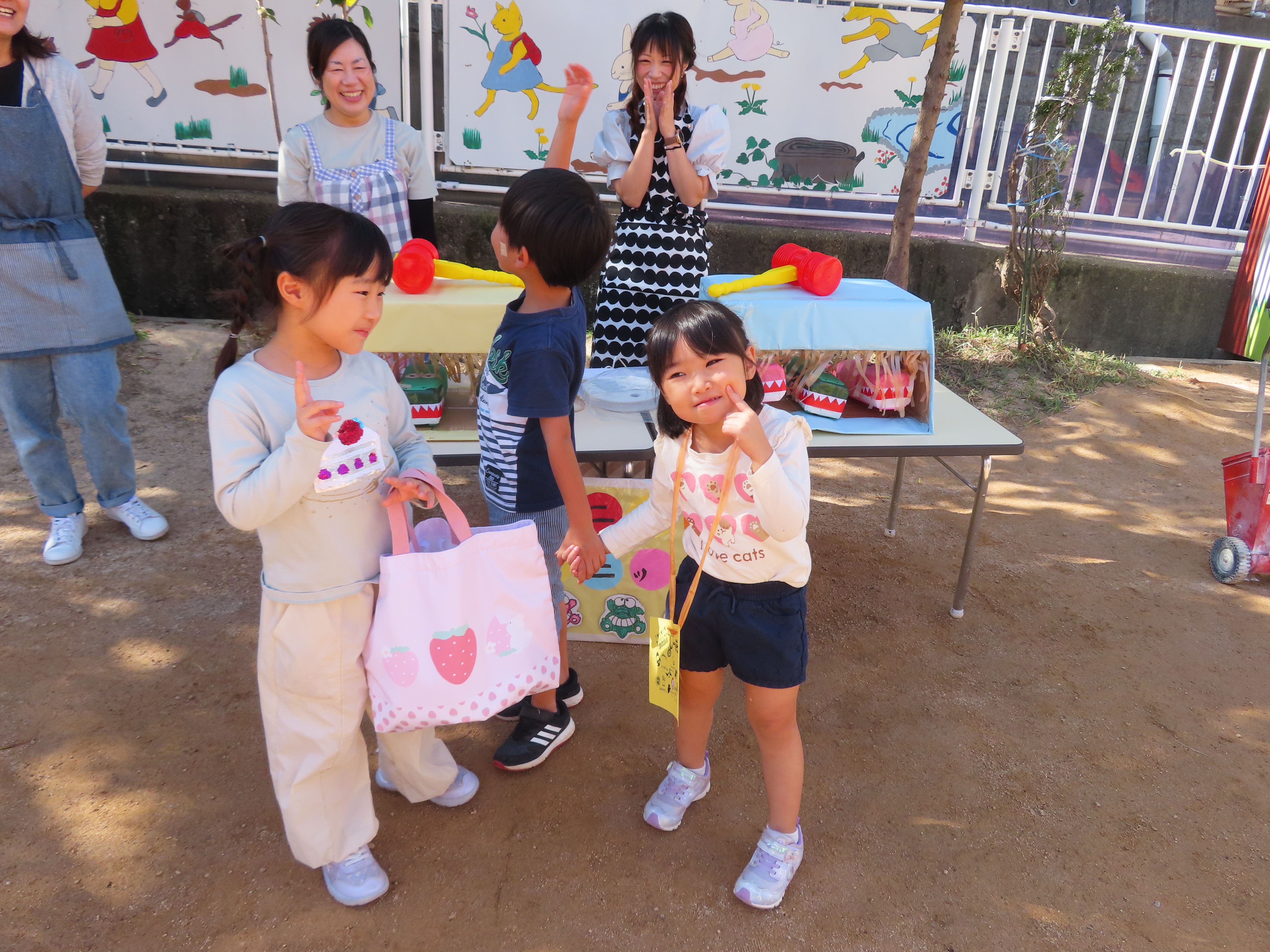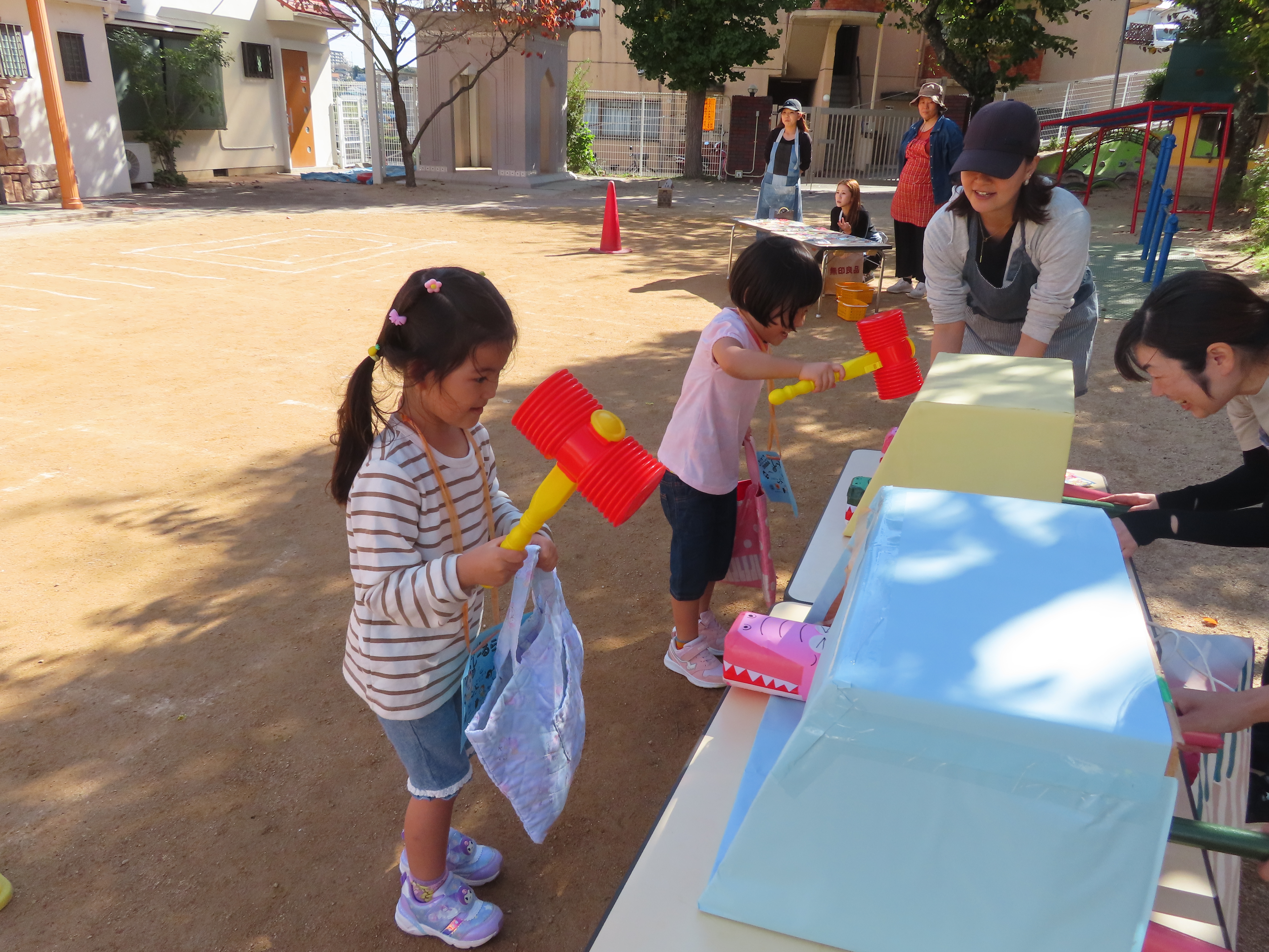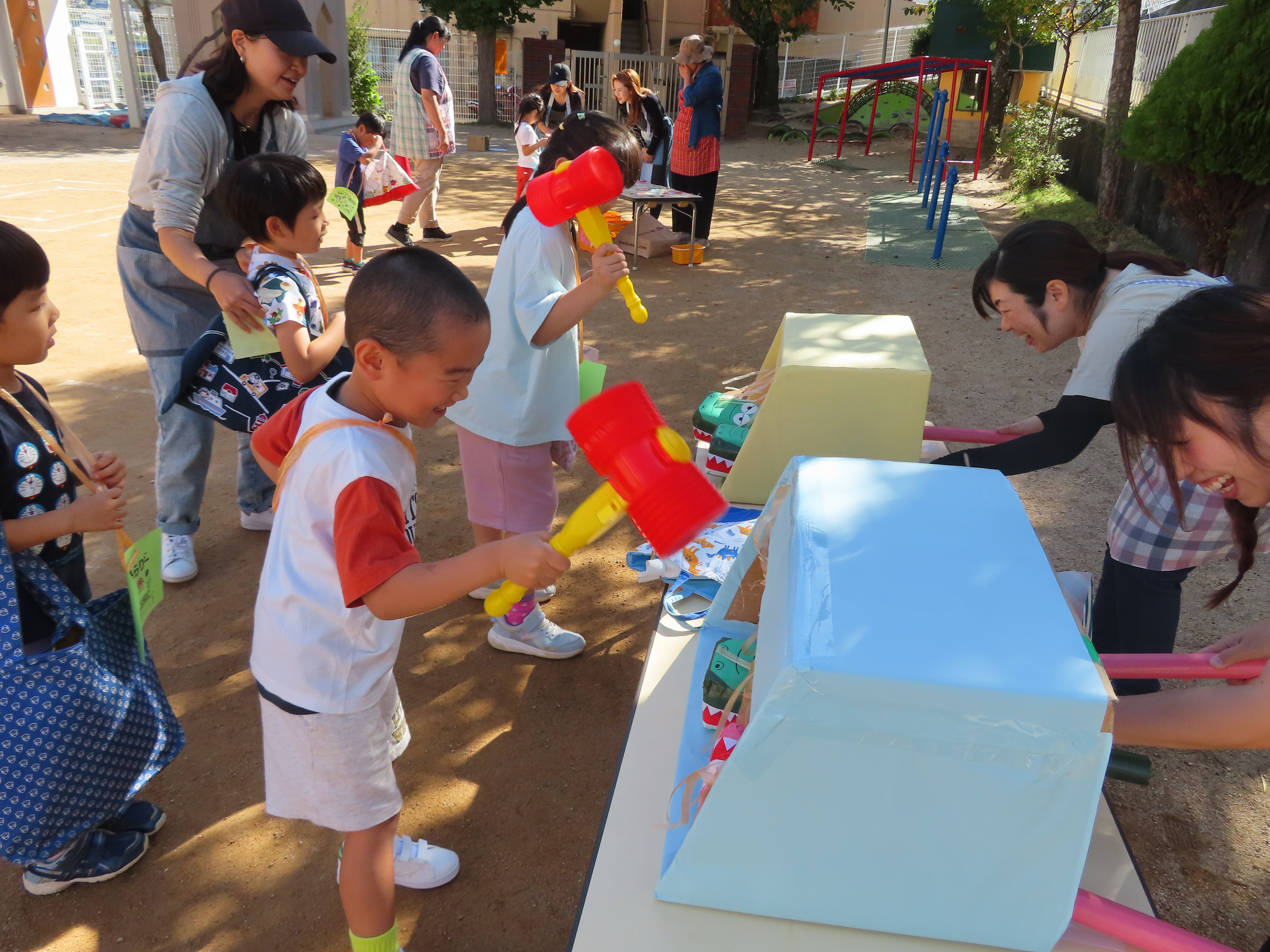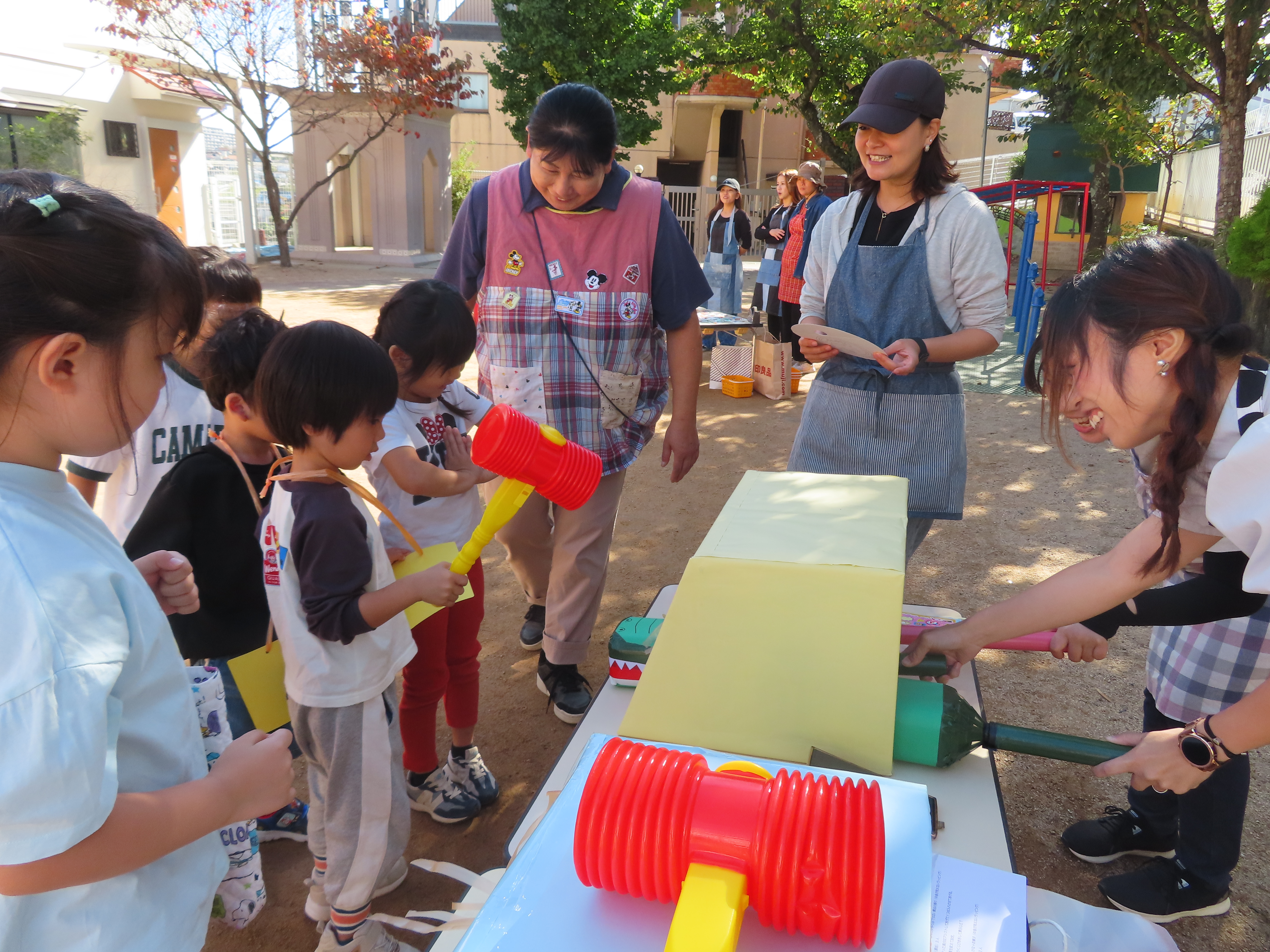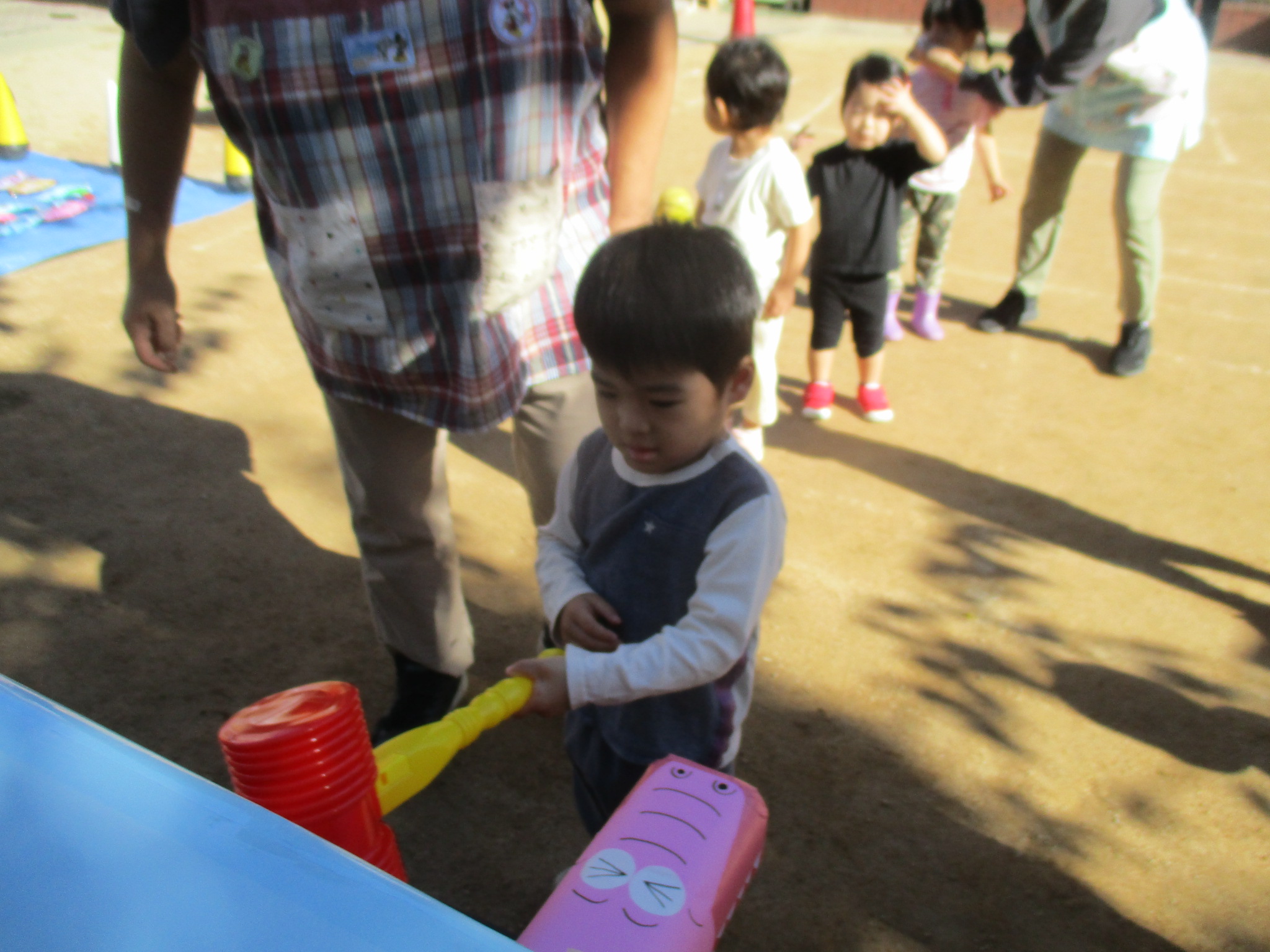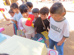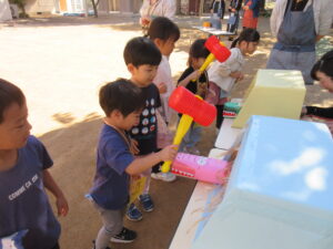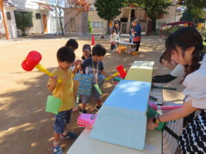 お買い物ではお買物券を一枚一枚渡し商品と交換していたり、わにわにぱにっくでは力いっぱい叩く様子が見られました(^^♪