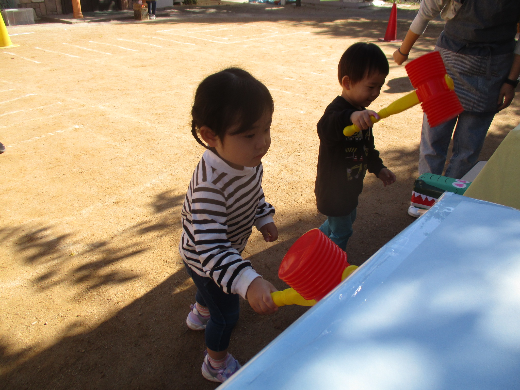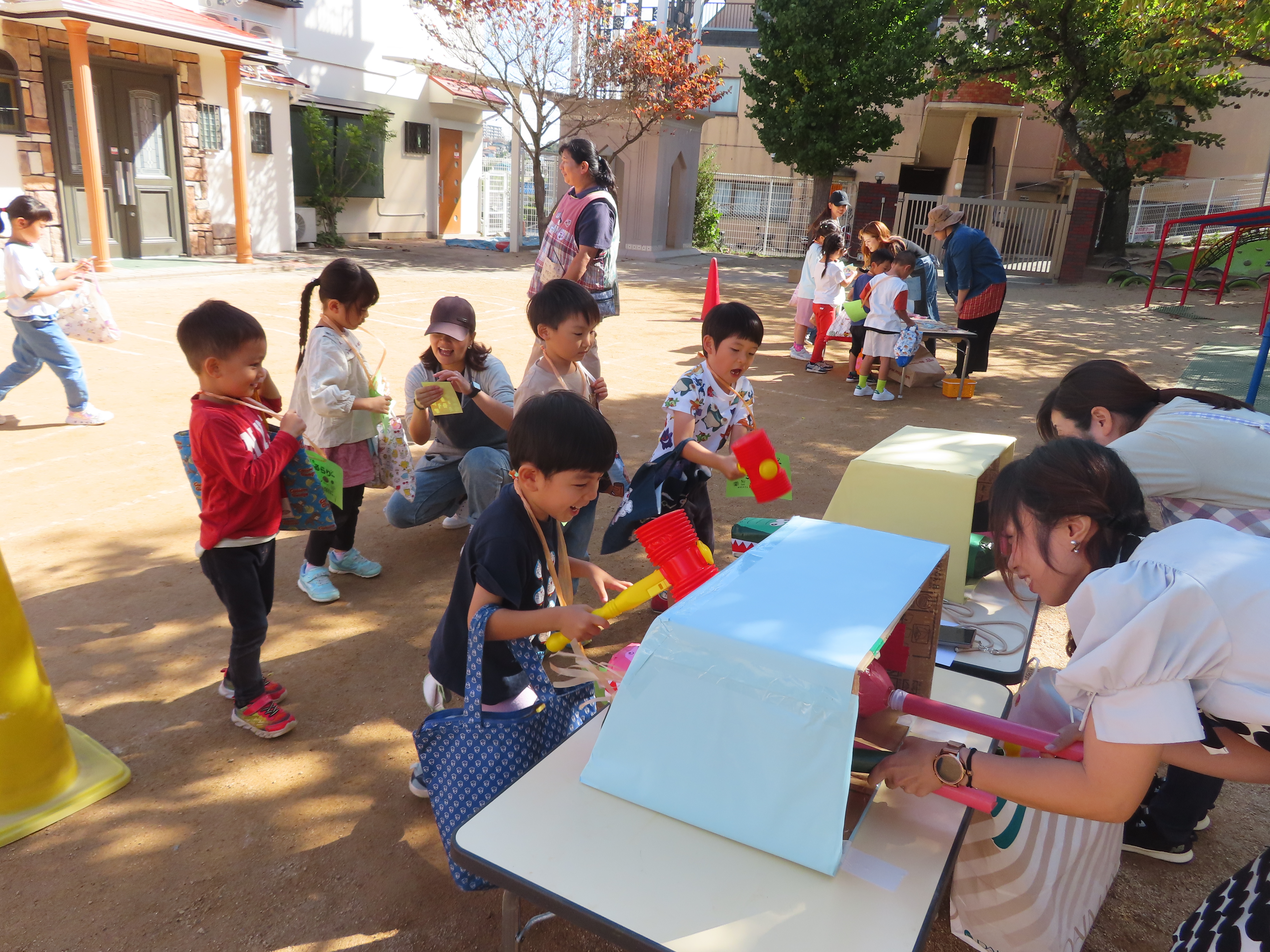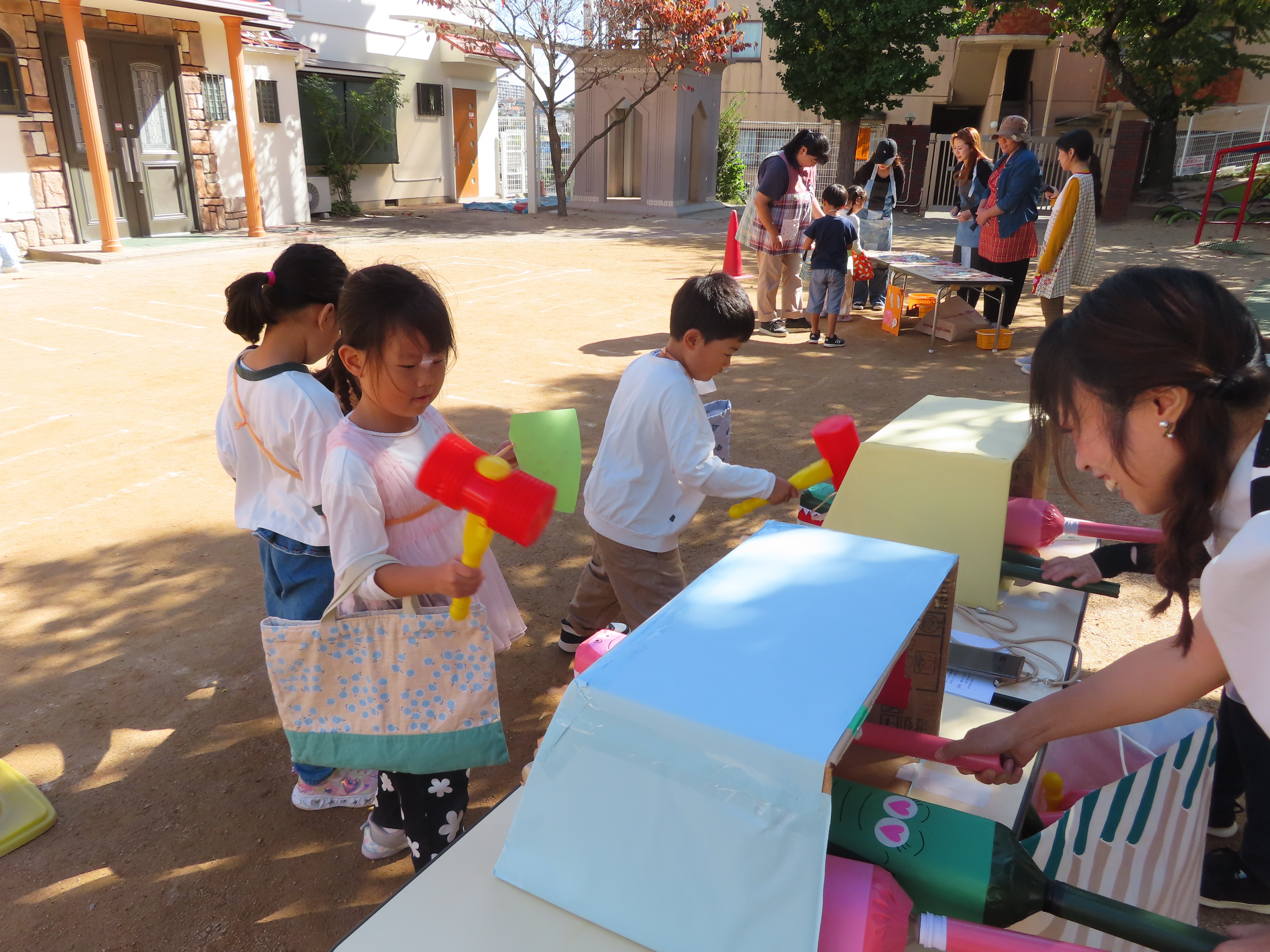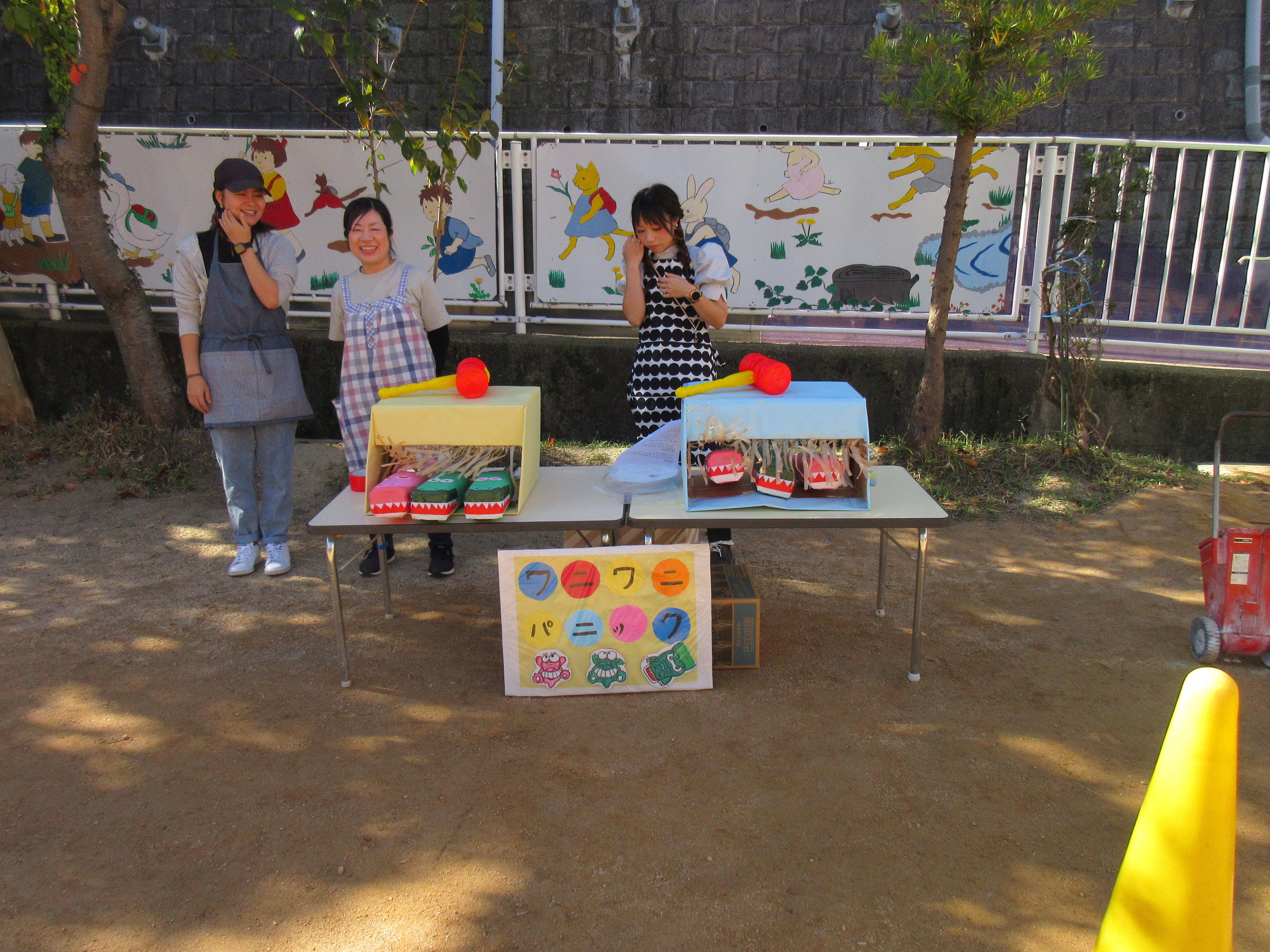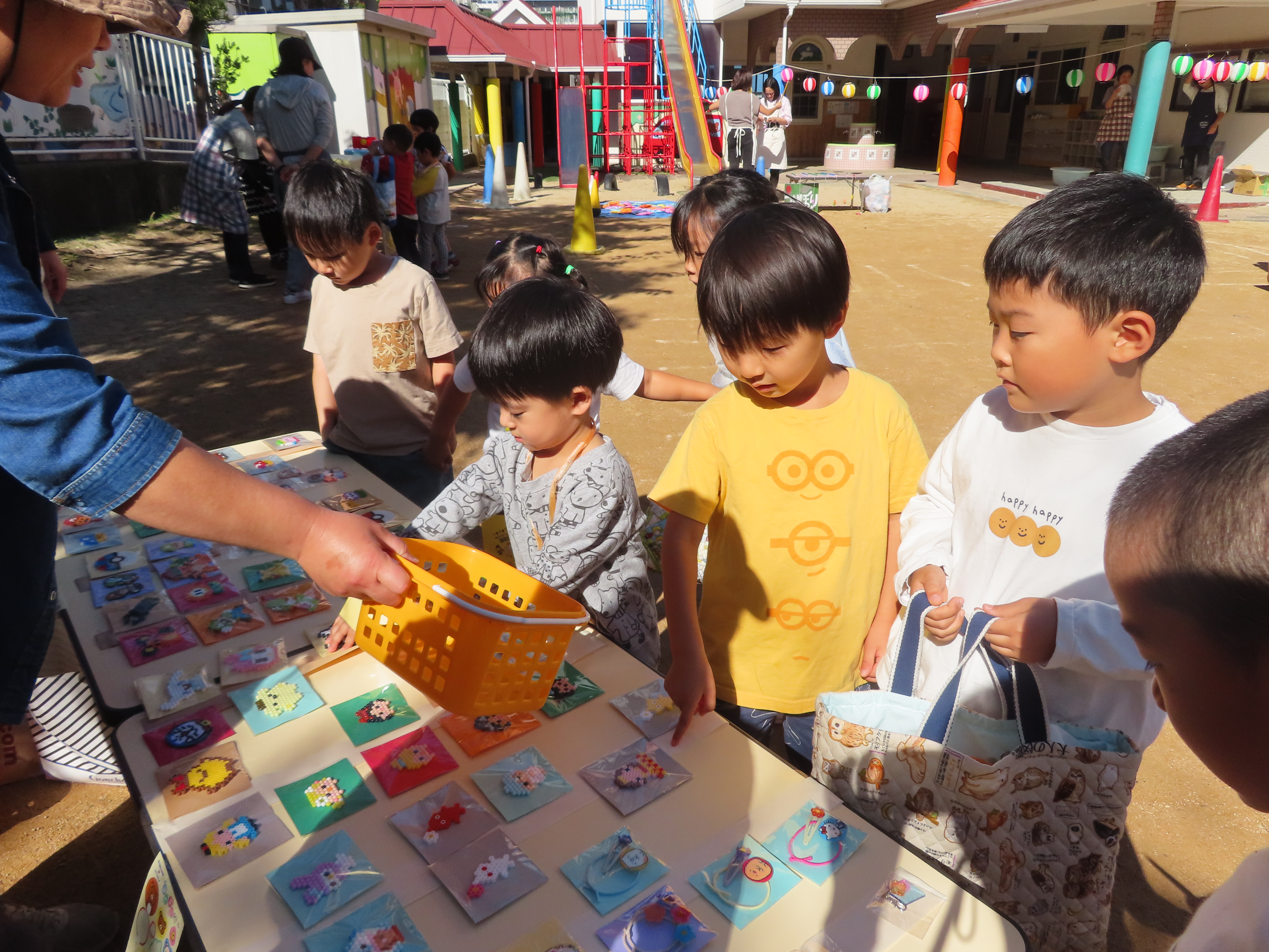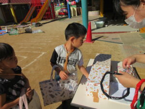 お買い物ではお買物券を一枚一枚渡し商品と交換していたり、わにわにぱにっくでは力いっぱい叩く様子が見られました(^^♪